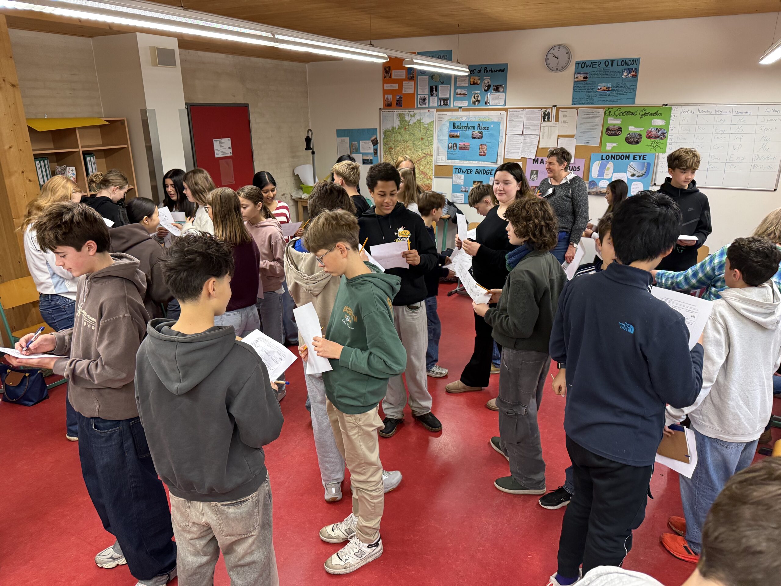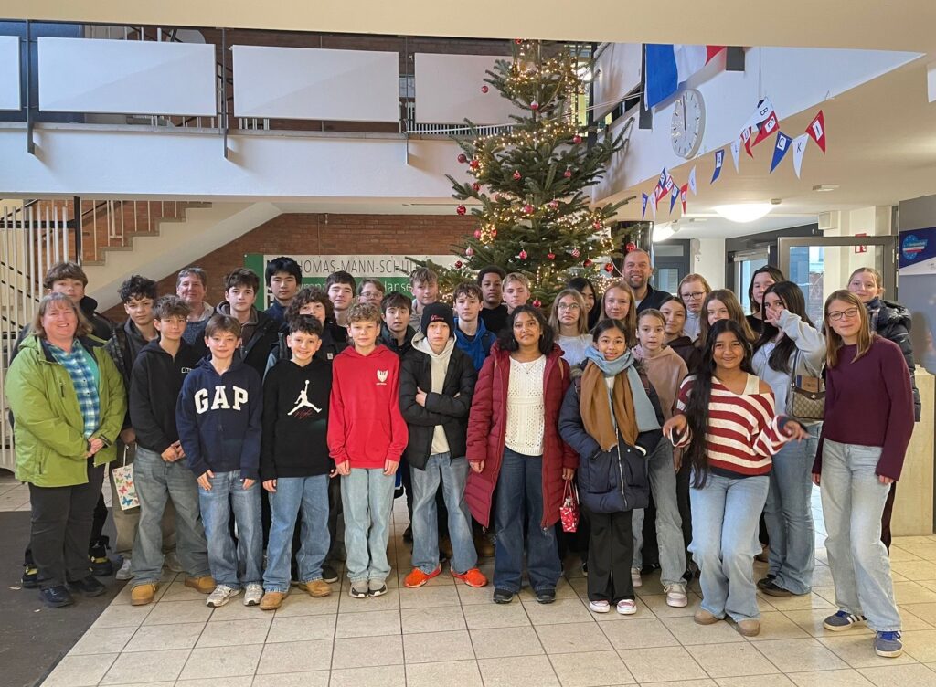 Am Freitag, den 28.11. besuchten uns dann abschließend unsere Briefreunde der CIS zusammen mit ihrer Deutschlehrerin Frau Helmich sowie der stellvertretenden Schulleiterin Frau Mc Gregor an der TMS. Da der Termin schon lange feststand und leider auf unseren beweglichen Ferientag fiel, mussten wir ein wenig improvisieren, um den Besuch an einer „Schule ohne Schüler“ so interessant wie möglich zu gestalten. Besonders hervorzuheben ist hier vor allem das Engagement der 7d. Für die gesamte Klasse war es selbstverständlich, dass sie -soweit sie Zeit hatten- an ihrem freien Tag zur TMS kommen würden, inklusive diverser weihnachtlicher Leckereien und Kinderpunsch im Gepäck. Einfach klasse!!!