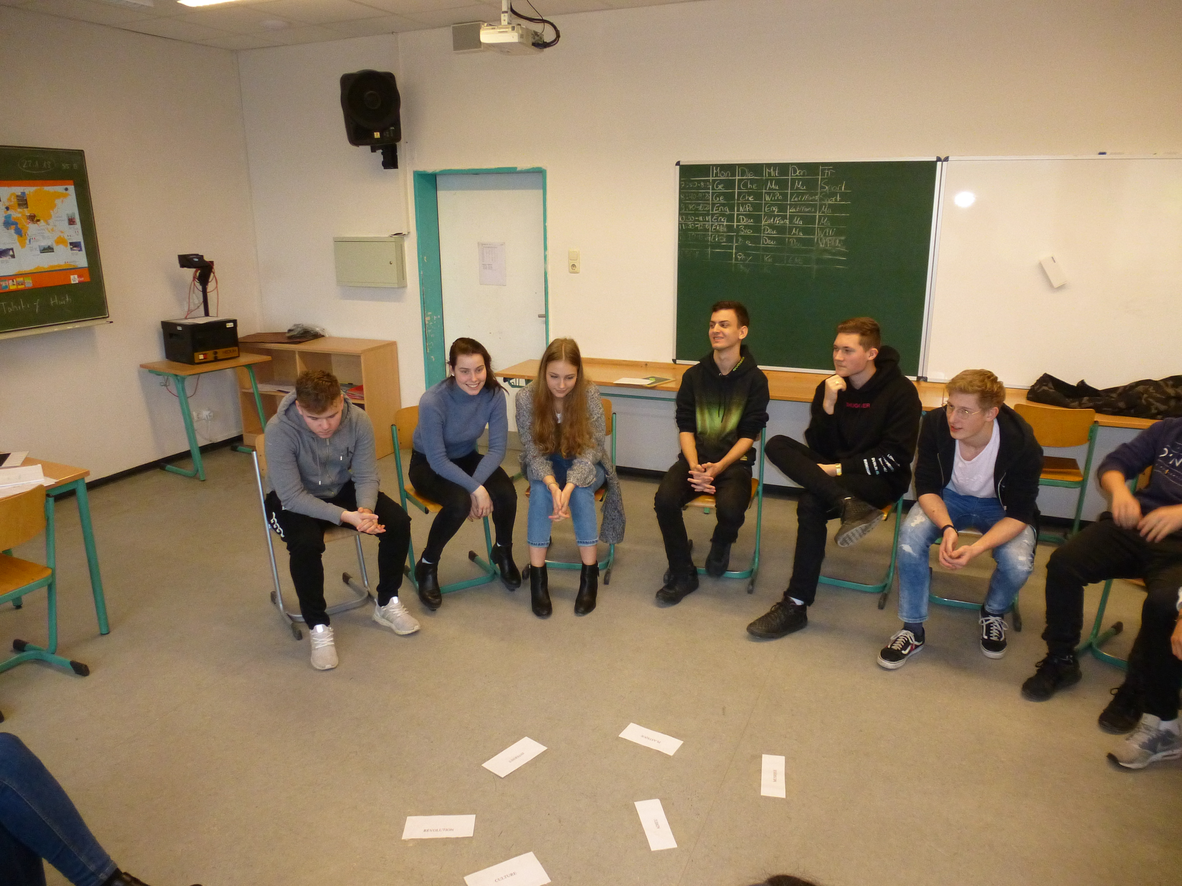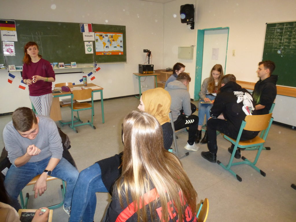 Cyrielle sprach nur Französisch mit ihnen, aber auf eine so ansprechende Weise, dass die Schülerinnen und Schüler alles verstanden. Nach einer Kennlernrunde wurden die Klassen in Gruppen aufgeteilt und mussten in verschiedenen Spielrunden gegeneinander antreten. Es ging um frankophone Länder, um Schätzfragen (wie viele Menschen sprechen Französisch auf der Welt – ungefähr 274 Millionen) oder darum, welche vermeintlich typisch französischen Spezialitäten oder Gebäude oder Sportler etc. wirklich französisch sind (das Croissant zum Beispiel kommt aus Österreich, haben wir gelernt). Als Letztes sollten die Gruppen möglichst schnell Wörter in angespielten französischen Liedern heraushören. Vor allem dieses Spiel machte allen viel Spaß.