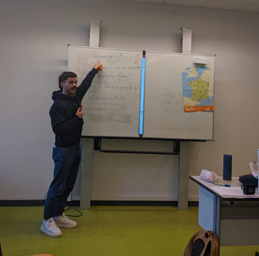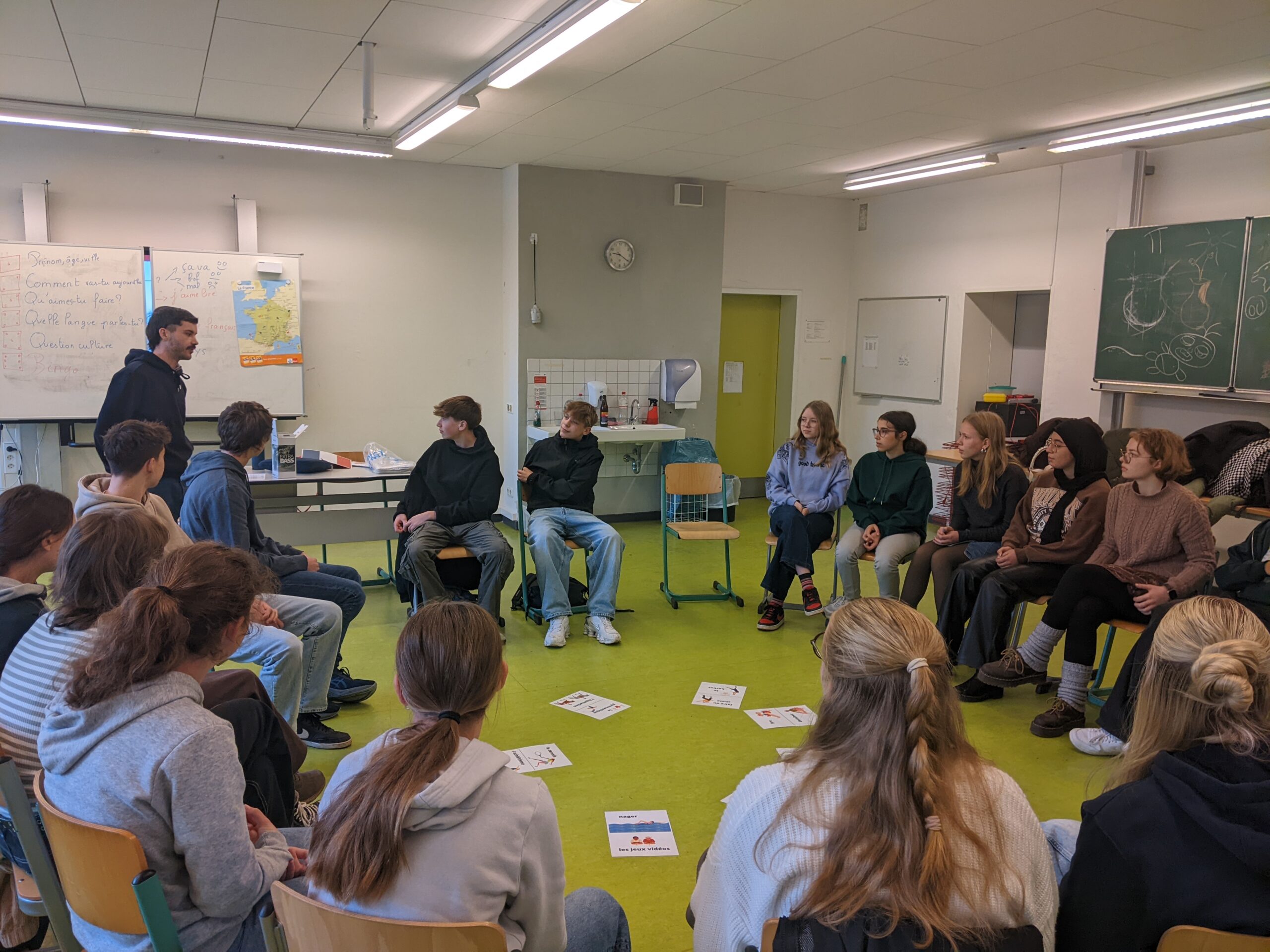 Schließlich hat Adrien Cauchois auf Deutsch die Mobilitätsprogramme Voltaire und Brigitte Sauzay vorgestellt. Dementsprechend hat er uns seine eigenen Erfahrungen zum Thema Austausch mitgeteilt und uns empfohlen, später in Frankreich oder anderen europäischen Ländern zu studieren.
