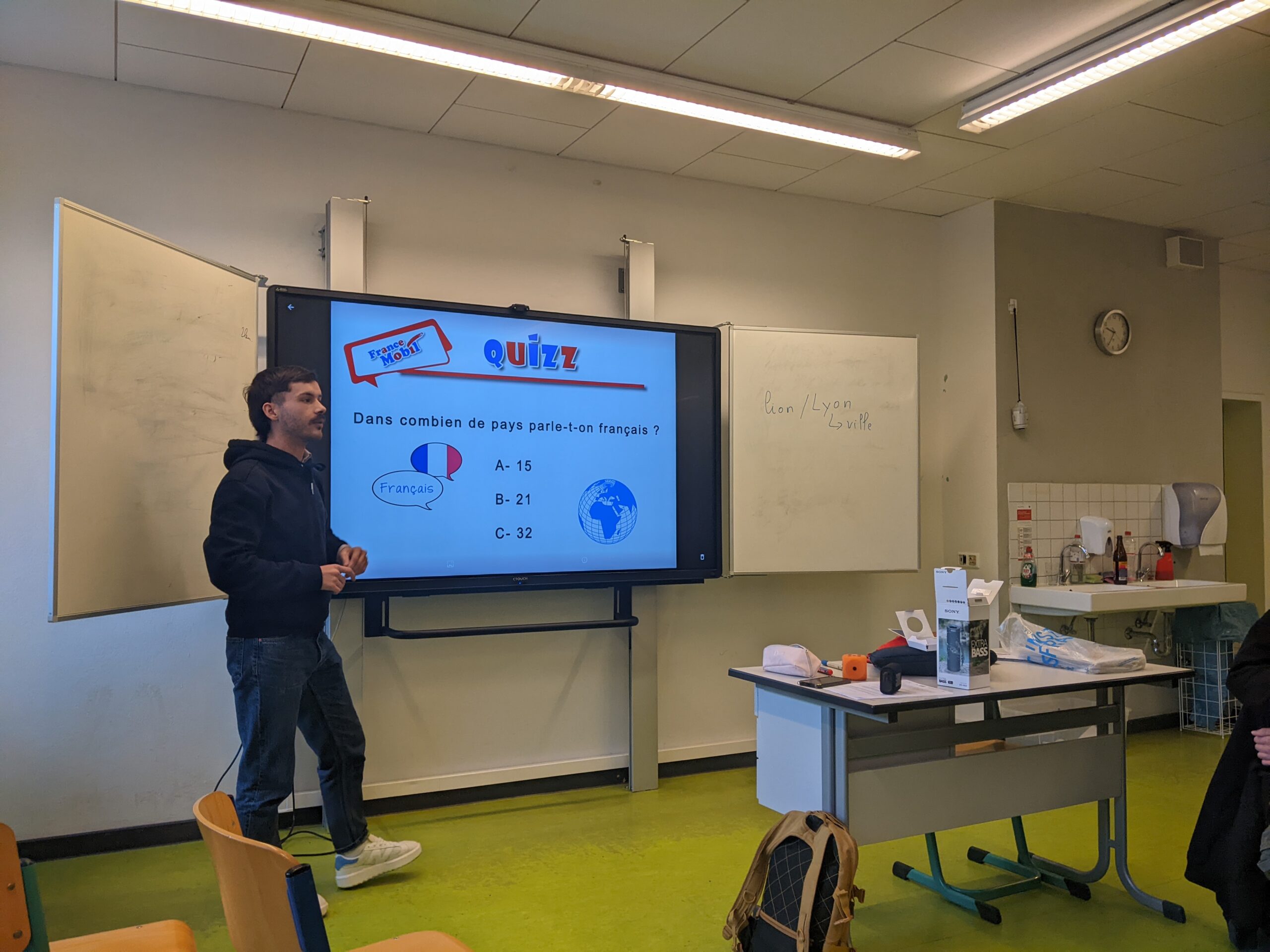 Am Freitag, dem 3.11.2023, begann um 9 Uhr die 45-minütige Animation (der 9a/9b) mit einer Begrüßung des Lektors Adrien Cauchois. Er bereitete ein Würfelspiel vor, in dem wir Fragen zum Kennenlernen auf Französisch beantwortet haben. Dadurch haben sich viele von uns getraut, Französisch zu sprechen.