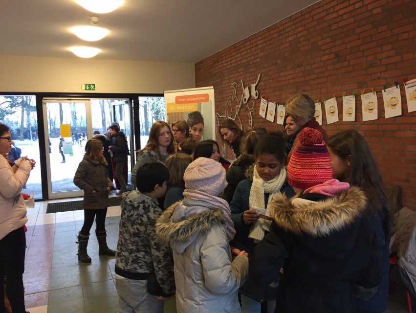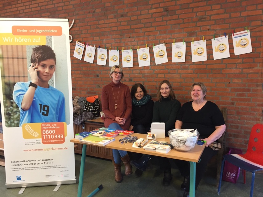 In beiden großen Pausen hatten die Schülerinnen und Schüler die Gelegenheit, sich über das kostenlose Beratungsangebot der „Nummer gegen Kummer“ zu informieren. Viele Flyer und Broschüren wurden mitgenommen. Die vier Beraterinnen hatten in den Pausen angesichts des Andrangs gut zu tun und führten zahlreiche Gespräche.