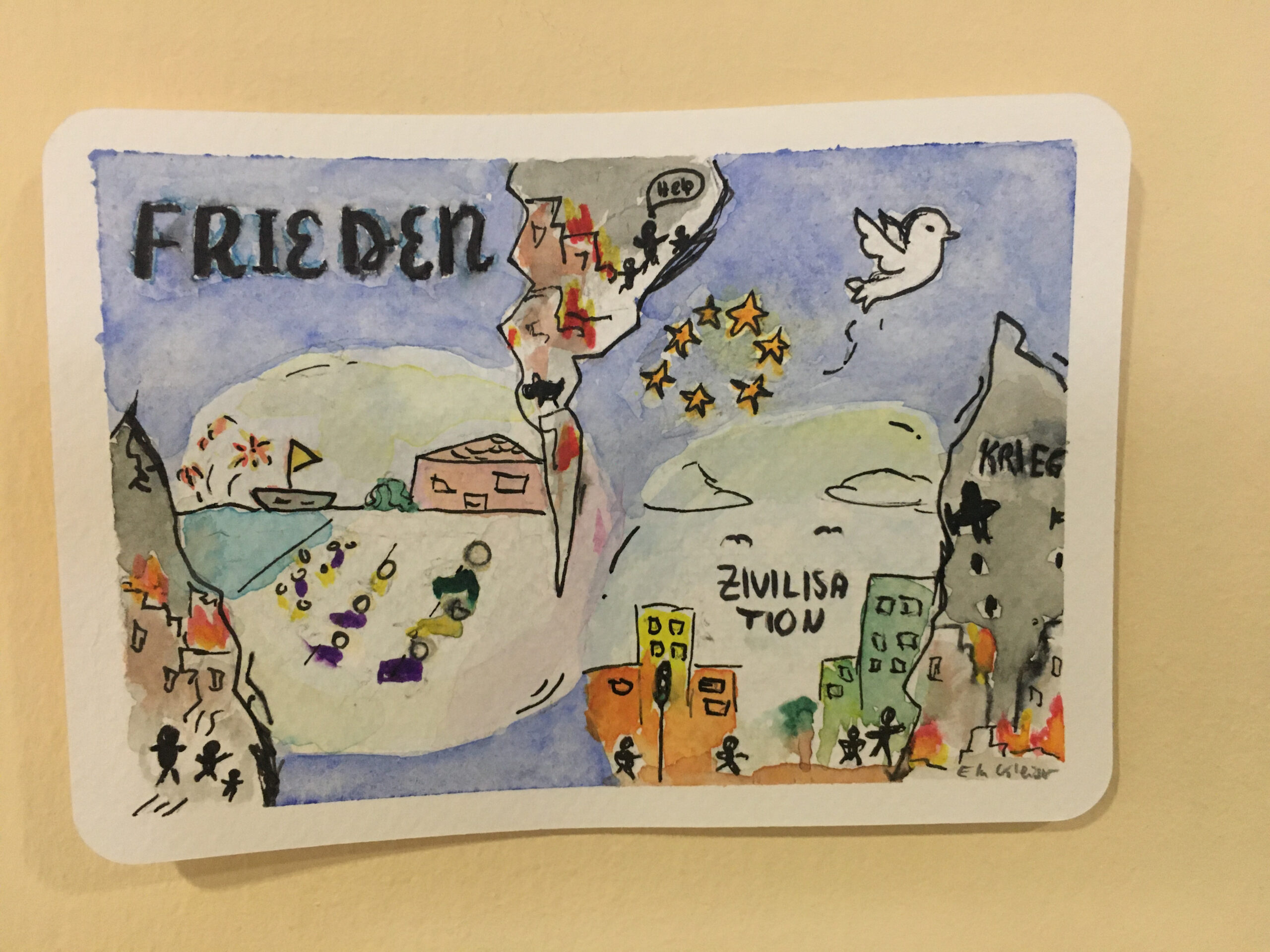 Den Donnerstag verbrachten wir schließlich mit der kreativen Verarbeitung all der Erfahrungen, die wir in den letzten Tagen gemacht hatten. In vier verschiedenen Ateliers arbeiteten wir zum Thema „Europa- gestern, heute und morgen“. Zur Wahl standen Poetry Slam, mit Aquarell gemalte Postkarten, Storytelling sowie Podcasten. Die Ergebnisse wurden am Nachmittag präsentiert und alle waren beeindruckt von der hohen Qualität für die kurze Zeit, in der sie entstanden waren.