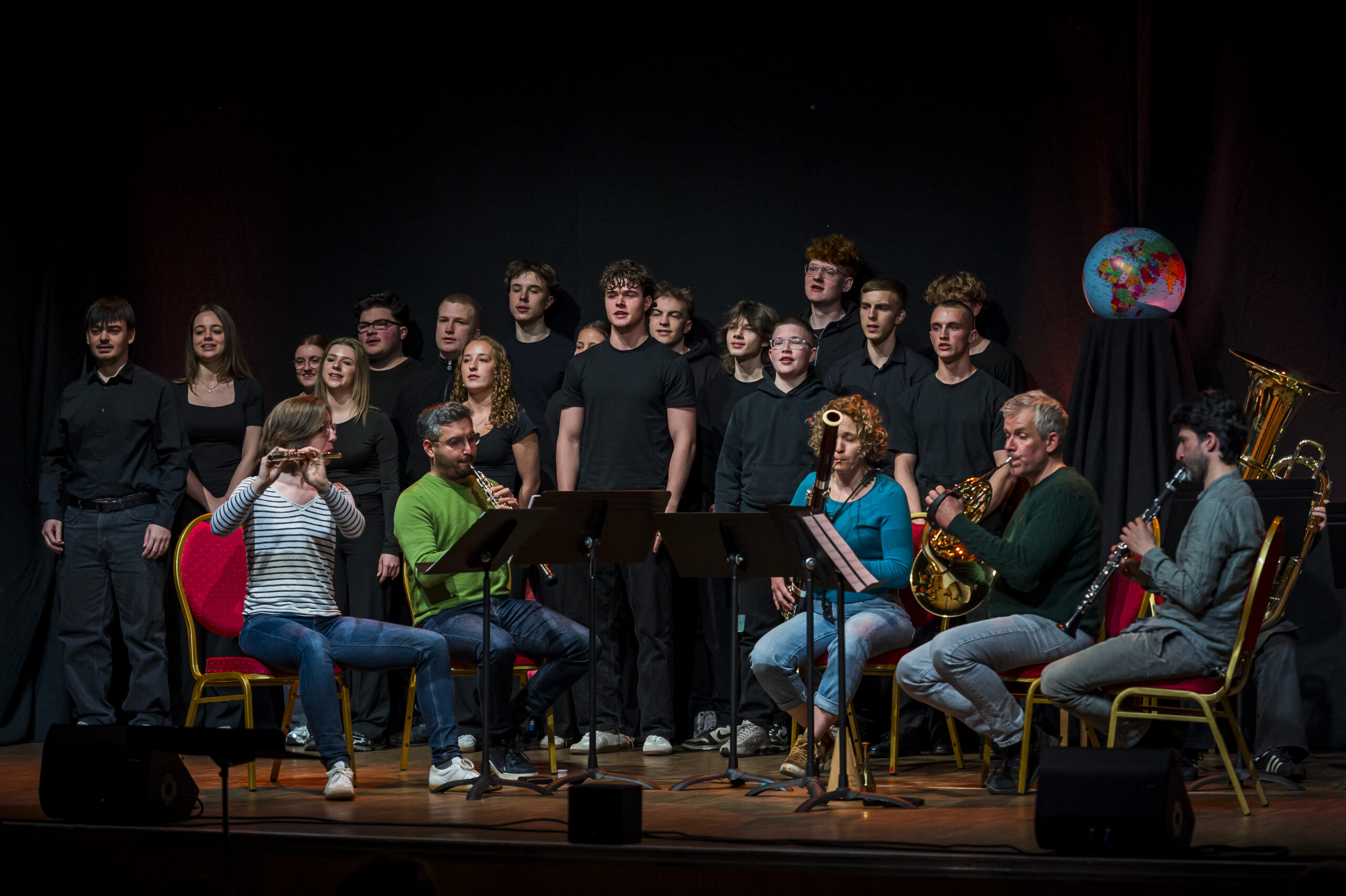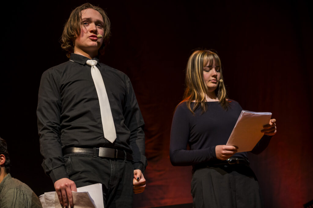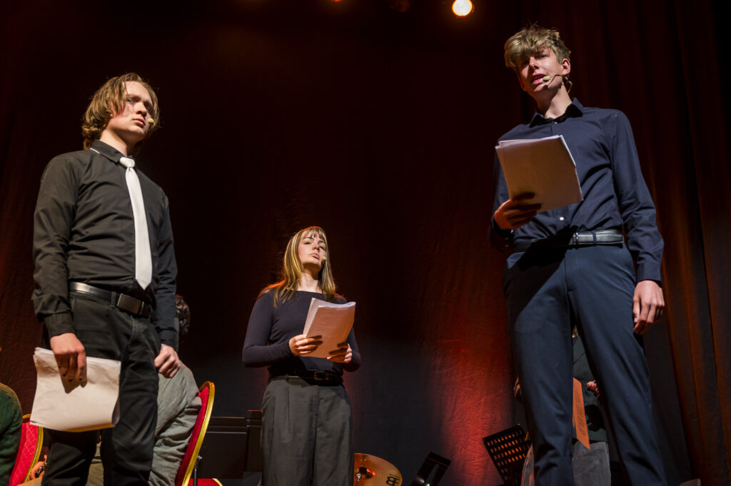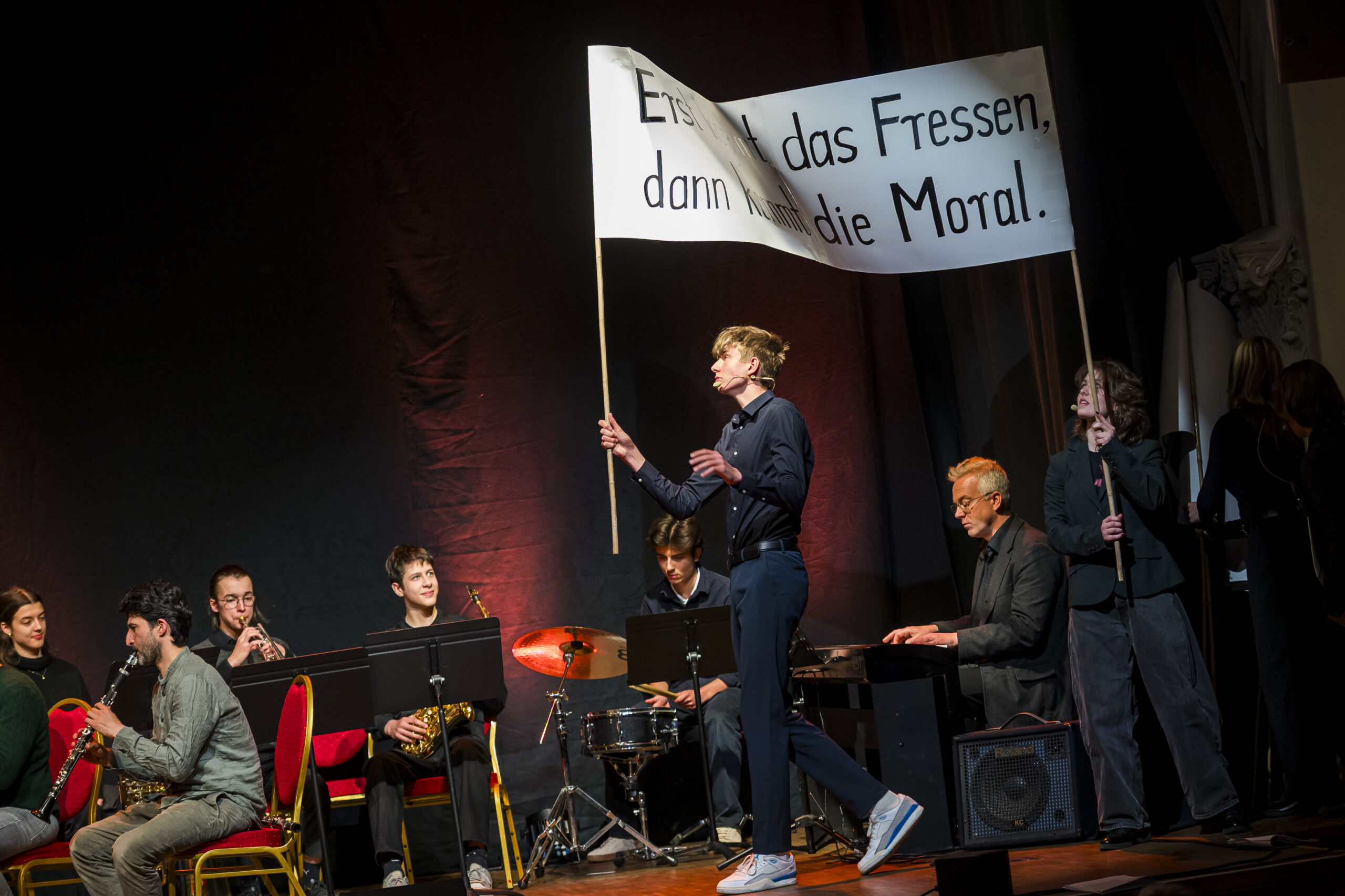 Ebenso beeindruckend war die Performance der Moritat von Macke Messer“ aus der „Dreigroschenoper“: Es sang der Musikkurs 12 unter der Leitung von Herrn Kracke, es spielten Marius Bach (Trompete), Helena Bach (Tuba), Kalle Dilling (Saxofon), Gabriel Mahdi (Schlagwerk) sowie Herr Kracke am Klavier. Schön war, dass bei diesem Stück die Musiker von OPUS 45 nach und nach mit einstiegen.