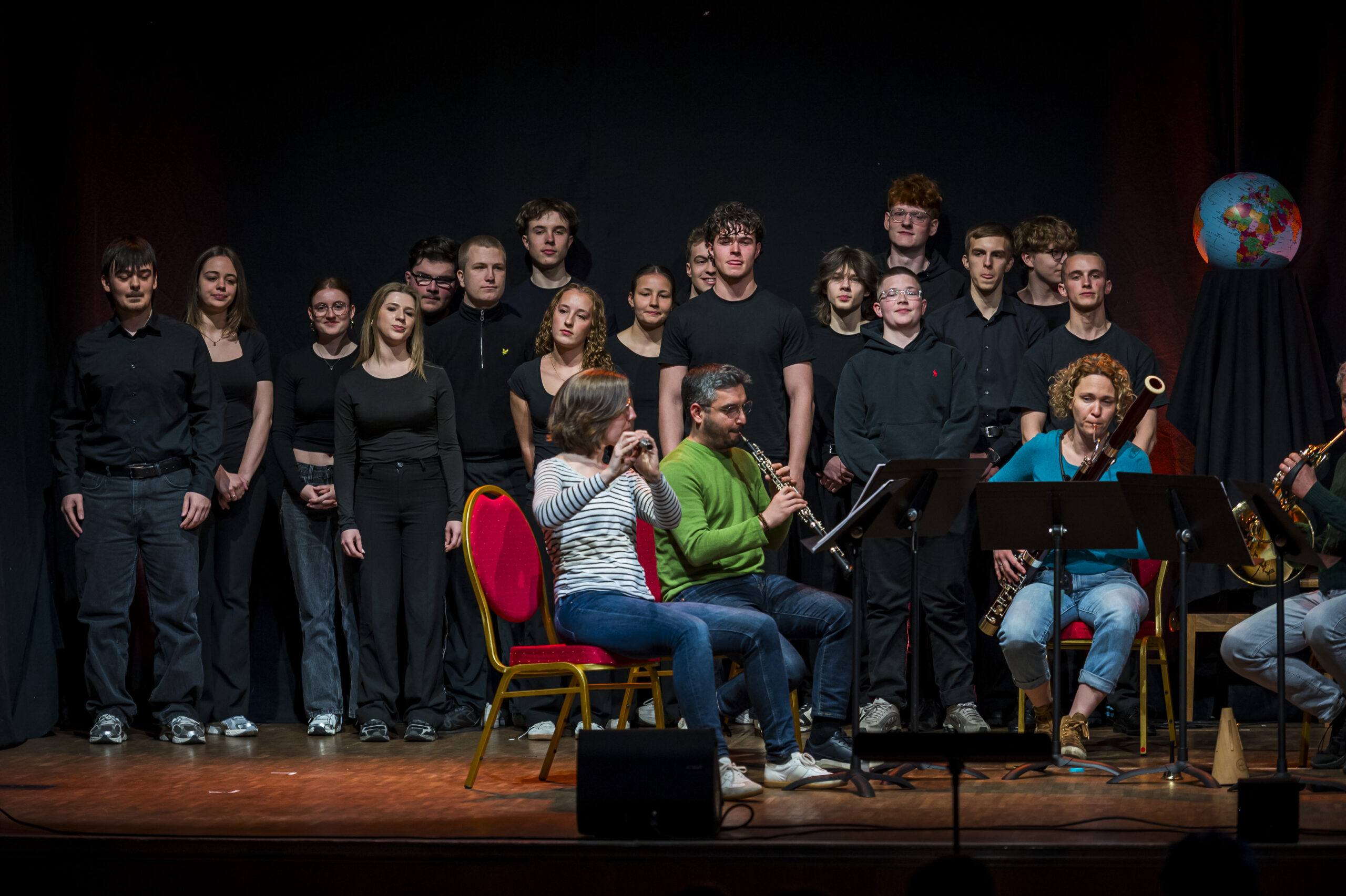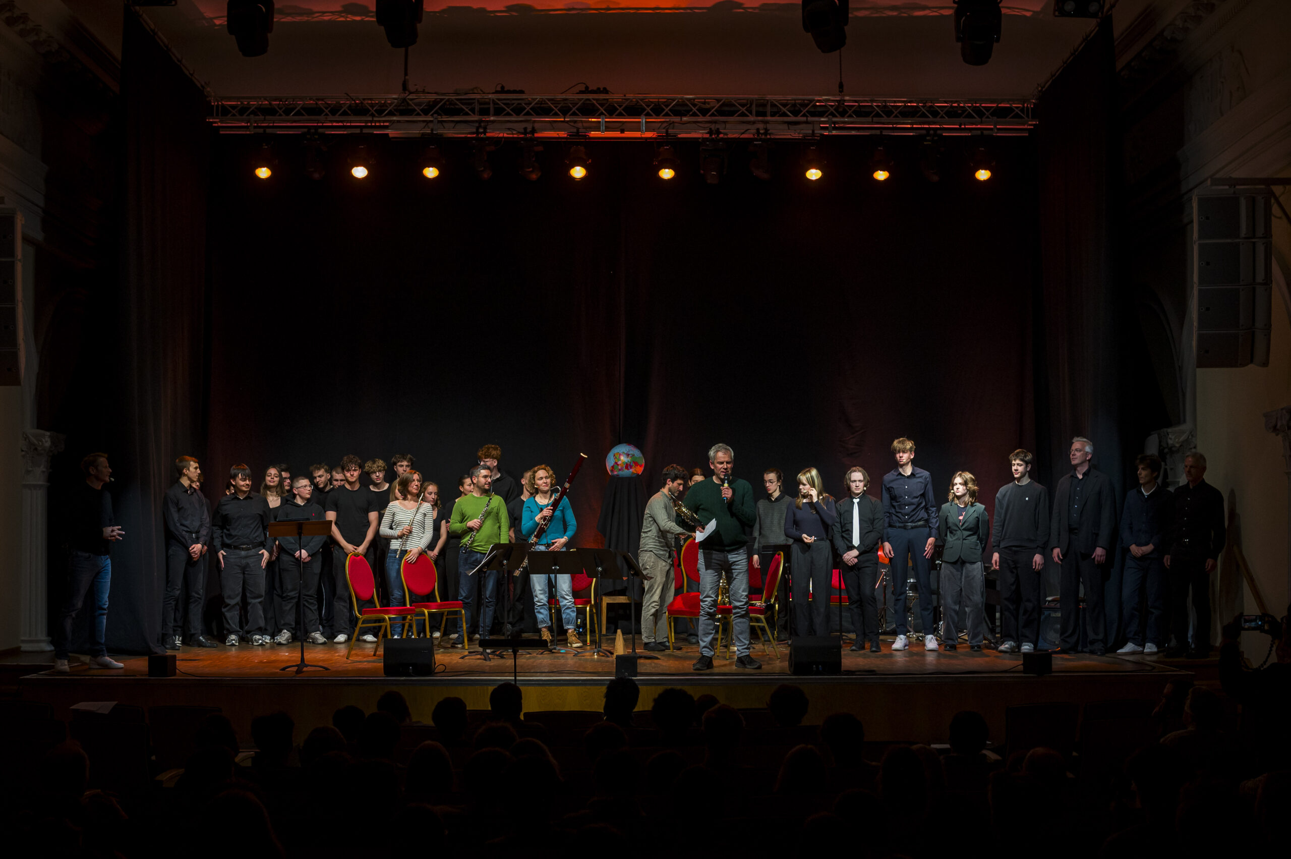 Auf Einladung durch die Michael-Haukohl-Stiftung konnten ca. 500 Lübecker Schülerinnen und Schüler am Mittwoch, dem 22. April 2026, einer künstlerisch mitreißenden und politisch denkwürdigen Revue zum Thema beiwohnen, die das Ensemble OPUS 45 gemeinsam mit Schauspieler Roman Knižka aufführte. Eine Geschichts-Doppelstunde der ganz besonderen Art, in der nichts nach Lehrbuch klang, sondern wo Texte der Zeit in einer so eindringlichen Weise zum Leben erweckt wurden, wie man es nur selten erleben kann: Literarisches, Erinnerungen (Haffner, Klemperer), Tagebücher (Goebbels), Reden (Hitler), Zeitungsartikel (dabei das Interview der amerikanischen Journalistin Dorothy Thompson mit Adolf Hitler).