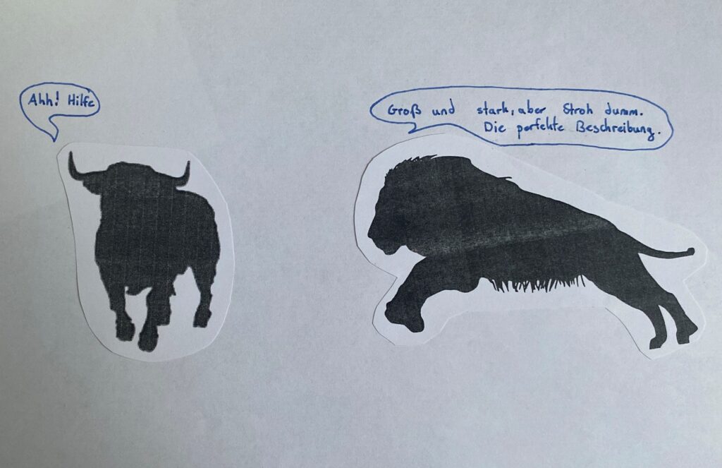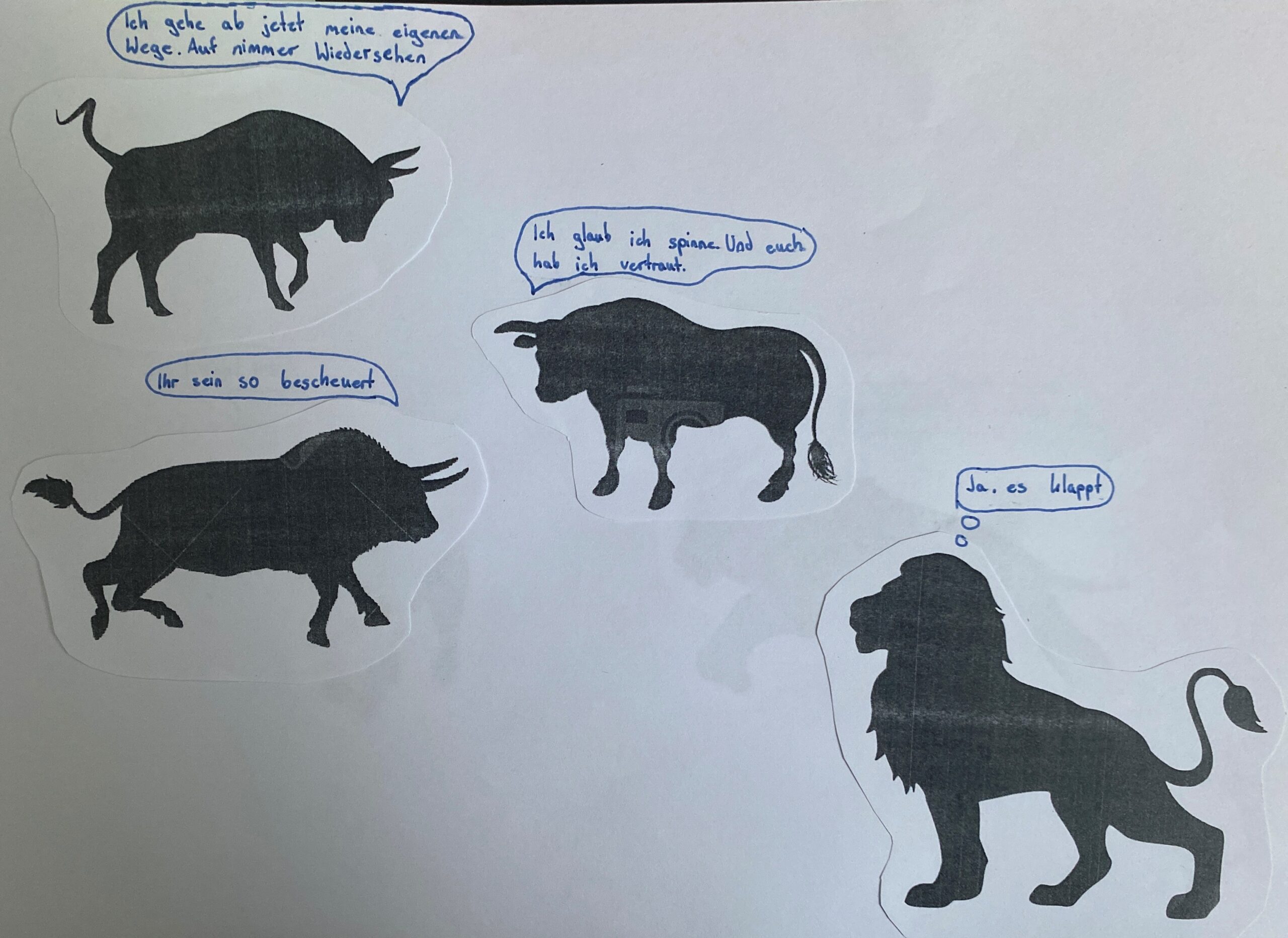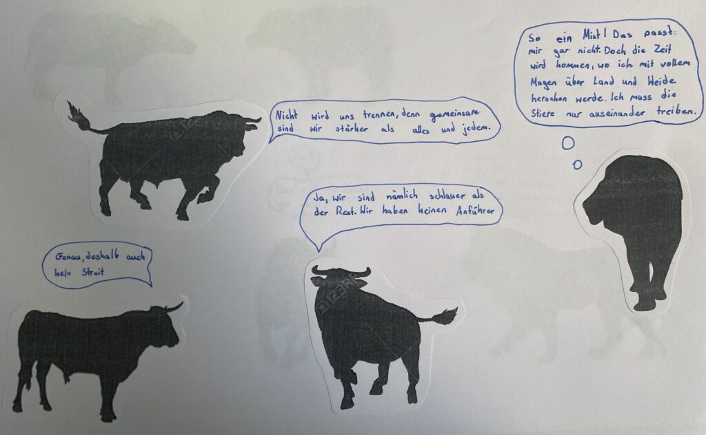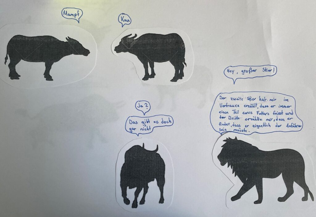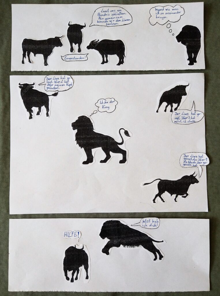 Mit Fabeln von Aesop, Phaedrus, La Fontaine, Martin Luther, G.E. Lessing und Wilhelm Busch beschäftigt sich die Klasse 6b im Deutschunterricht. Dabei lernen die Schülerinnen und Schüler auch etwas über das immaterielle europäische Kulturerbe, denn diese Textgattung diente und dient seit der Antike in unterschiedlichen Gesellschaften und Ländern dazu, Kritik an den Mächtigen zu üben und ihre Schwächen zu entlarven. Mit Hilfe der Geschichten, in denen Tiere menschliche Eigenschaften verkörpern, lässt sich die Gesellschaftskritik gefahrlos äußern. Aus den Geschichten muss der Leser oft selbst eine Lehre ziehen. Manchmal wird sie aber schon vom Autor präsentiert, wie im hier angeführten Beispiel, der Aesop zugeschriebenen Fabel von den Drei Stieren und dem Löwen, die die Schülerinnen und Schüler als Bildergeschichte mit wörtlicher Rede ausgestaltet haben. Hier die Beispiele von Feli und Charlotte: