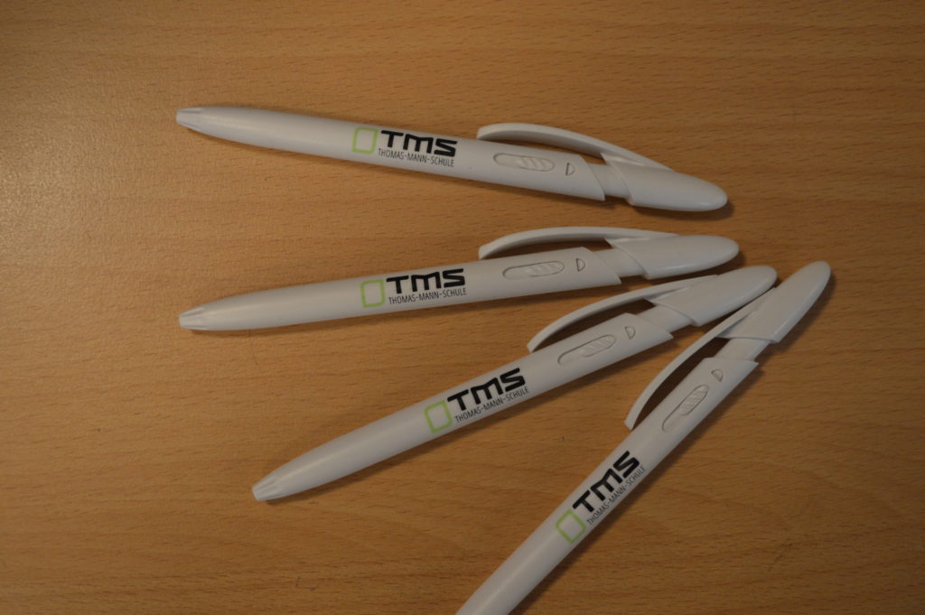 Auch Kugelschreiber, USB-Sticks und Tassen mit Schullogo gehören zum Sortiment der Schülerfirma, die unter der Leitung von Frau Hayde gegründet wurde, um Schülern die Möglichkeit zu geben, wirtschaftliches Denken und Handeln praktisch zu erproben und sich für die Belange der Schüler zu engagieren.