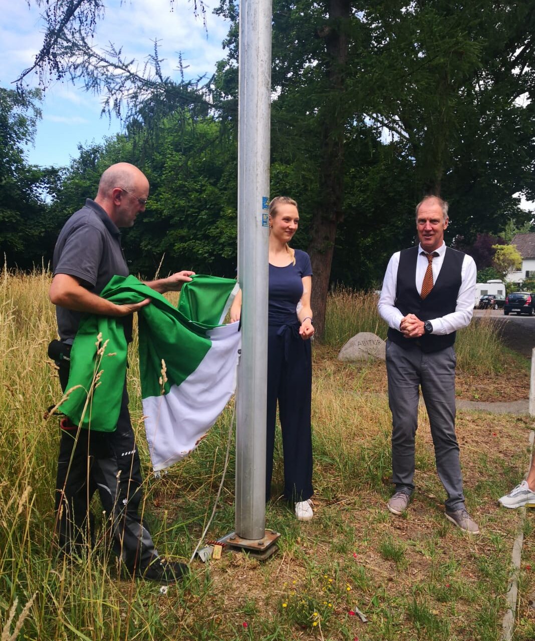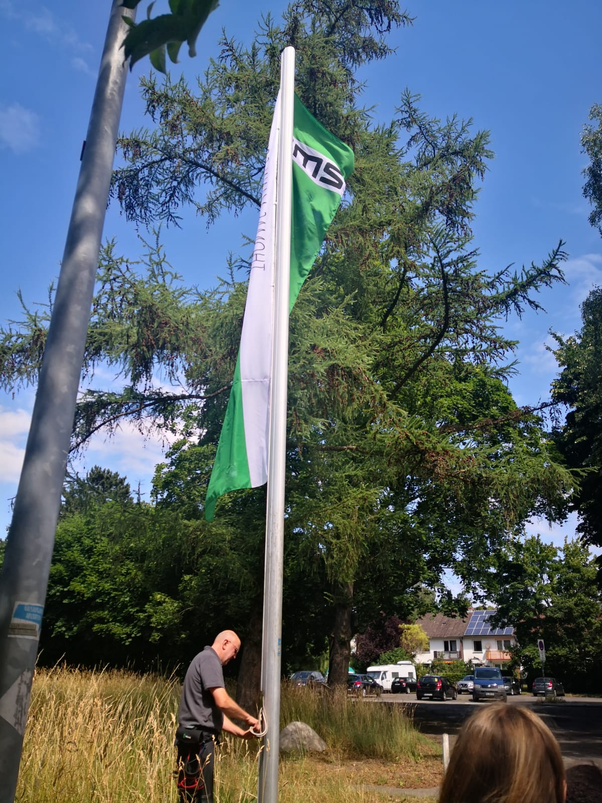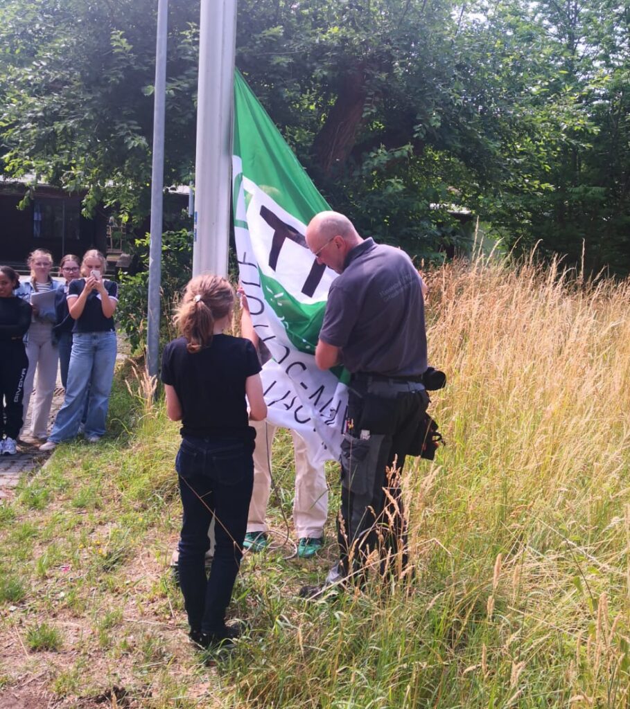 In einer kleinen Zeremonie hisste Herr Prühs, unser Hausmeister, die neue TMS-Flagge. Entworfen von Kunstlehrerin Marissa Wittenhagen, zeigt sie den TMS-Schriftzug sowie die Schulfarben Grün und Weiß.