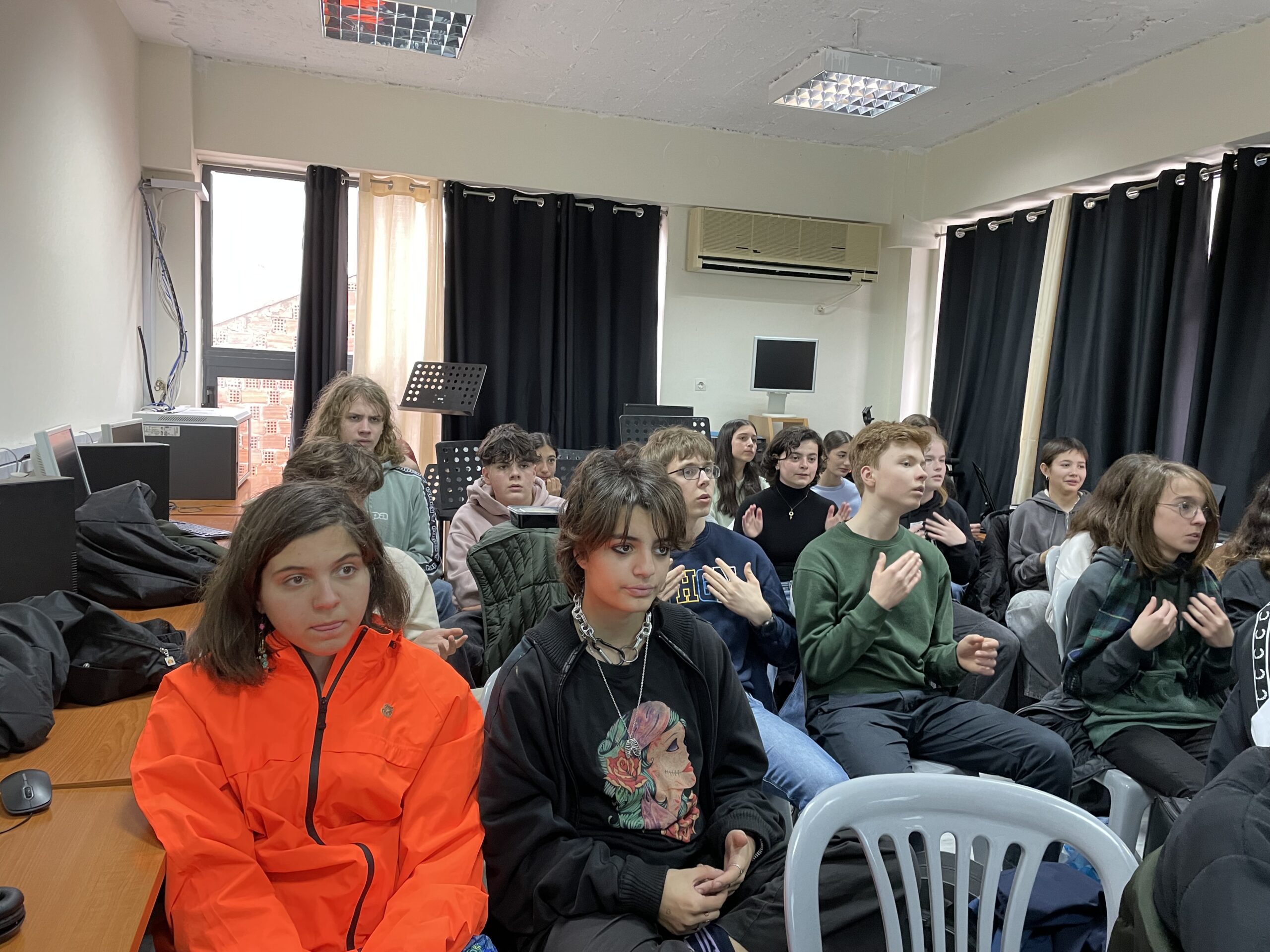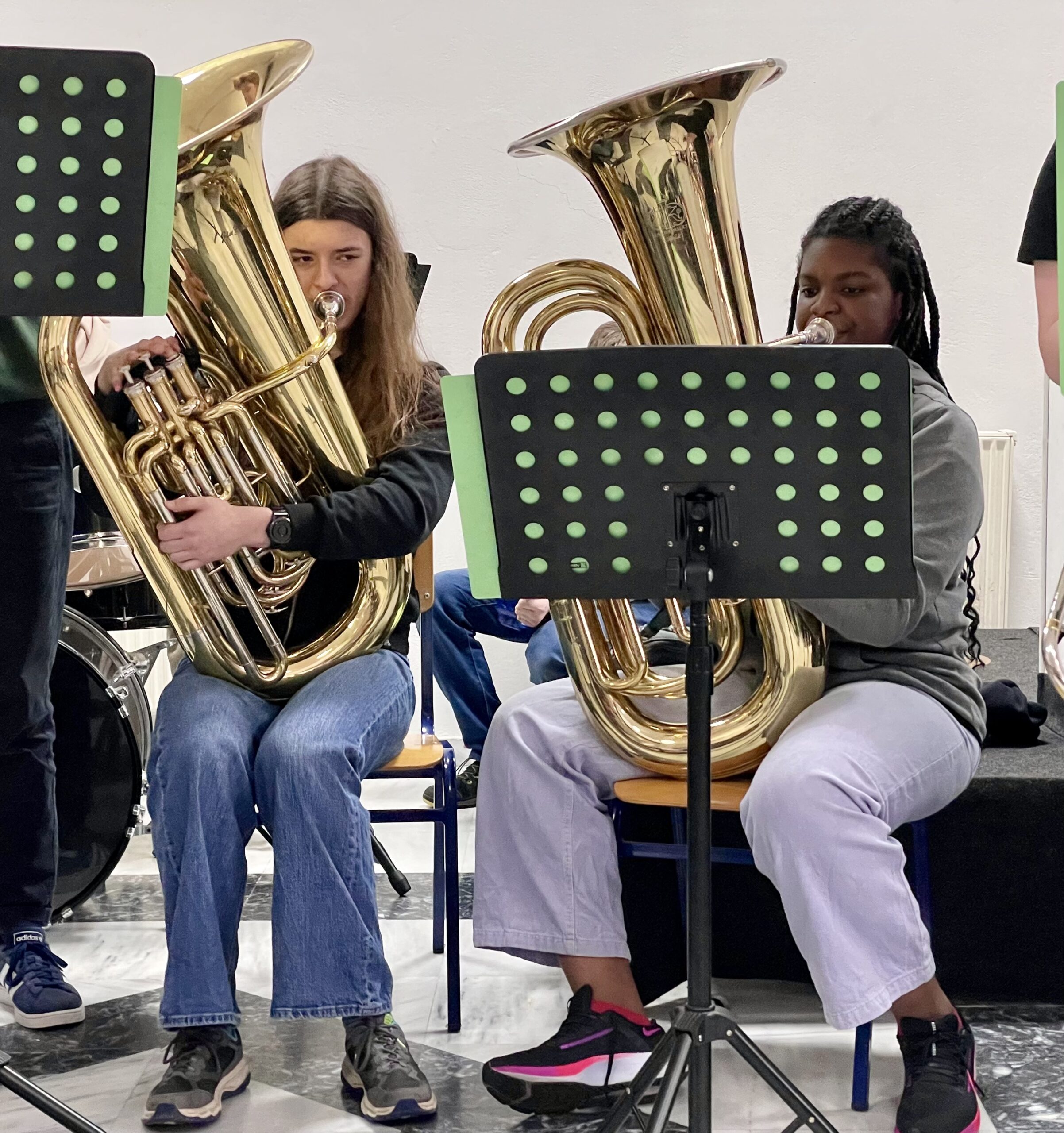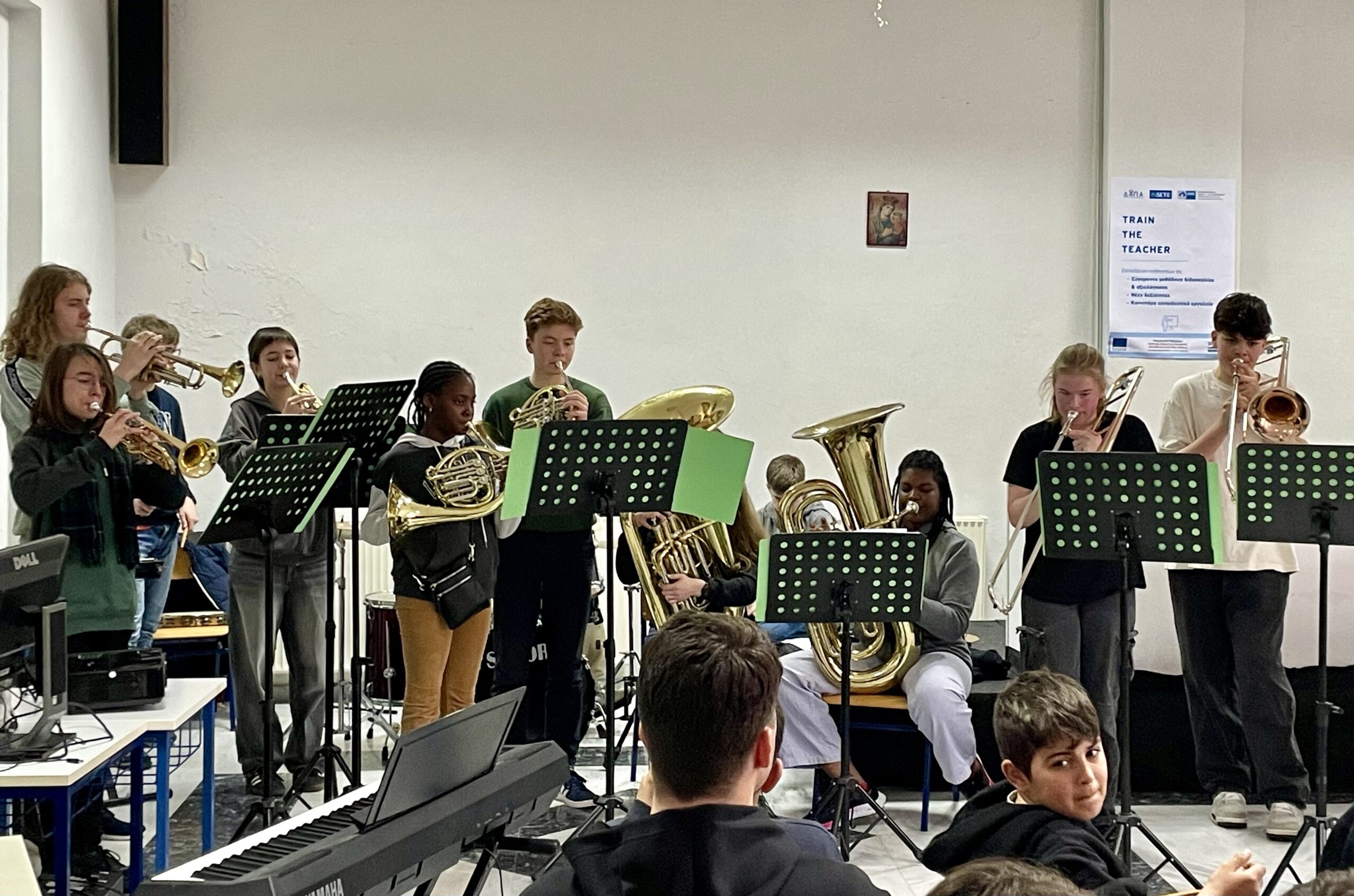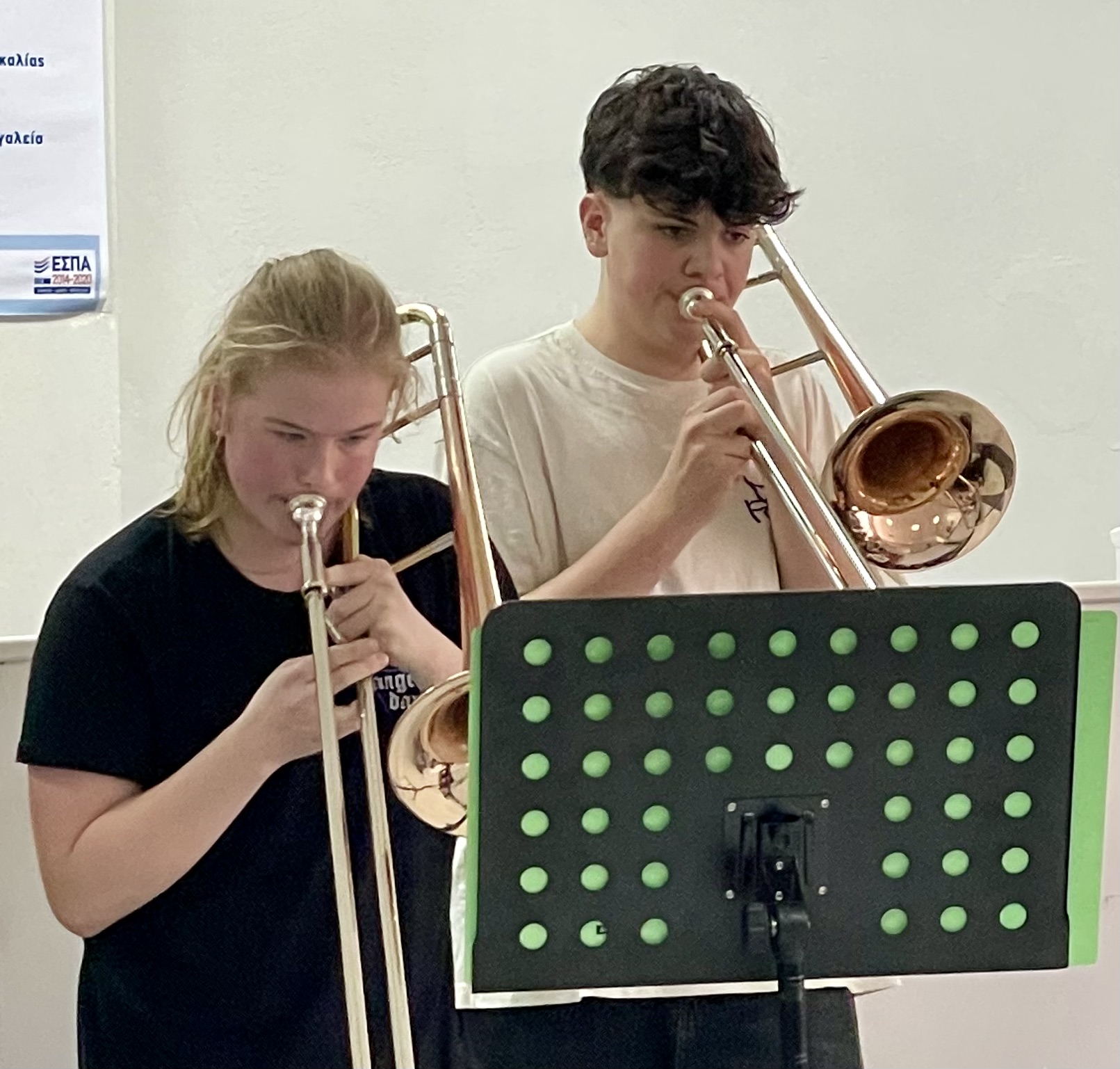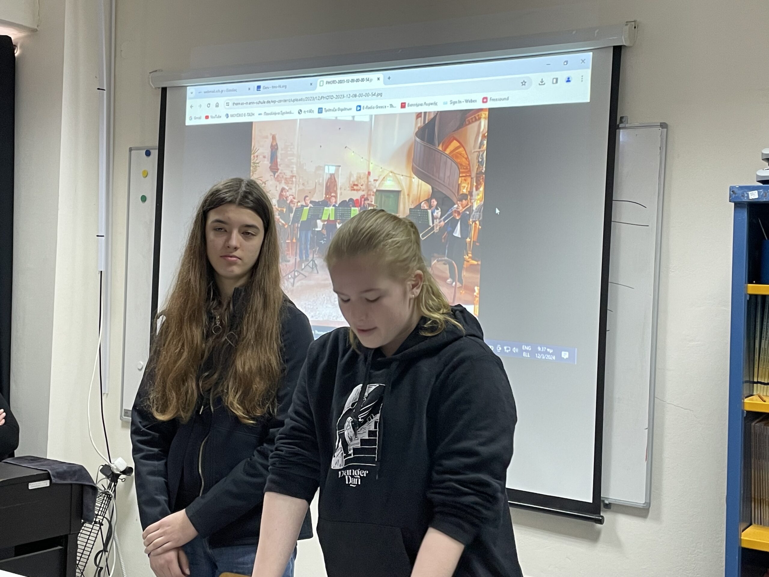 Timon und Emiliano stellten die Besonderheiten unsere Schule vor, wie das bilinguale Angebot, die Europaaktivitäten und MUNOL. Dabei stellten wir fest, dass die Mytilene Music School ebenfalls am Programm „Botschafterschule des Europäischen Parlaments“ teilnimmt. Nathalie und Helena erzählten im Anschluss etwas über die Arbeit der Blechbläserensembles.