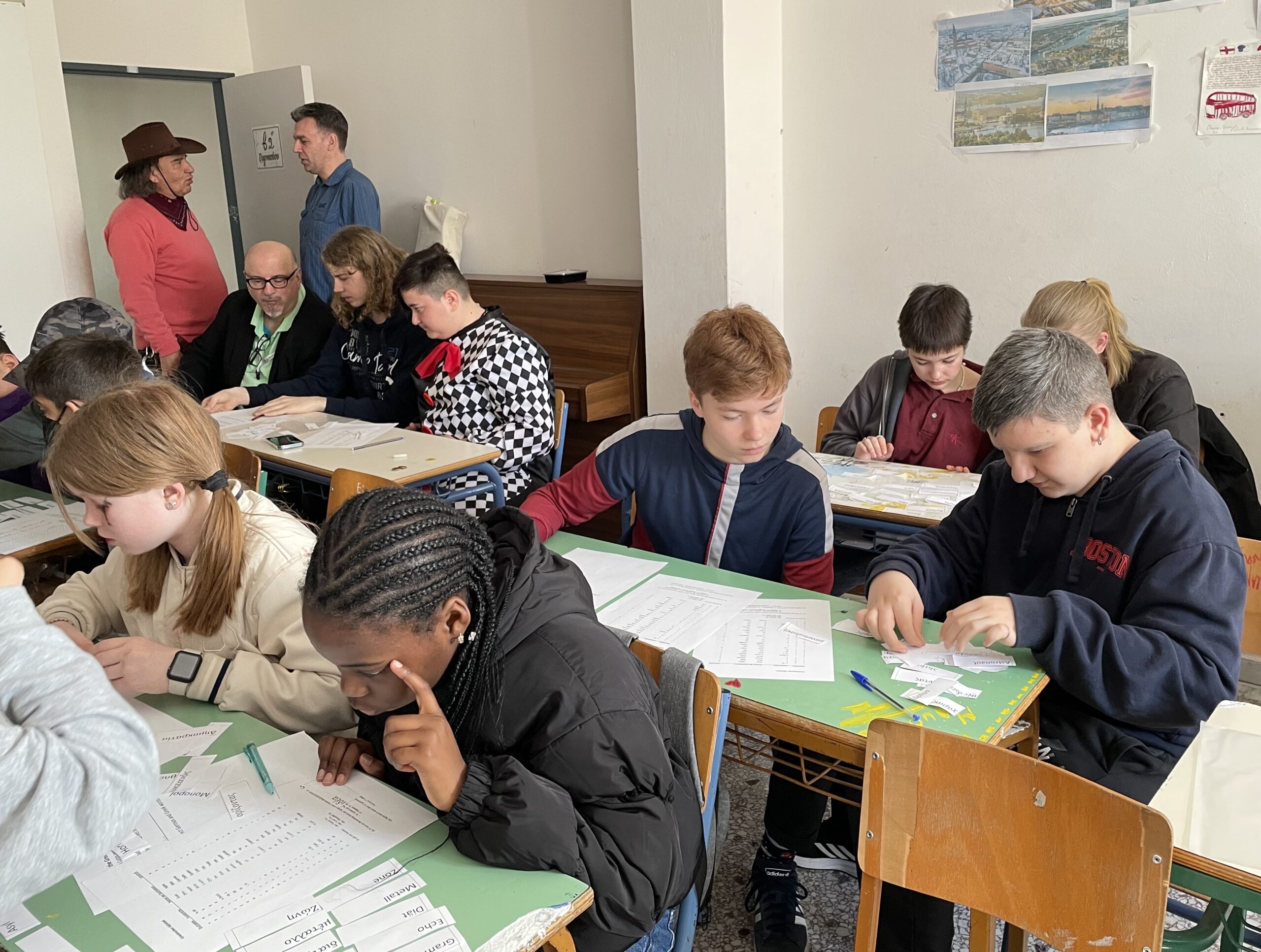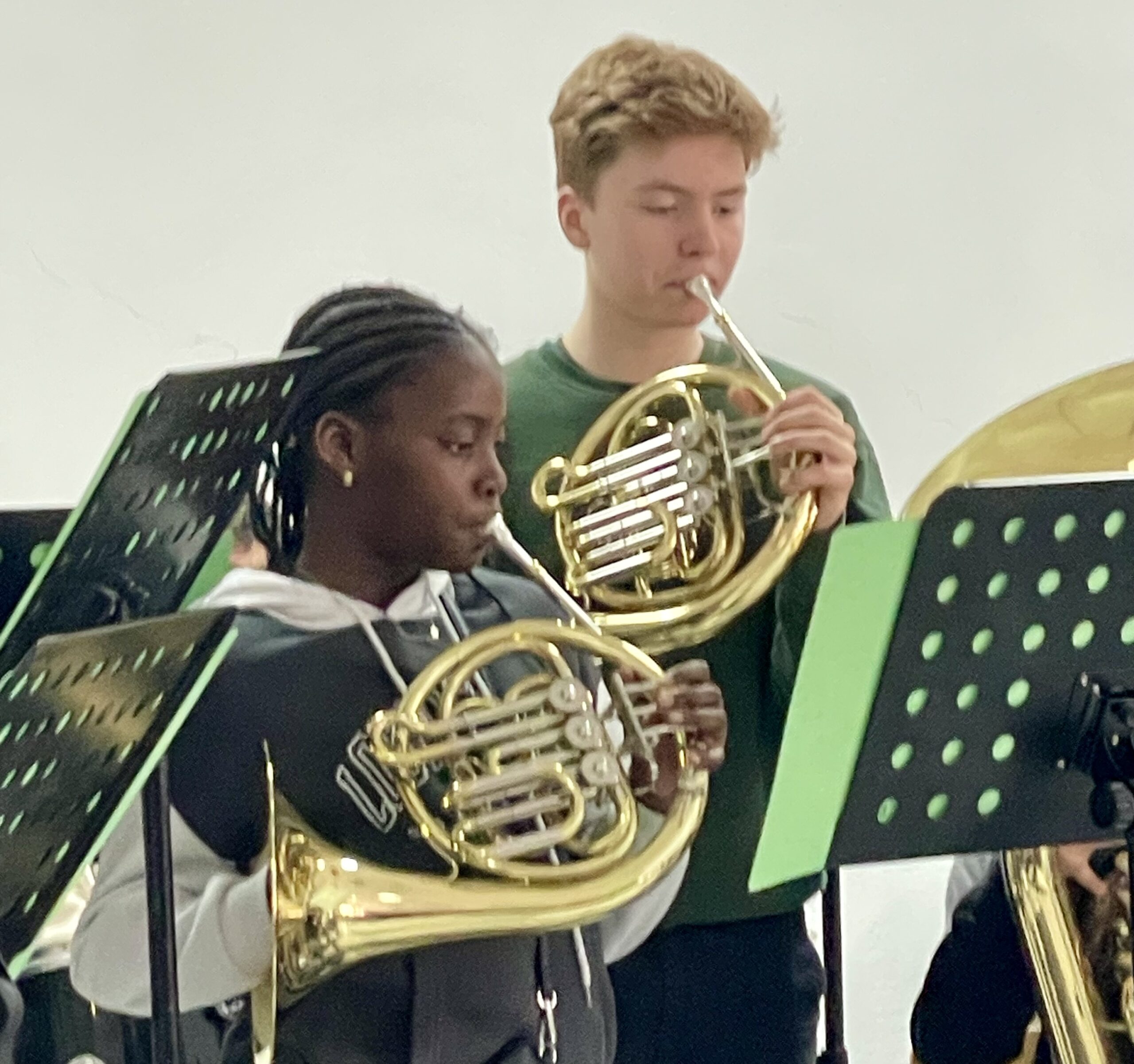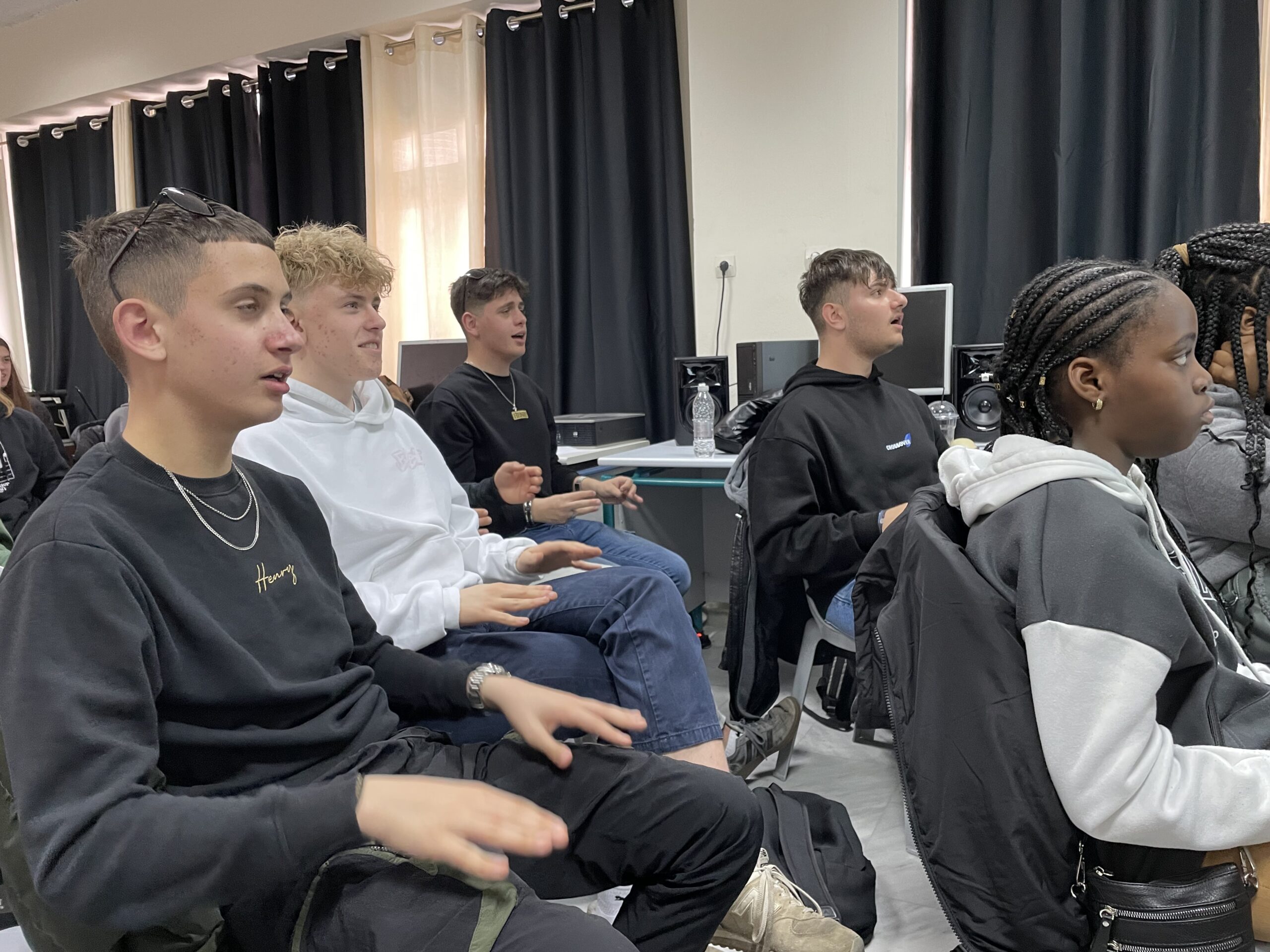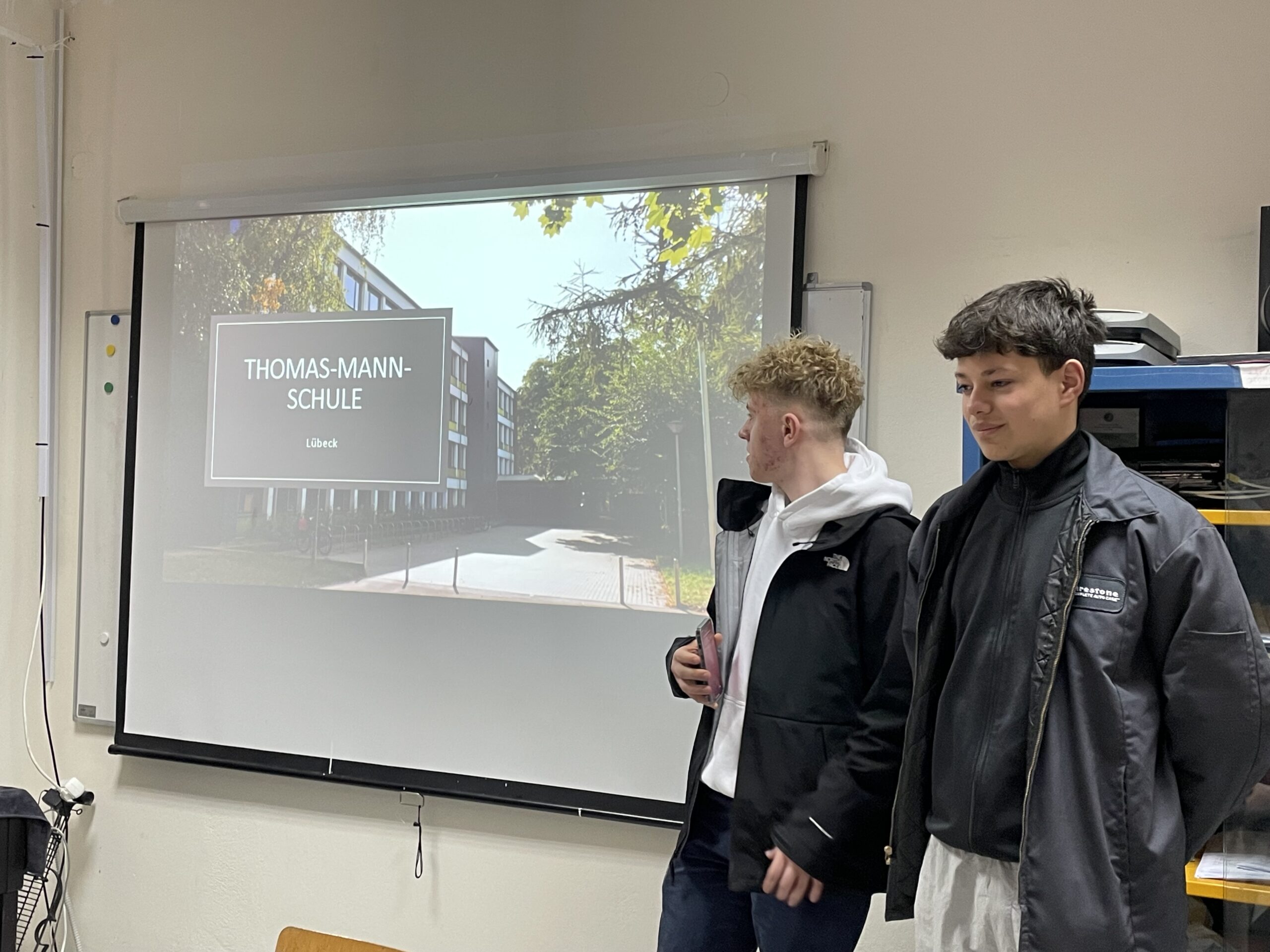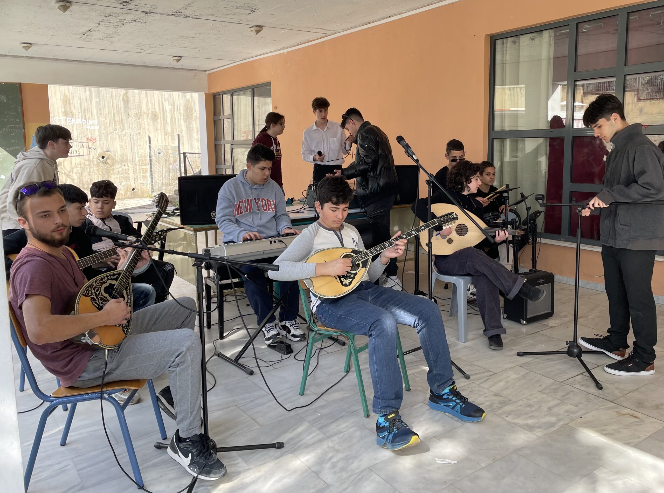 Timon und Emiliano stellten die Besonderheiten unsere Schule vor, wie das bilinguale Angebot, die Europaaktivitäten und MUNOL. Dabei stellten wir fest, dass die Mytilene Music School ebenfalls am Programm „Botschafterschule des Europäischen Parlaments“ teilnimmt. Nathalie und Helena erzählten im Anschluss etwas über die Arbeit der Blechbläserensembles.