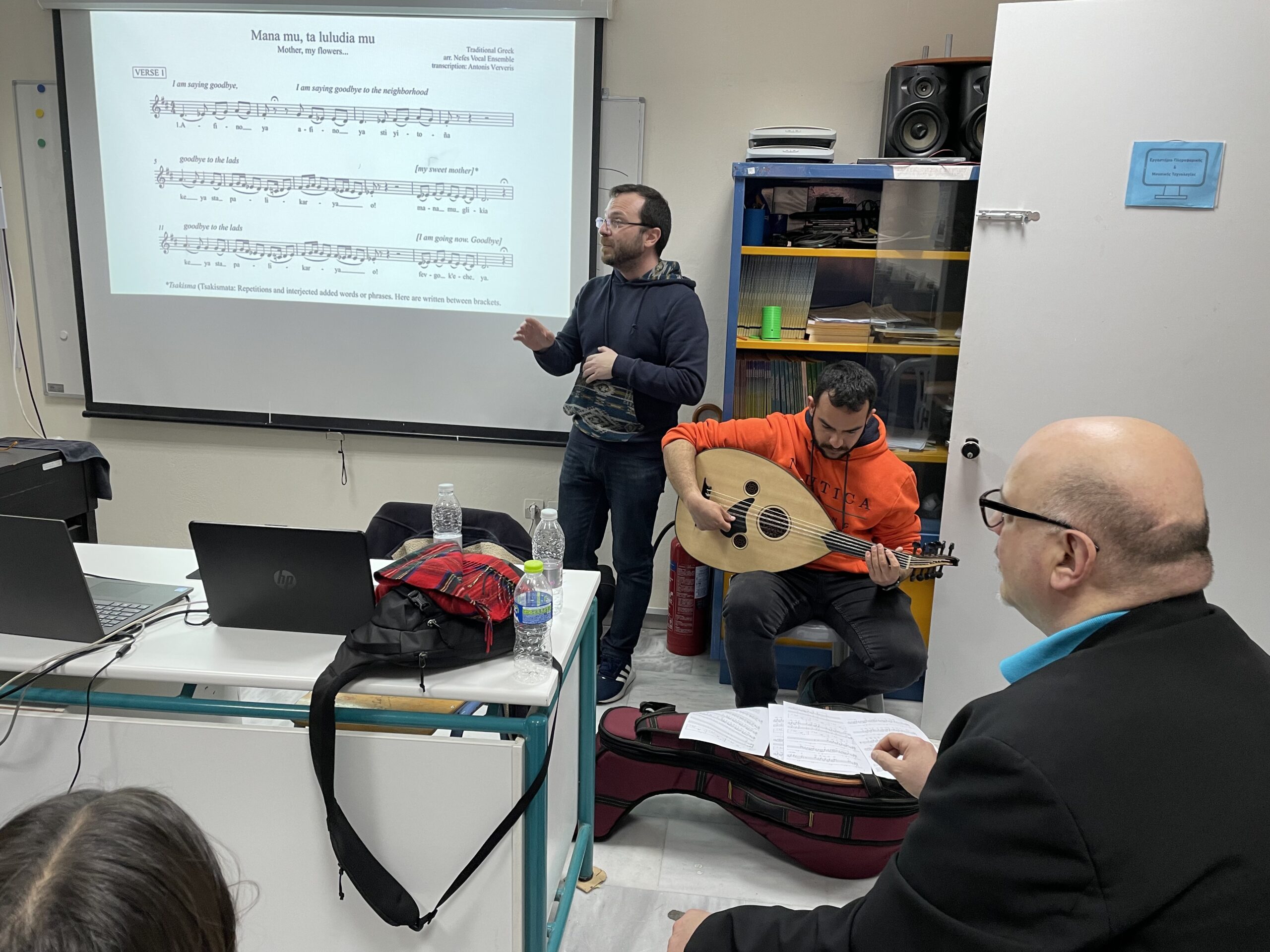 Im weiteren Verlauf des Vormittags hörten wir einen Vortrag über die traditionelle Musik auf den griechischen Inseln und nahmen an einem Workshop teil, bei dem wir ein traditionelles Lied erlernten und dazu Bodypercussion machten. In der fremden Sprache war das gar nicht so einfach, aber Antonis, der selbst einmal Schüler an der MSM gewesen ist und jetzt als Dozent an der Uni in Ioannina auf dem griechischen Festland arbeitet, übte geduldig mit uns.