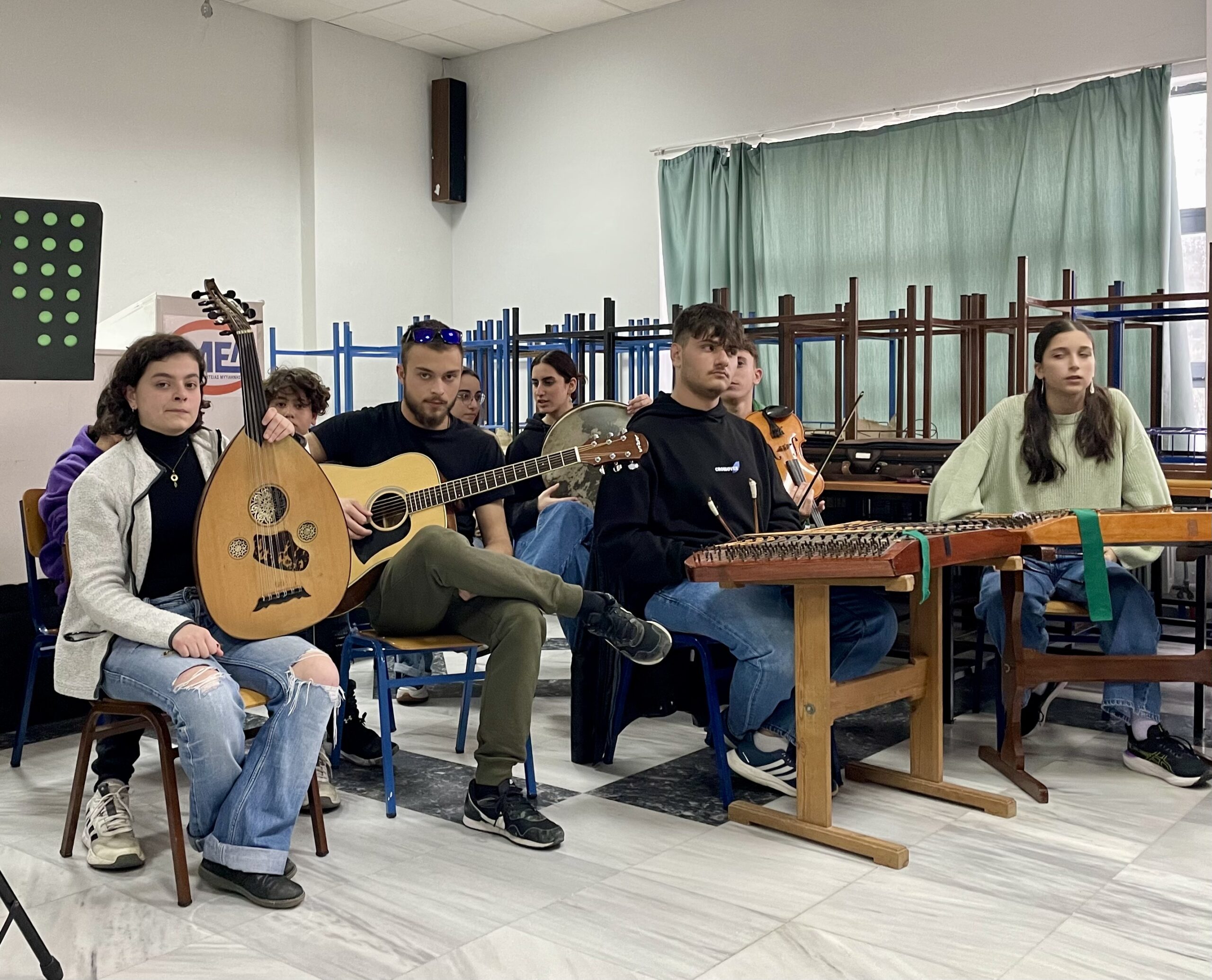 Dann stellte Englischlehrer Eric die Schule vor, in der jedes Kind mindestens drei Musikinstrumente erlernt, und zwar zunächst Klavier, dann ein traditionelles griechisches Instrument, wie die Santuri, die Oud oder Bouzouki, und als Drittes ein weiteres, frei wählbares Instrument. Der Unterricht in den herkömmlichen, allgemeinbildenden Fächern dauert von 8:00 bis 13:00 Uhr. Daran schließen sich 2-3 Stunden Musikunterricht an. Die ca. 150 Schülerinnen und Schüler der Mytileni Music School werden von über 40 Lehrern unterrichtet. Dieses Betreuungsverhältnis ergibt sich daraus, dass die Lehrer ihren Schülern u.a. Einzelunterricht in den Instrumenten erteilen, und führt zu einer sehr persönlichen Beziehung zwischen Lehrkräften und Schülern.