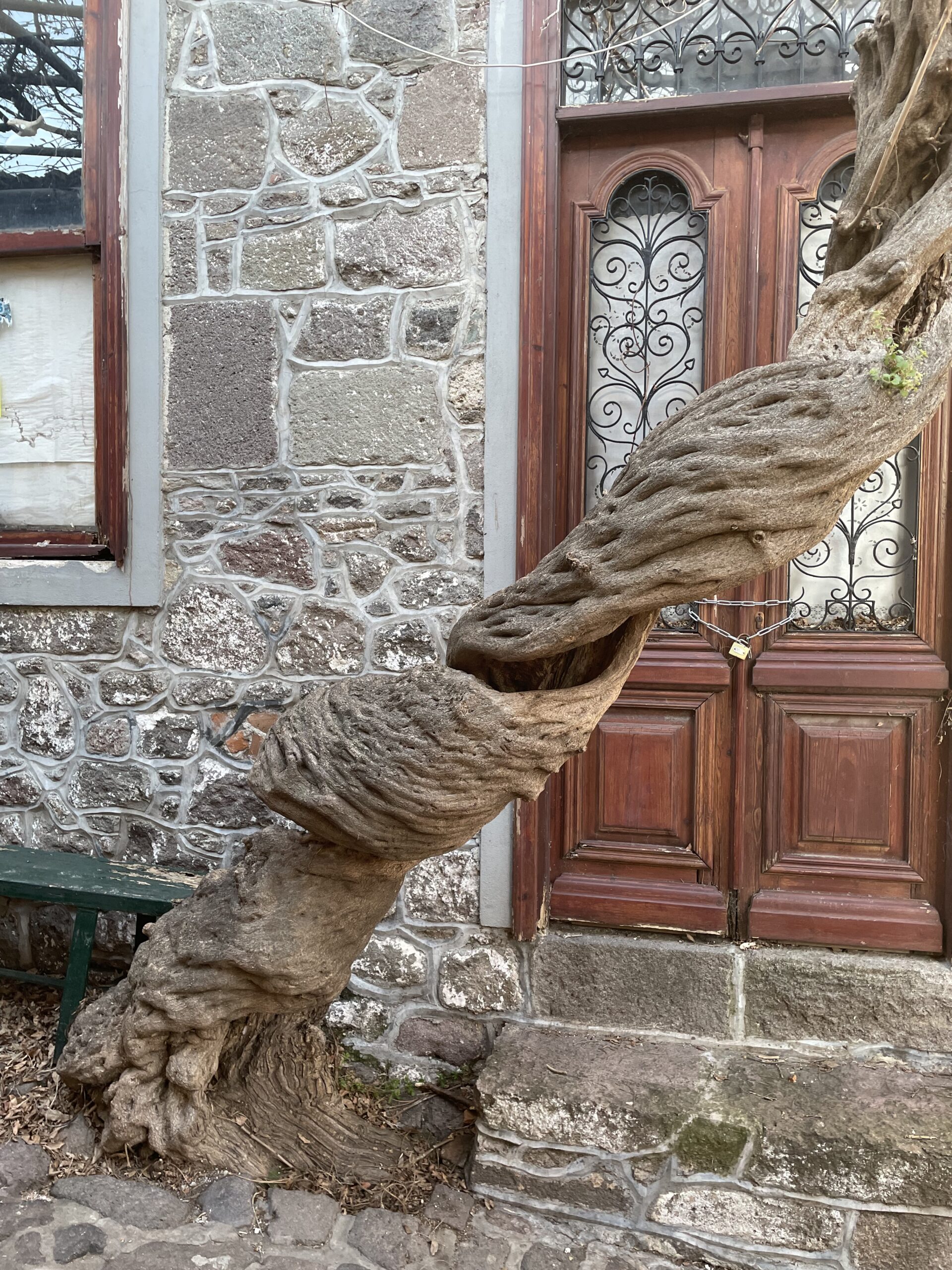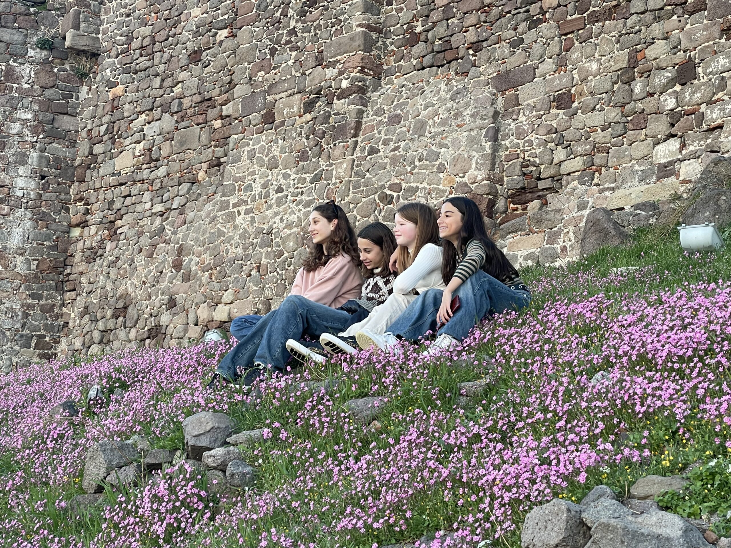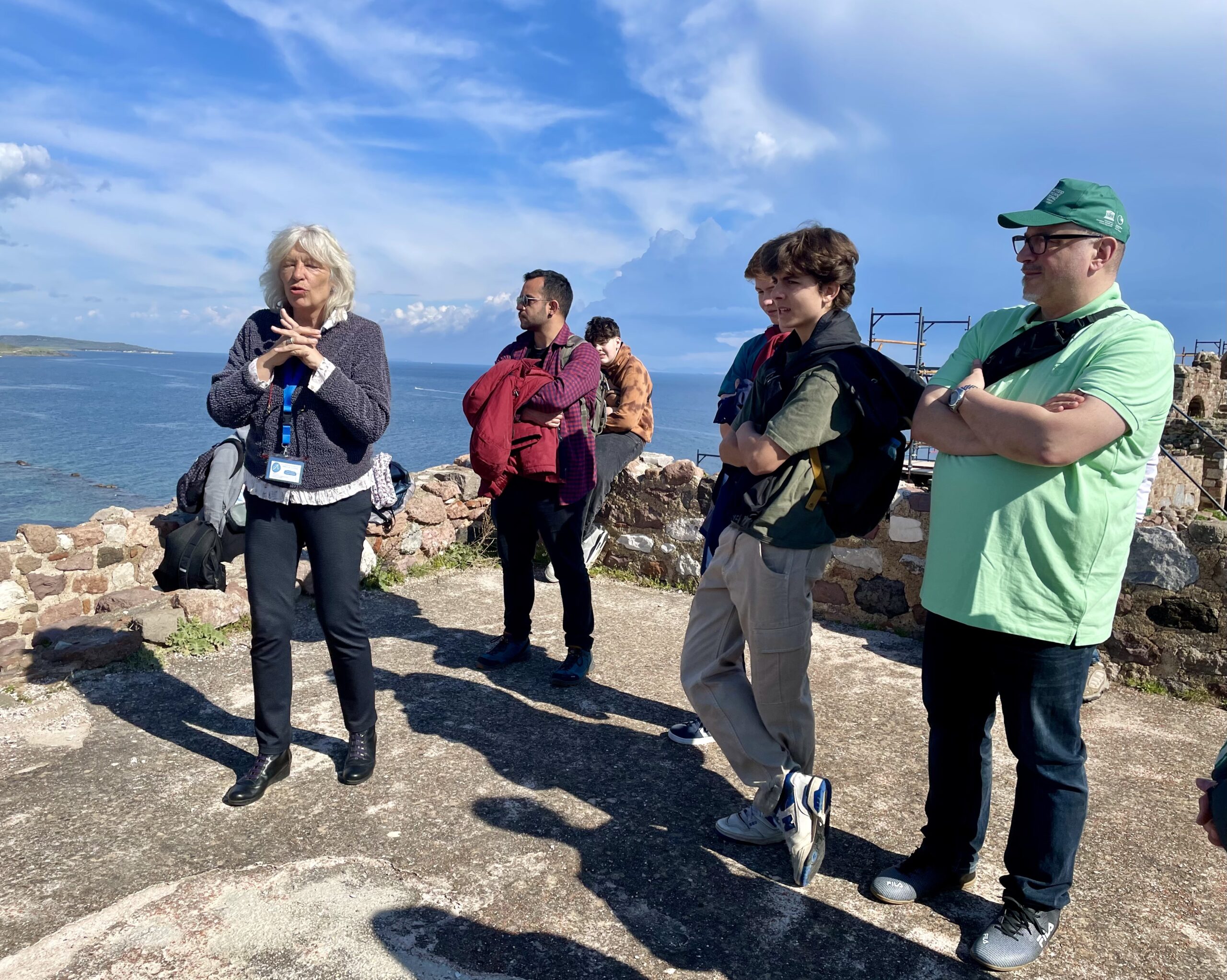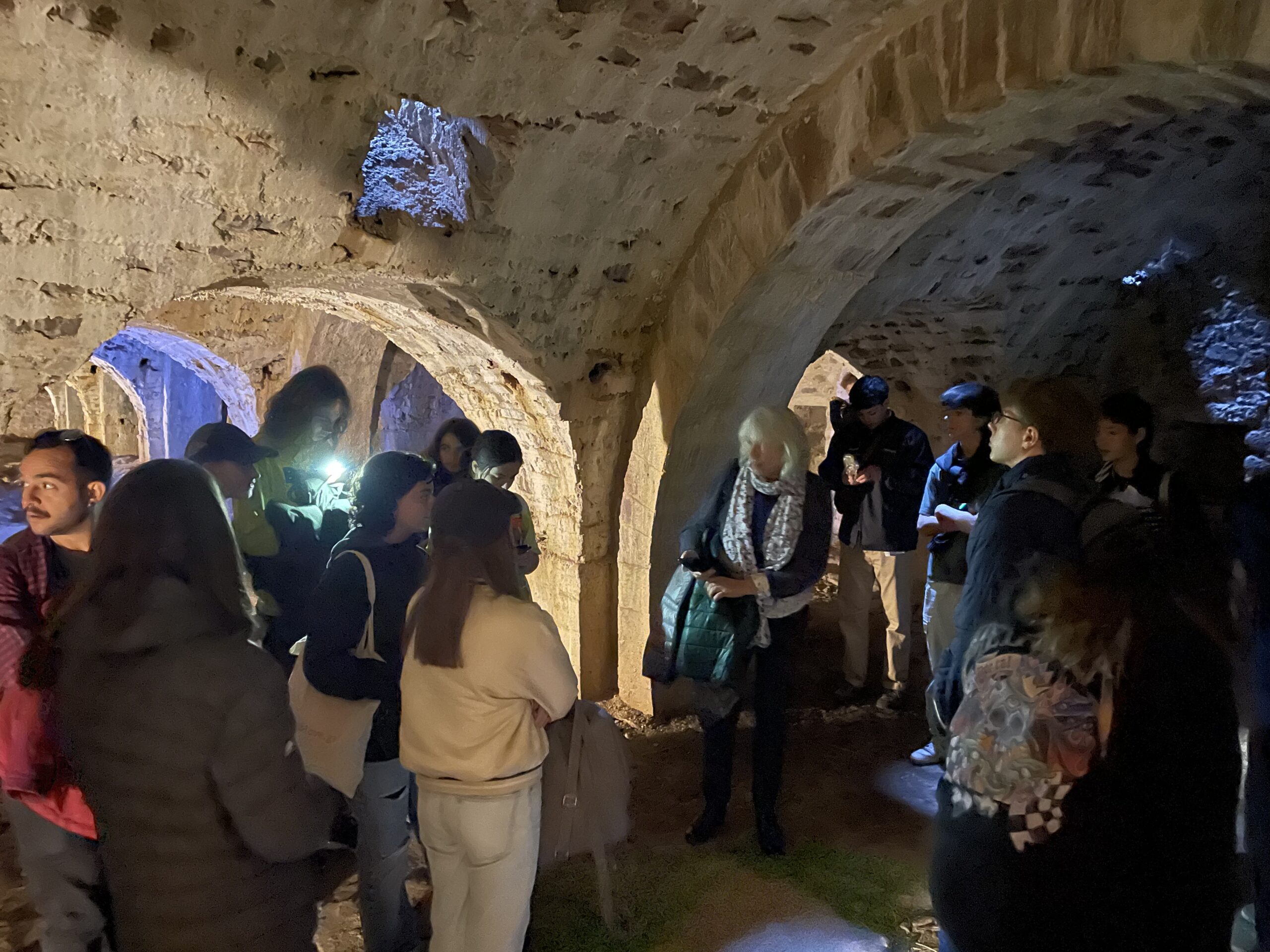 Am Donnerstagmorgen machten wir eine Tour durch die Burg von Mytileni. Ich habe dabei gelernt, dass die Stadt einer Sage zufolge nach der Tochter des Königs Lesvos, der der Insel seinen Namen gab, Mytilene benannt wurde. Nachdem Griechenland Teil des Römische Imperiums geworden war, besuchte Kaiser Pompejus Lesbos. Dem Bericht des antiken Schriftstellers Plutarch gemäß war dieser so begeistert von dem in hellenistischer Zeit erbauten Amphitheater in Mytileni, dass er nach dessen Vorbild eines in Rom errichten ließ. Ich fand auch die unter der Burg erthaltenen Kellergewölbe, die zum Schutz der Bewohner Mytilenis erbaut wurden, sehr spannend. Im Falle einer Belagerung konnten sich hier Hunderte Menschen versteckt halten. Unsere Gastgeber berichteten uns, dass sie auf dem Gelände der Burg, in den Kellern und dem Gewölbe der Zisterne ein Wandelkonzert veranstaltet haben, bei dem die Zuhörer von einem Ort zu anderen schlendern. Wir konnten uns wegen der hervorragenden Akustik in den Räumen gut vorstellen, wie eindrucksvoll das gewesen ist. Unser Guide auf dem Burgberg war Elsa, die, wie sich herausstellte, eine ehemalige TMS-Schülerin ist und seit Jahrzehnten auf Lesbos lebt.