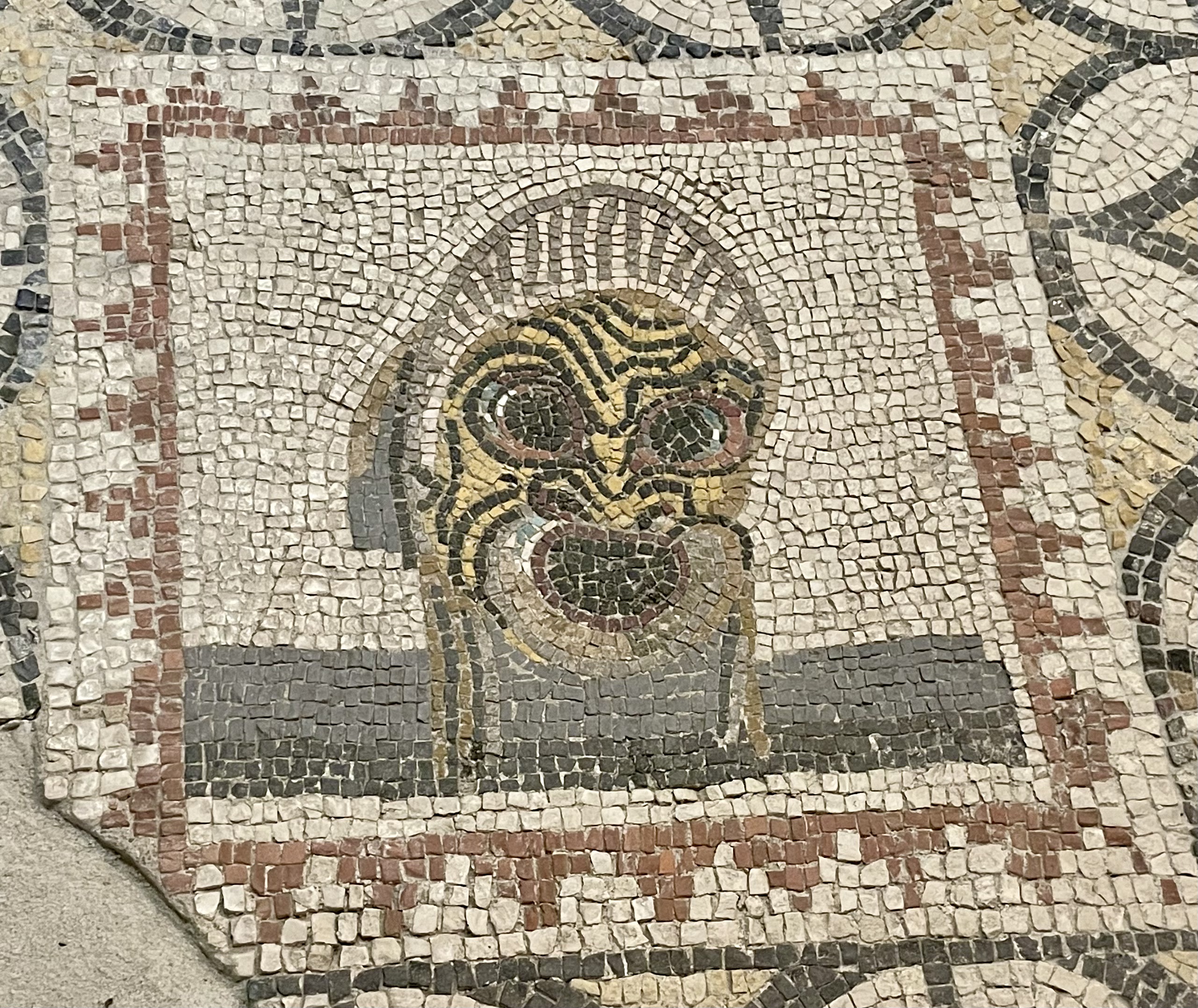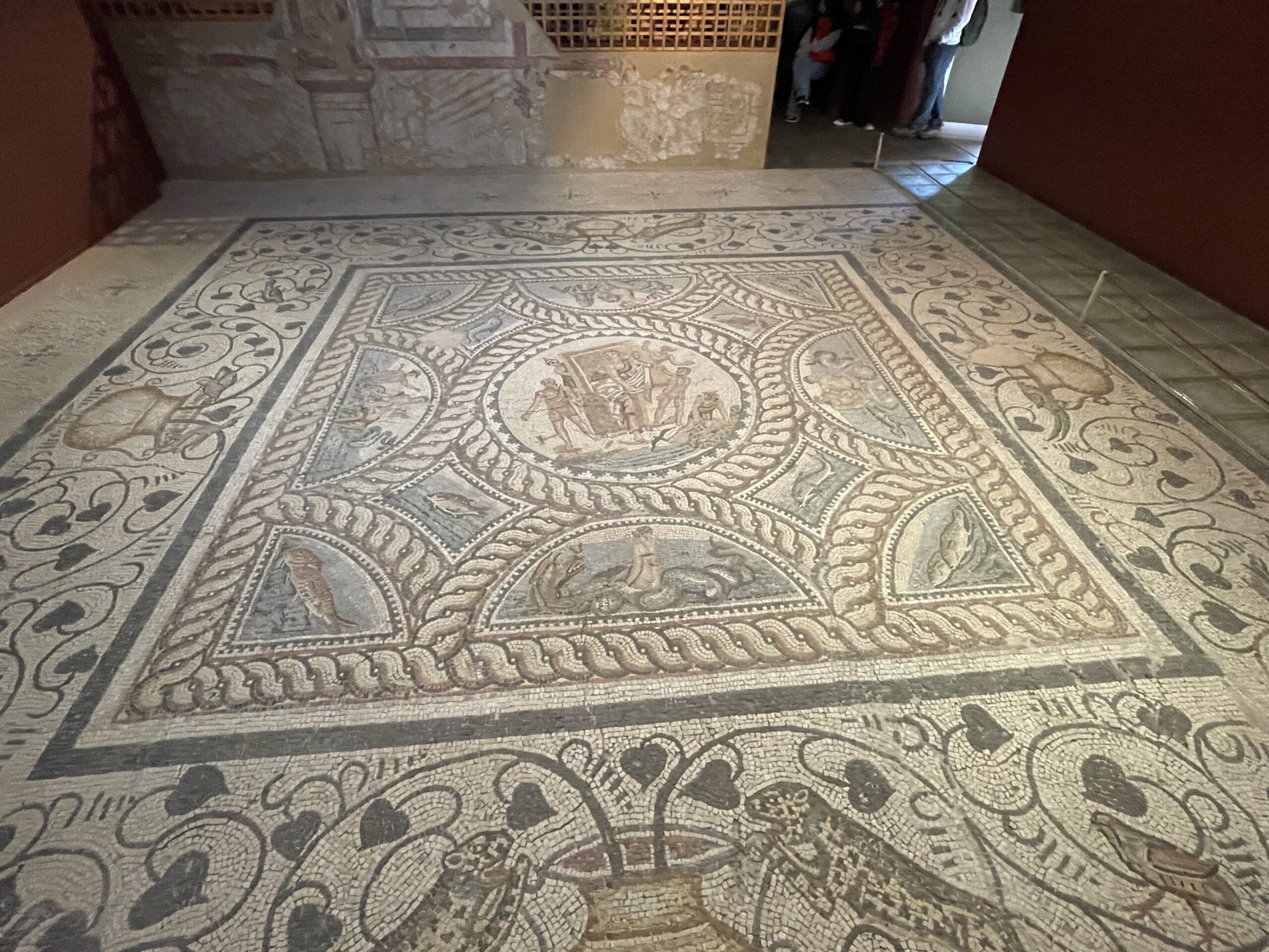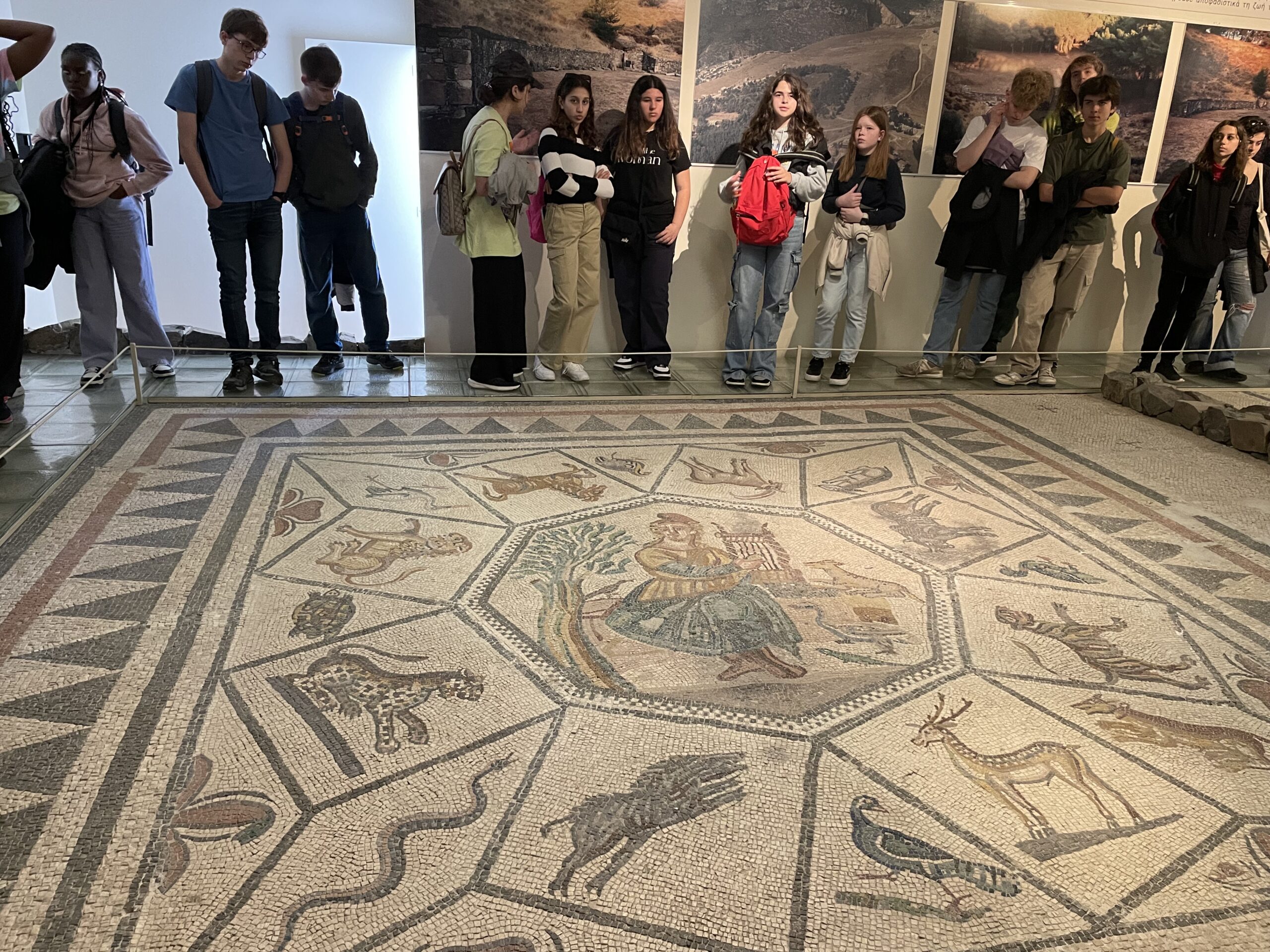 Im archäologischen Museum bekamen wir berühmte Mosaiken erklärt, die z.B. Orpheus mit der Lyra zeigen, wie er durch seine Musik wilde Tiere anlockt und zähmt. Auch Szenen aus antiken Dramen waren als Mosaike gestaltet und Theatermasken, die antike Schauspieler bei den Aufführungen trugen.