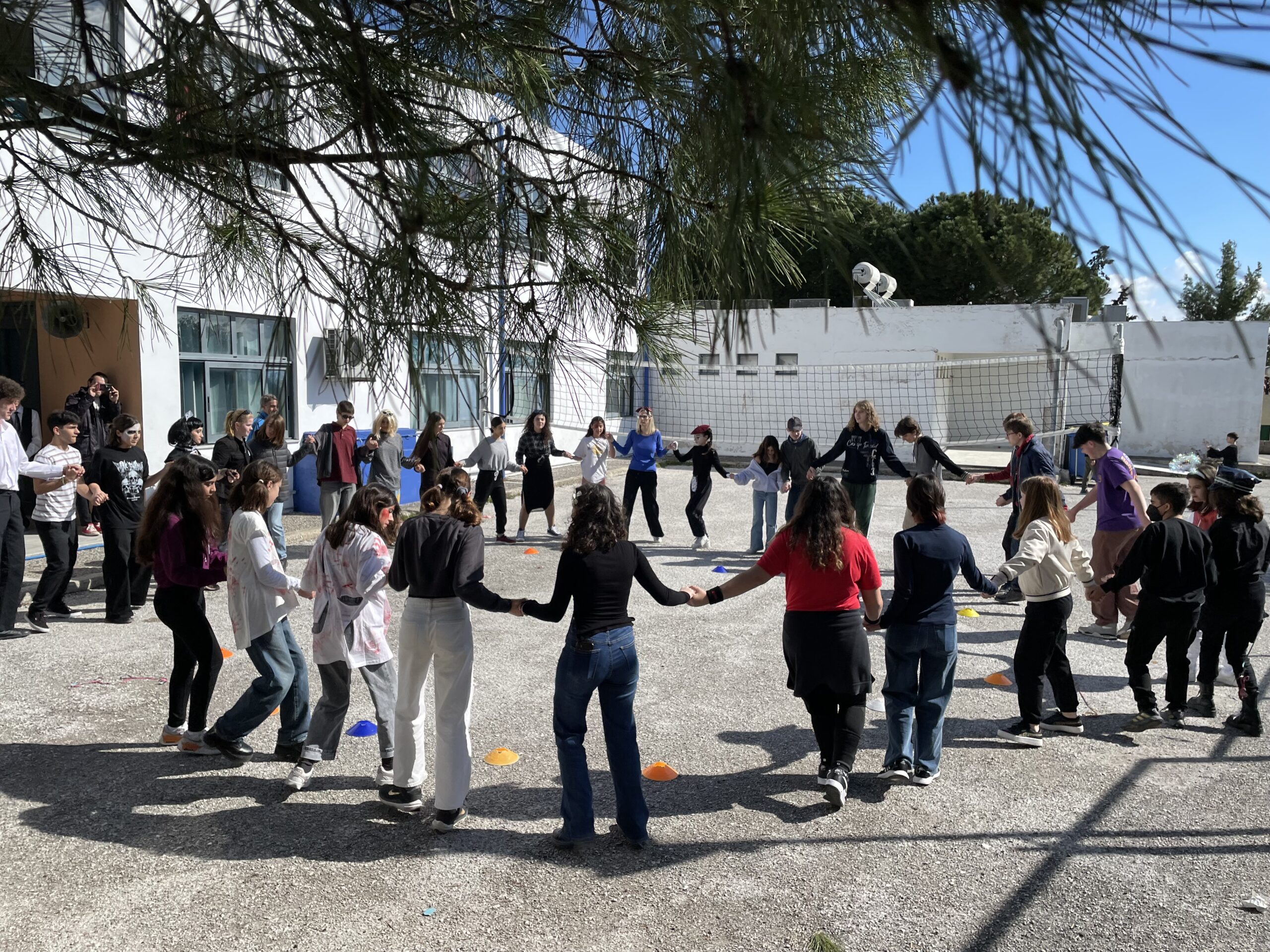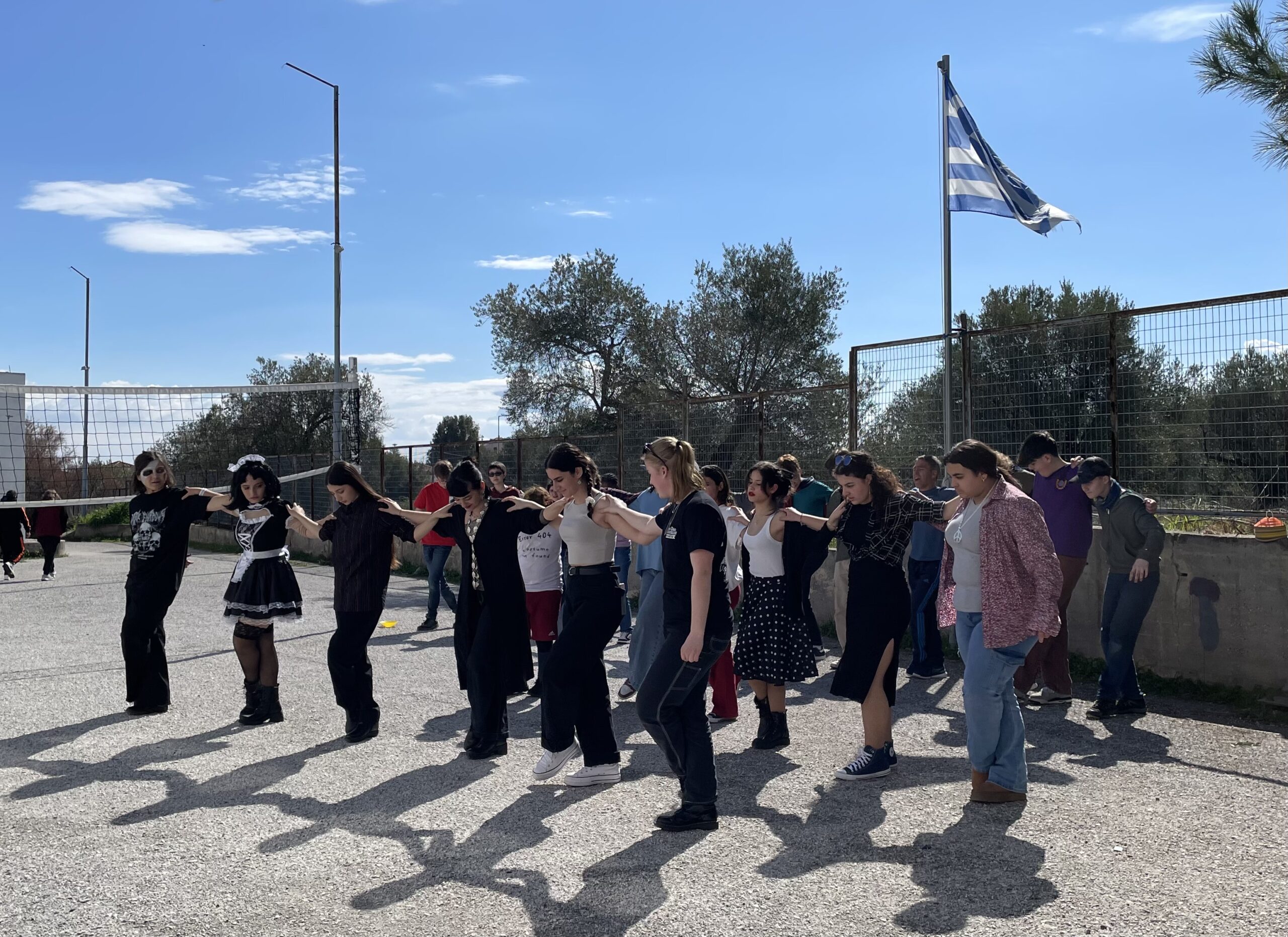 Danach haben manche der griechischen Schüler auf dem Schulhof traditionelle Musik gespielt und ihr Sportlehrer Kostas uns die passenden Tanzschritte beigebracht. Den bekanntesten – Sirtaki – haben wir dann alle zusammen getanzt. Daran hatten alle sehr viel Spaß, und umso trauriger waren wir, als wir merkten, dass unsere gemeinsame Zeit sich dem Ende zuneigt. Abschied zu nehmen, ist uns sehr schwergefallen. Die griechischen Schüler und Lehrer haben uns aufgenommen wie Familie, einige hatten Tränen in den Augen, niemand wollte zurückfliegen. Selbst die wenigen Tage haben uns alle so nah zusammengebracht. Nach vielen Tränen und Umarmungen ging die Fahrt zum Flughafen dann los. Unseren Rückflug haben wir überwiegend verschlafen, weil wir alle eine aufregende Woche ohne viel Zeit zum Ausruhen hatten. Insgesamt hatten wir eine wunderbare und unvergessliche Zeit, in der wir die griechische Landschaft, Kultur, Musik und Gastfreundschaft genießen konnten.