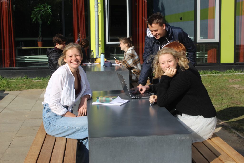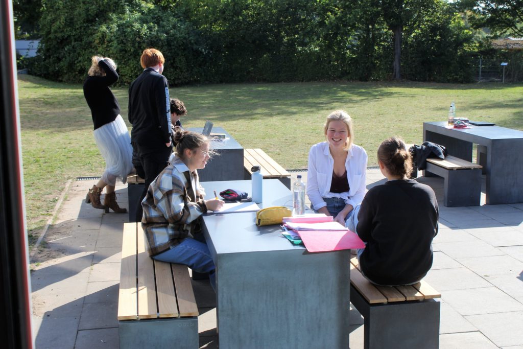 Es dauerte nur kurz, bis sie von unseren Schüler:innen entdeckt und in Beschlag genommen wurden: Vier Sitzgruppen aus Tischen und Bänken laden seit gestern auf der Terrasse vor der Mensa zum Arbeiten, Klönen und Mittagessen ein. In der warmen Spätsommersonne waren die Sitzgruppen schnell belegt.