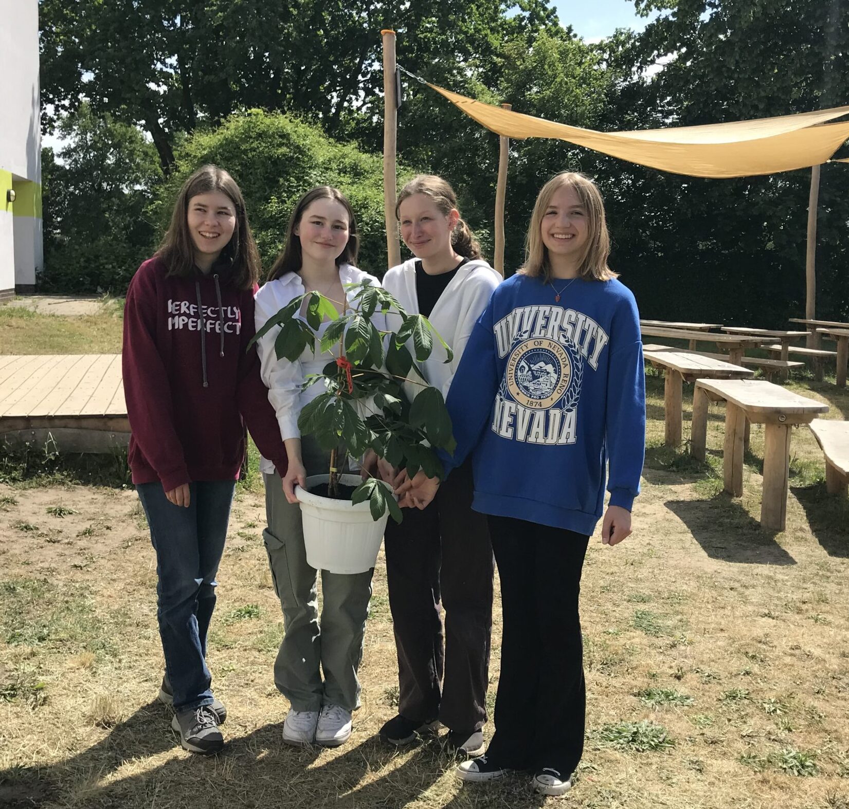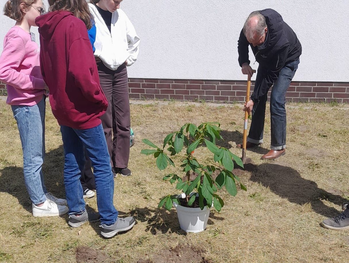 Im Rahmen eines Deutschprojektes hat sich die Klasse 9c mit dem Tagebuch des deutschen Mädchens jüdischer Abstammung Anne Frank beschäftigt. Nele, Phine, Charlotte und Frida haben sich was ganz Besonderes überlegt. Sie pflanzten eine Baum neben der Mensaterasse im Gedenken an die weltberühmte Tagebuchverfasserin. Herr Rother griff selbst zum Spaten, um das Pflanzloch auszuheben.