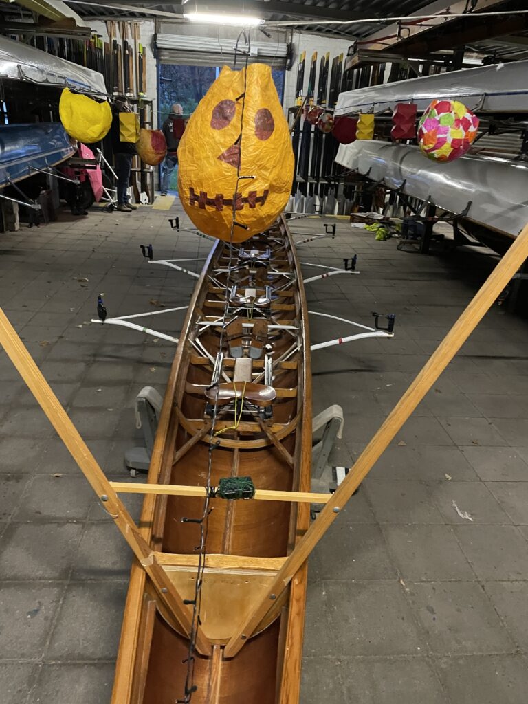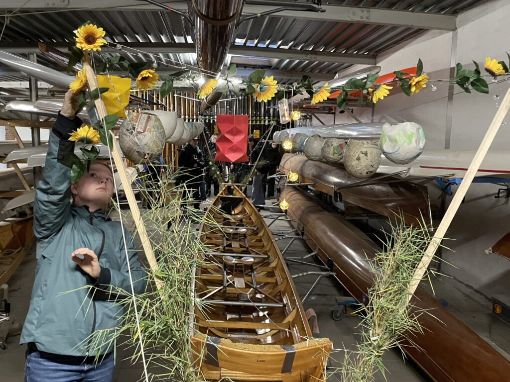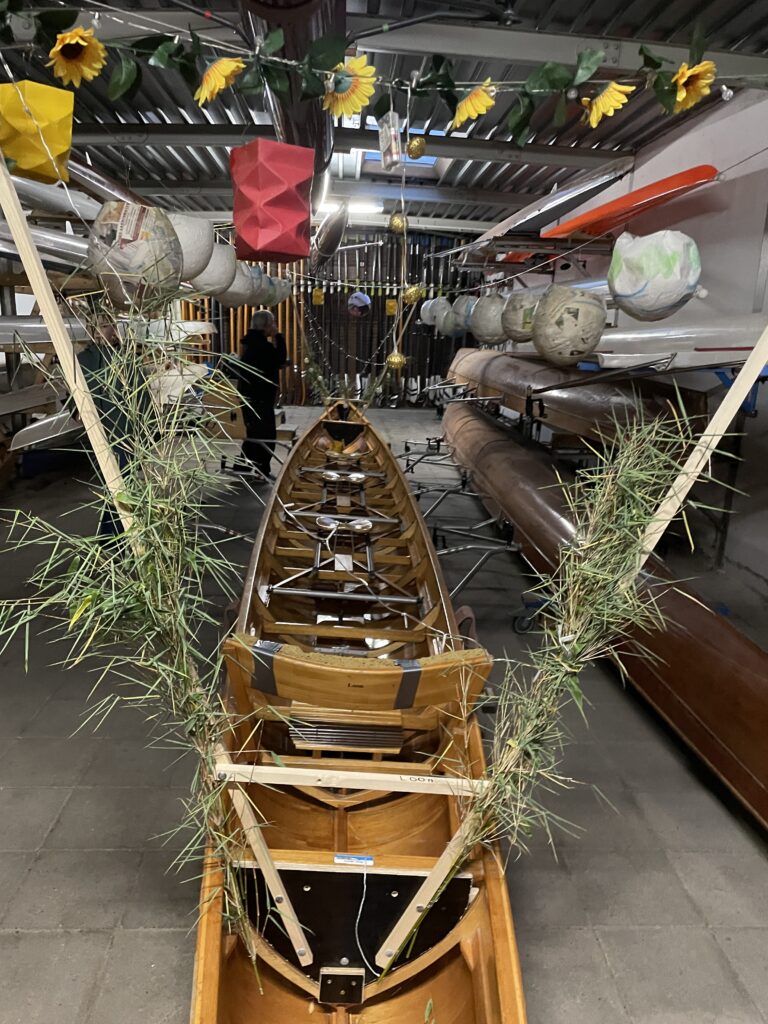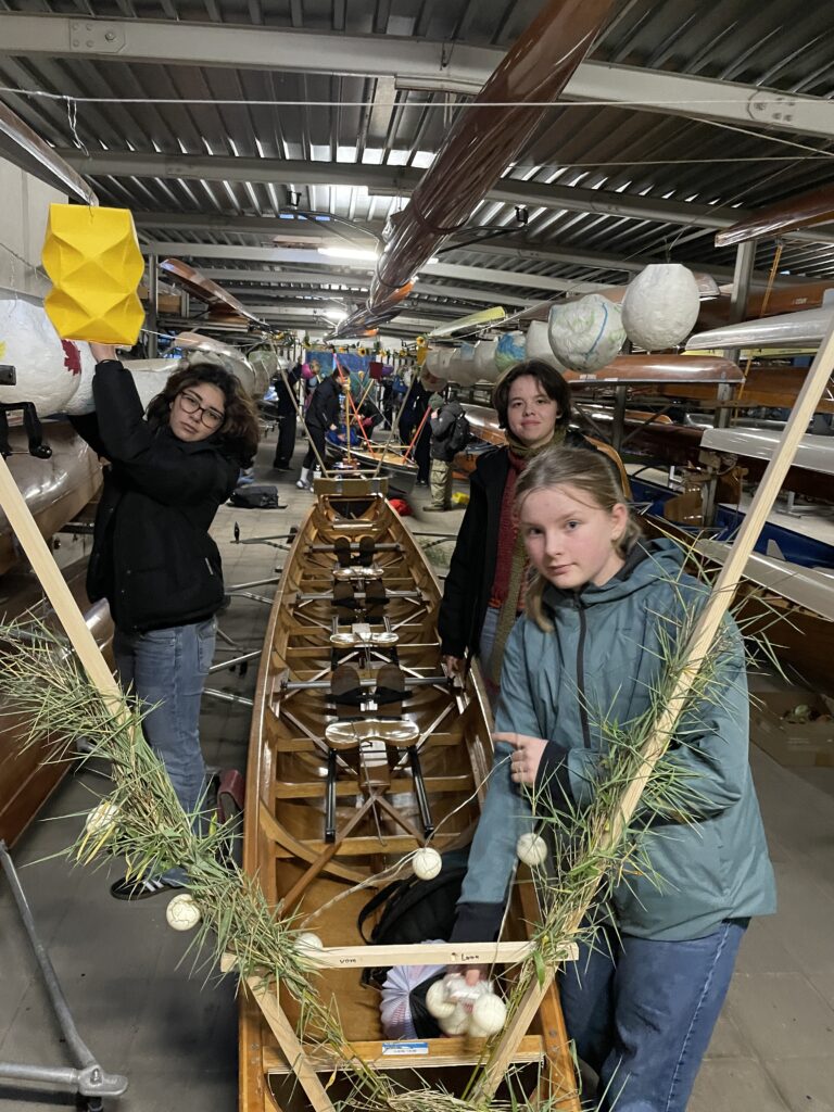 Zwei Wochen nach Ende der Herbstferien findet traditionell die Lampionfahrt der Ruderriegen statt. So hatten einige Schülerinnen und Schüler schon in den Herbstferien begonnen, Lampions zu basteln und sich ein Motto, z.B. Partyboot oder Panda, auszudenken, denn die Kerzen in selbst gebastelten Laternen bringen mehr Helligkeit als Lichterketten oder LED-Teelichte und werden von der Jury höher bewertet. Am 13.11.2025, also einen Tag vor der Lampionfahrt, trafen sich dann die drei Mannschaften der TMS im Ruderhaus, um die Gestelle zu montieren und die Drähte zu spannen, an denen die Lampions aufgehängt werden. Außerdem wurden eine Blumengirlande, Luftballons und Luftschlangen aufgehängt.