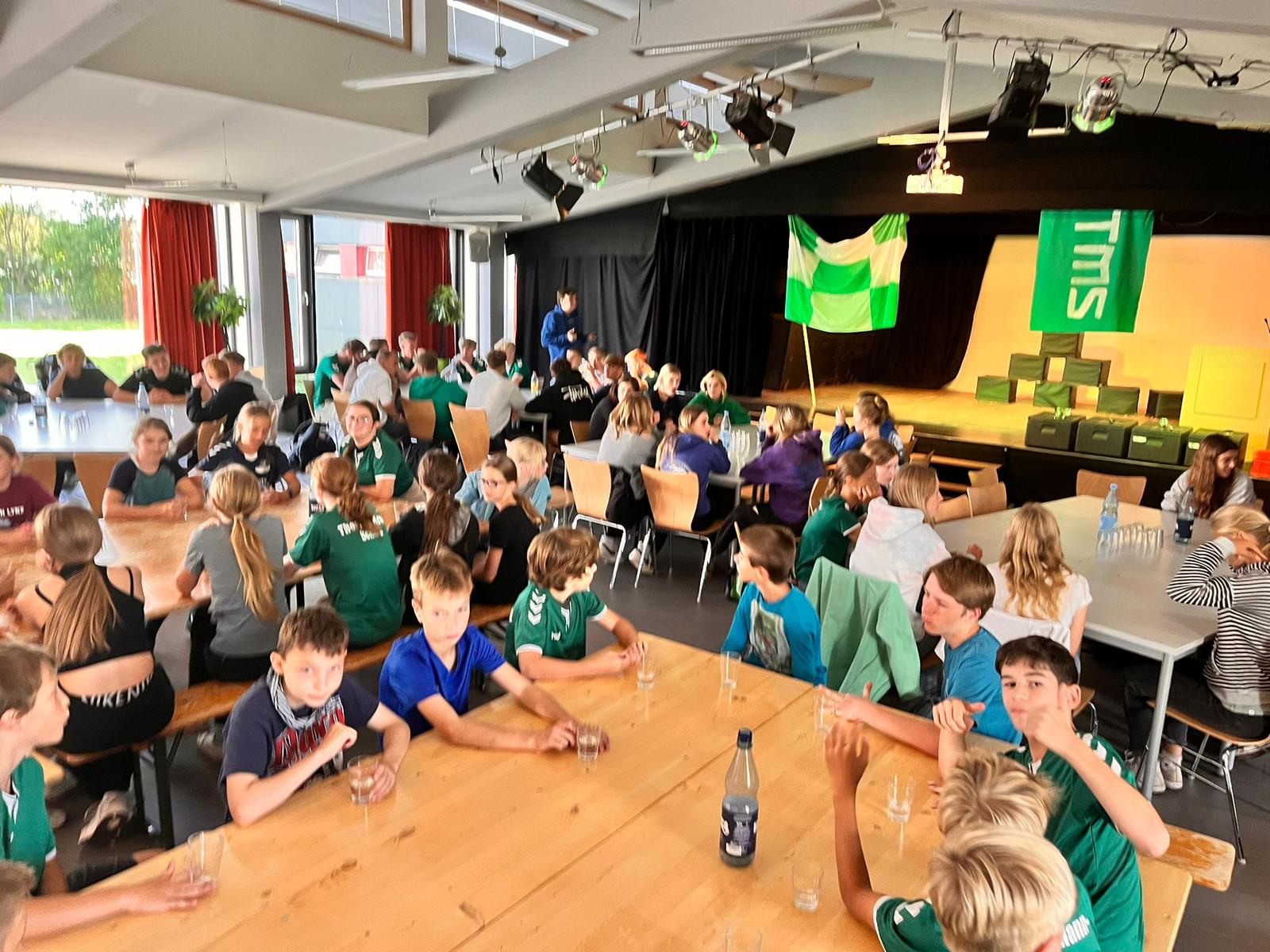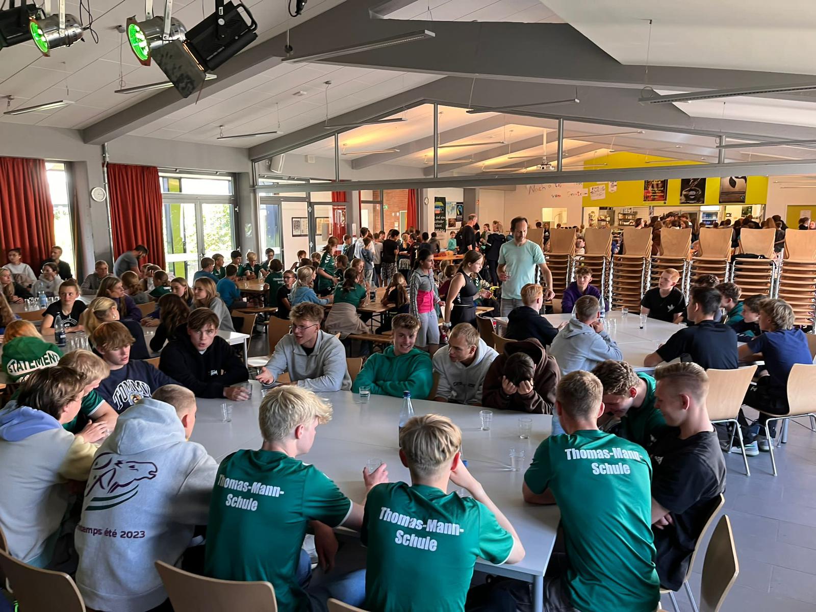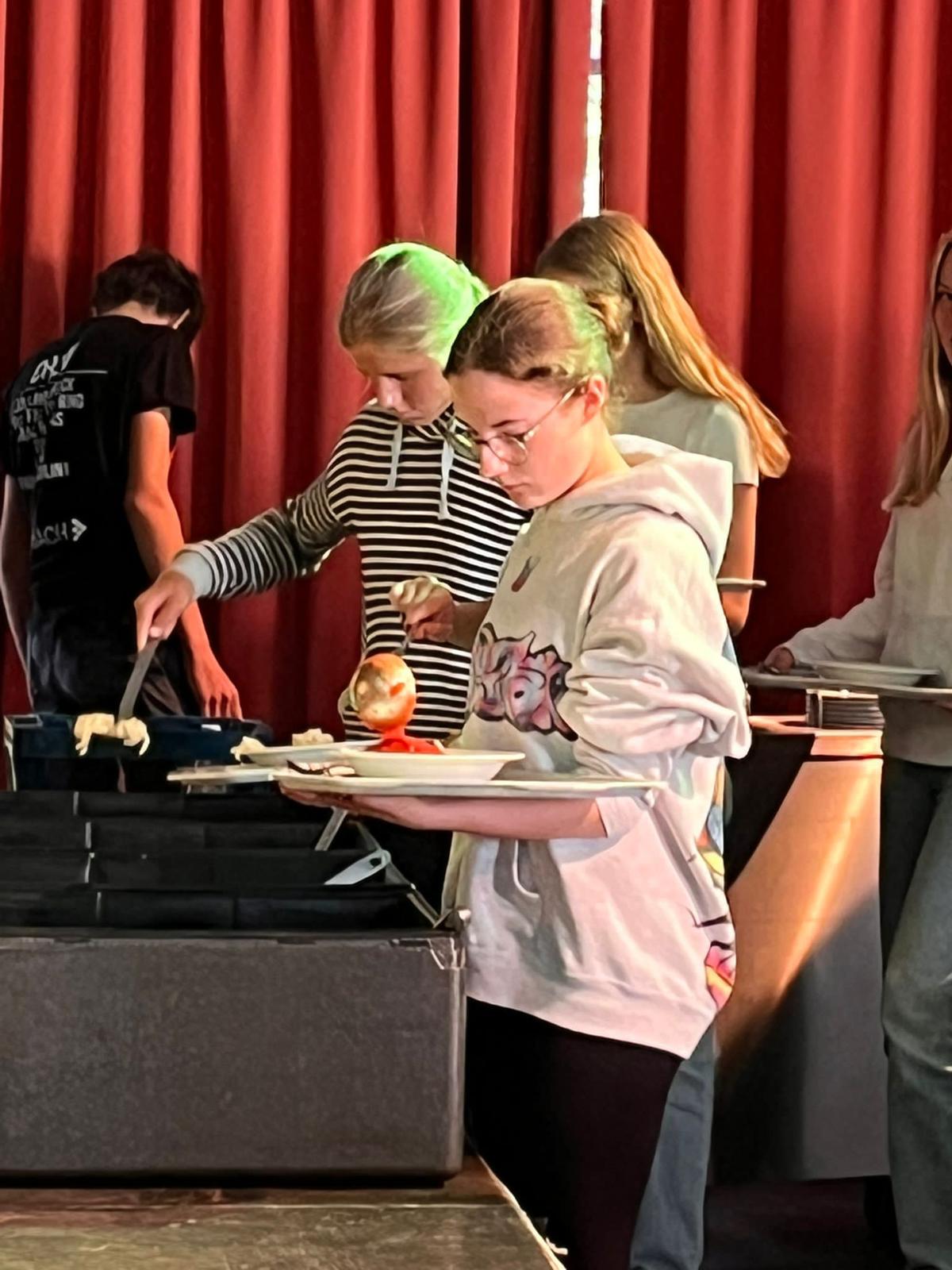 Nach der Vorstellung unsere Staffelläufer ging es für die sechs Teams in der Mensa zum großen “Nudelbuffet”. Warum Nudeln? Nudeln bestehen aus Kohlenhydraten und liefern dem Körper Energie, und davon benötigen die Läufer für den morgigen Staffellauf besonders viel.