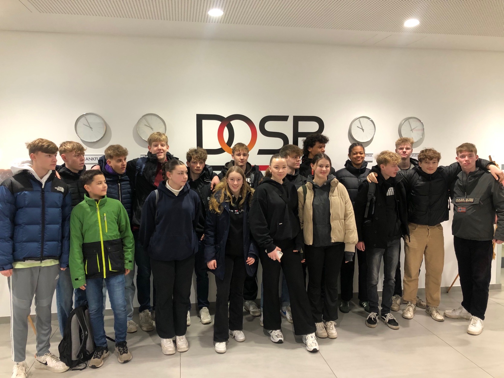 Trotz der nächtlichen Uhrzeit (6 Uhr) schaffte es das gesamte Sportprofil, sich am Mittwoch, dem 15.02., pünktlich zu treffen, um zum Deutschen Olympischen Sportbund (DOSB) – dem Dachverband des deutschen Sports – nach Frankfurt a.M. zu fahren. Eine erste kleine Schrecksekunde ließ nicht lange auf sich warten: Es blieb eine Tasche beim Zugumstieg liegen – zwar noch auf dem Bahnsteig bemerkt und doch unerreichbar. Die Tasche fuhr nach München weiter. Das Problemchen ließ sich untereinander und mit einem eingeschobenen Aufenthalt in Frankfurt-City lösen.