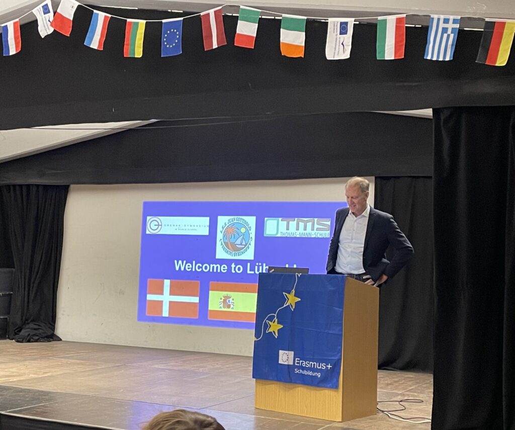 Den Auftakt machte das Treffen vom 26.11. – 2.12.2023 an unserer Schule. Schulleiter Dirk Rother machte in seiner Begrüßungsrede auf die 17 Nachhaltigkeitsziele der UN aufmerksam, von denen sich allein drei auf sauberes Wasser, einen schonenden Umgang mit dieser Resource und den Schutz des Lebens darin beziehen.
