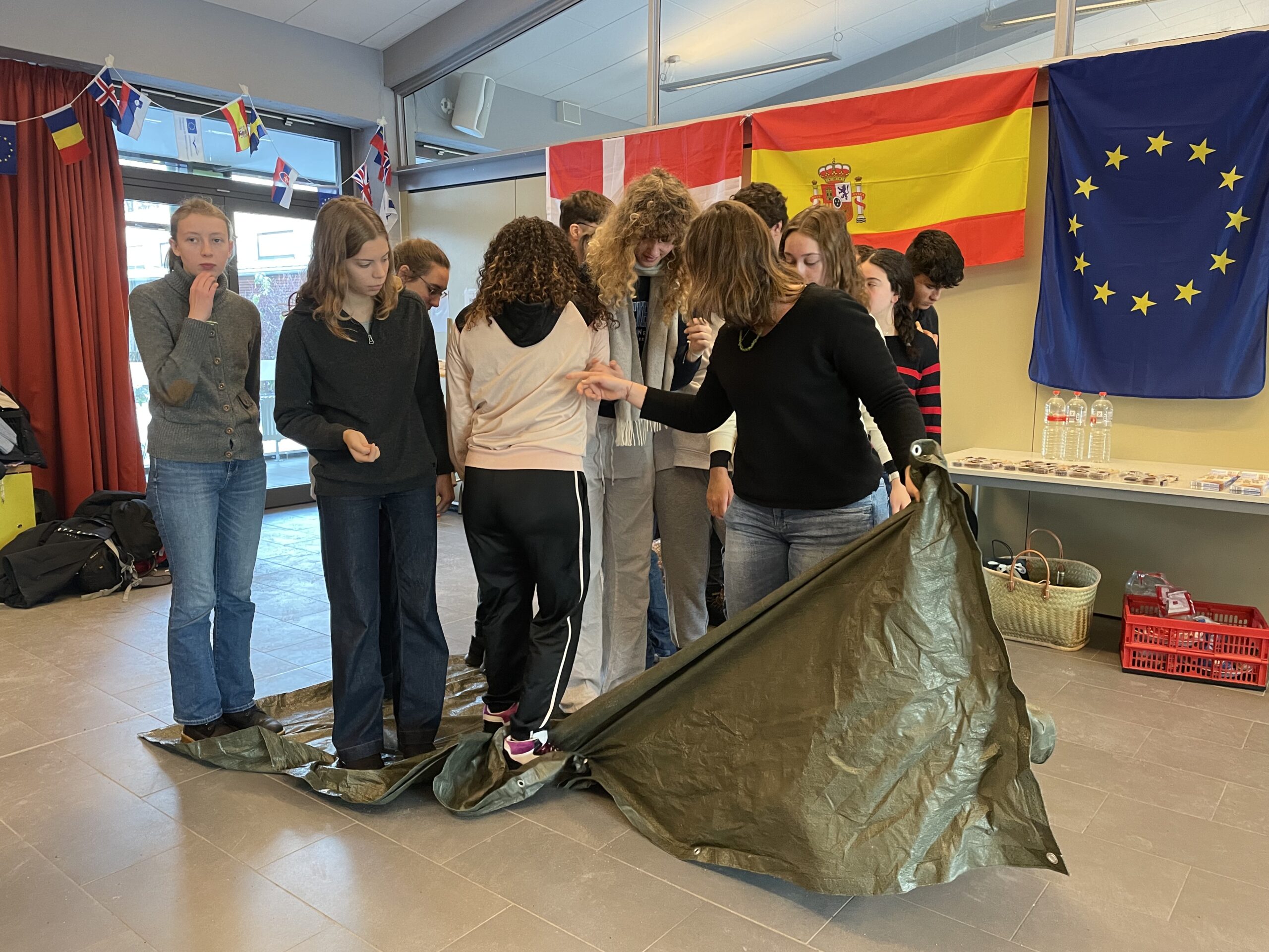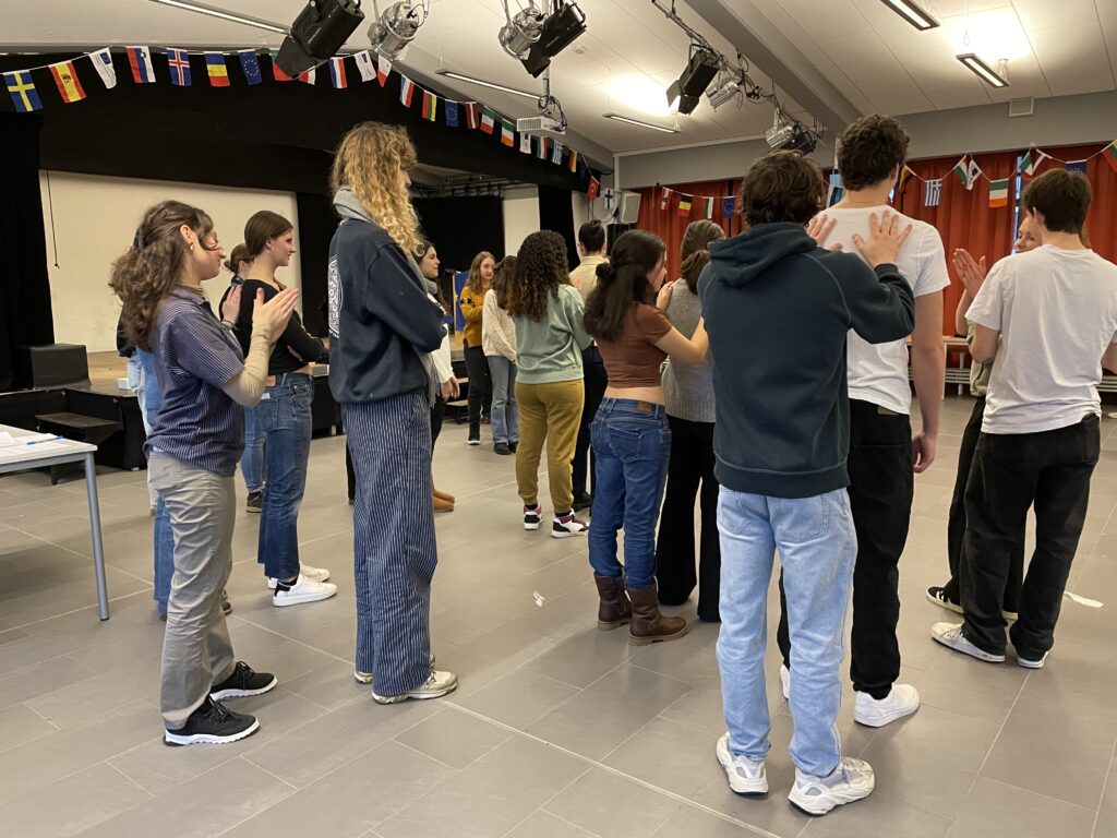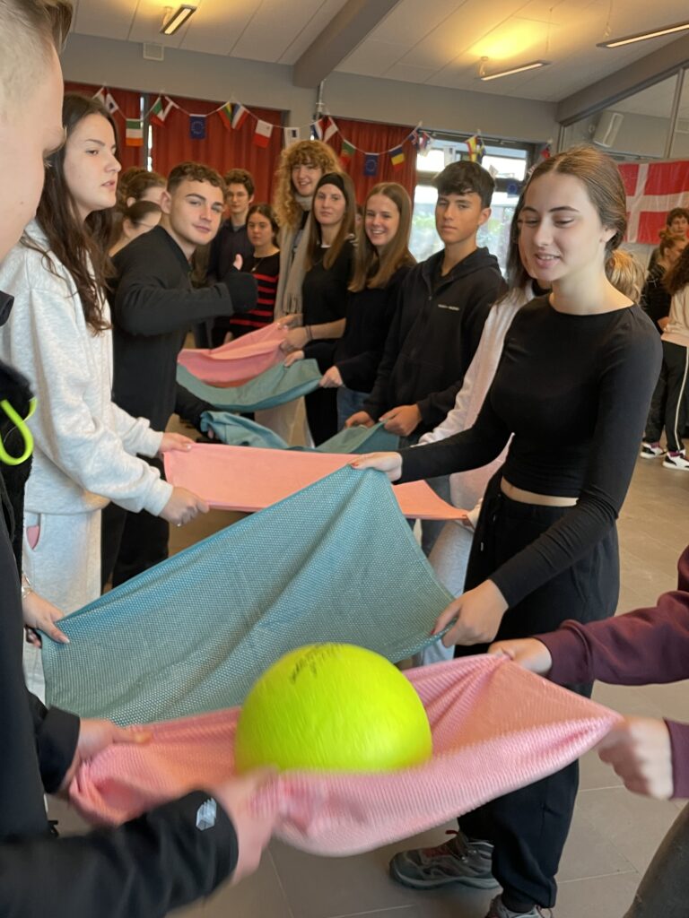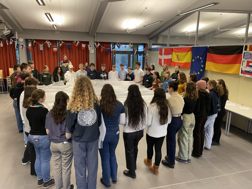 40 Schülerinnen und Schüler im Alter von 15 – 18 Jahren aus Spanien, Dänemark und unserer Schule stehen im Kreis und bewegen eine Plane gemäß den „Wetteransagen“ von Kirsten Engler, Lehrerin für Darstellendes Spiel.