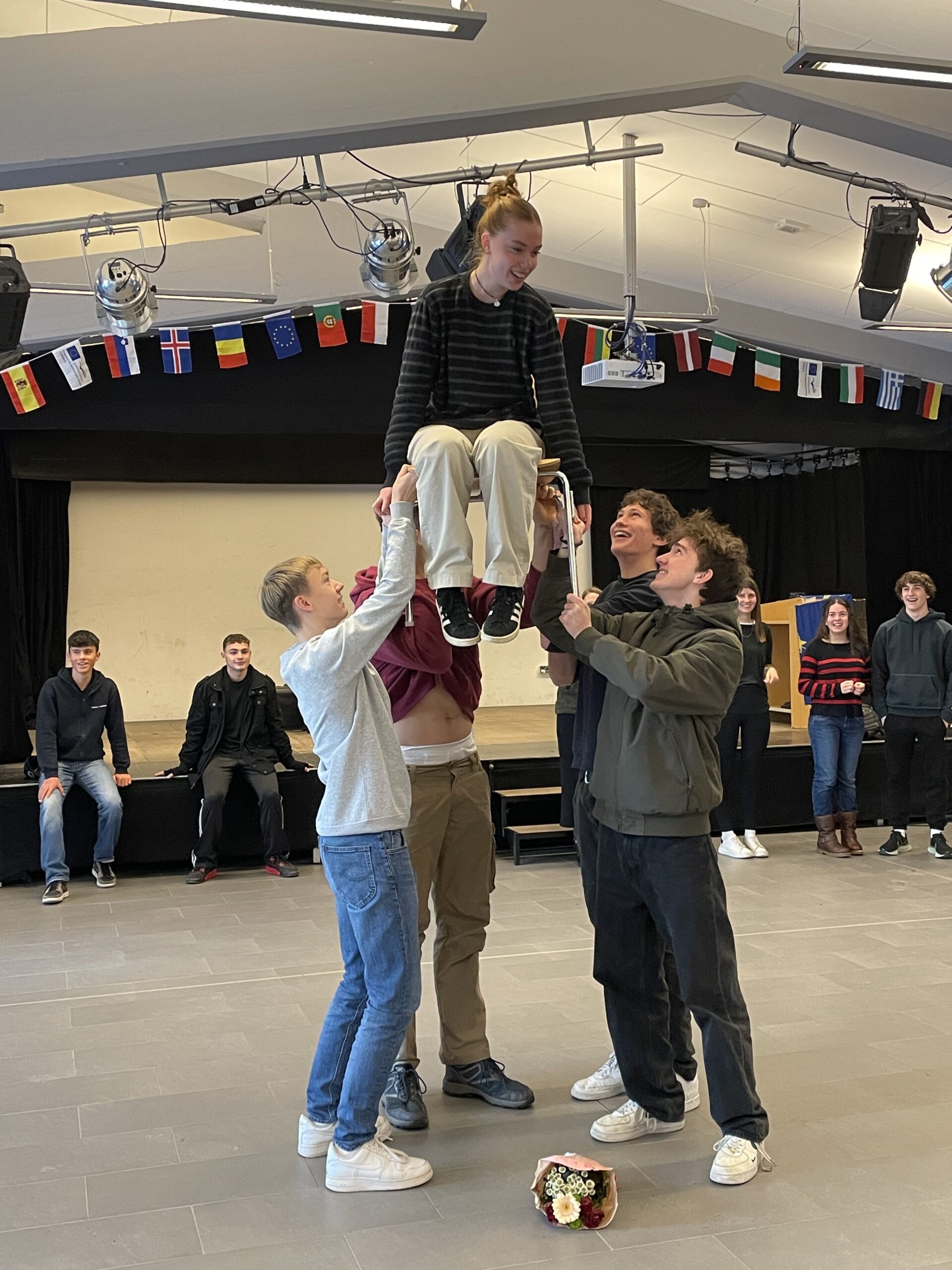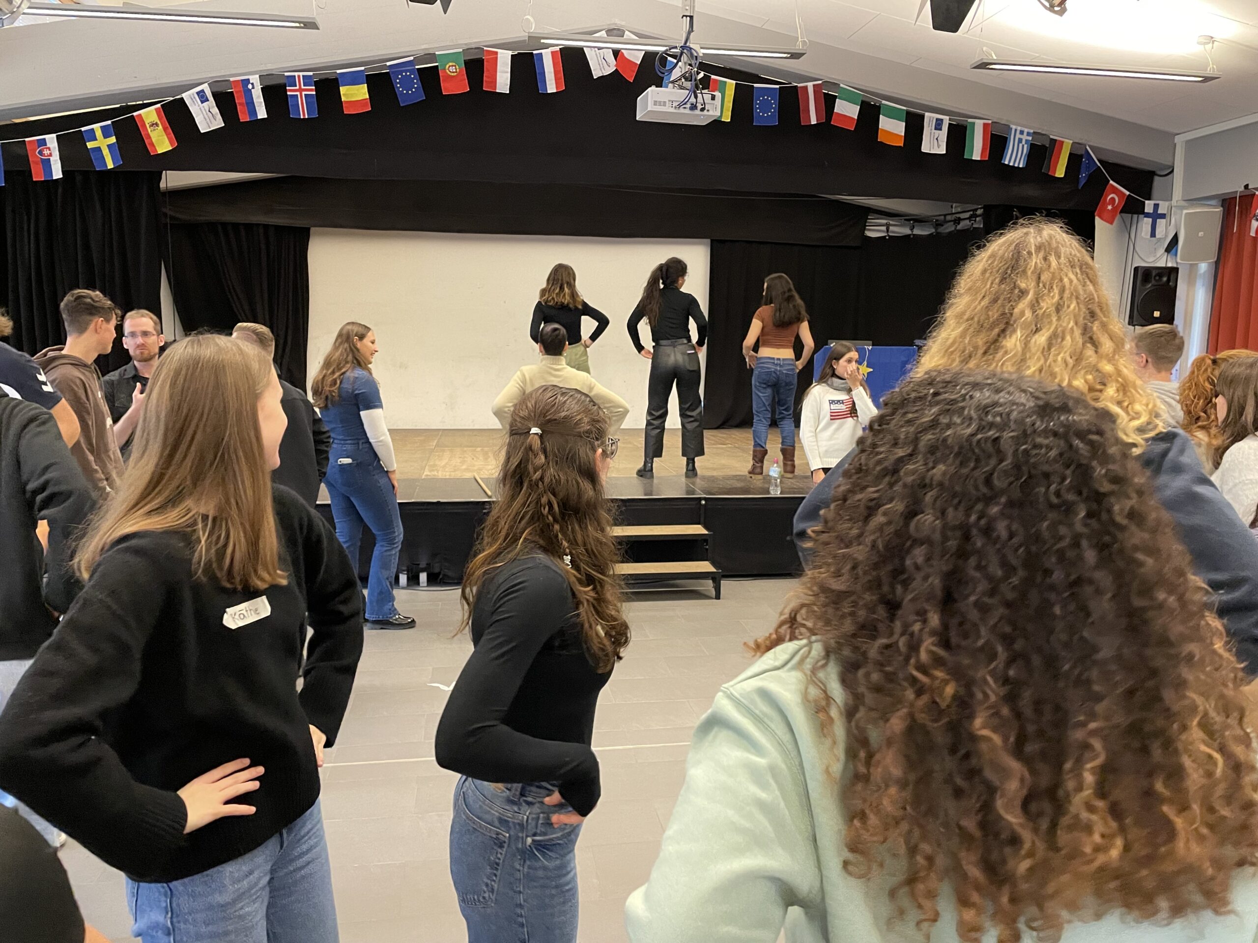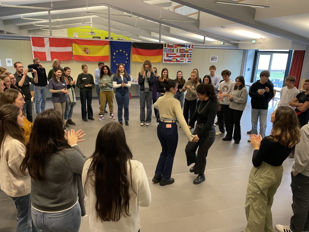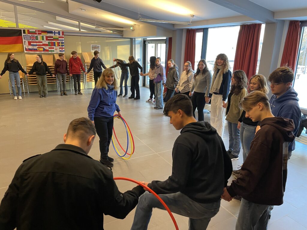 40 Schülerinnen und Schüler im Alter von 15 – 18 Jahren aus Spanien, Dänemark und unserer Schule stehen im Kreis und bewegen eine Plane gemäß den „Wetteransagen“ von Kirsten Engler, Lehrerin für Darstellendes Spiel.