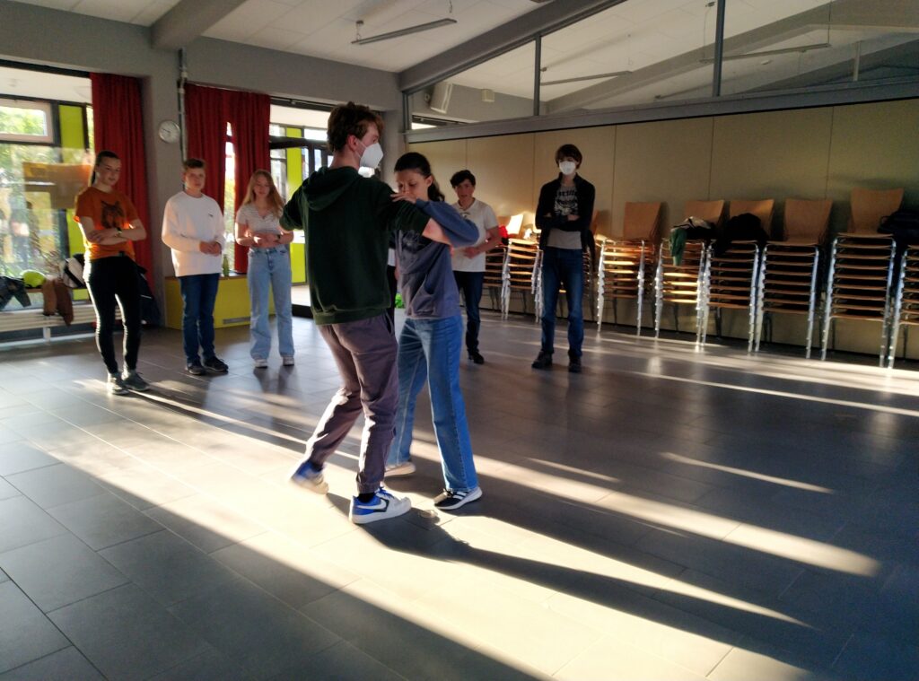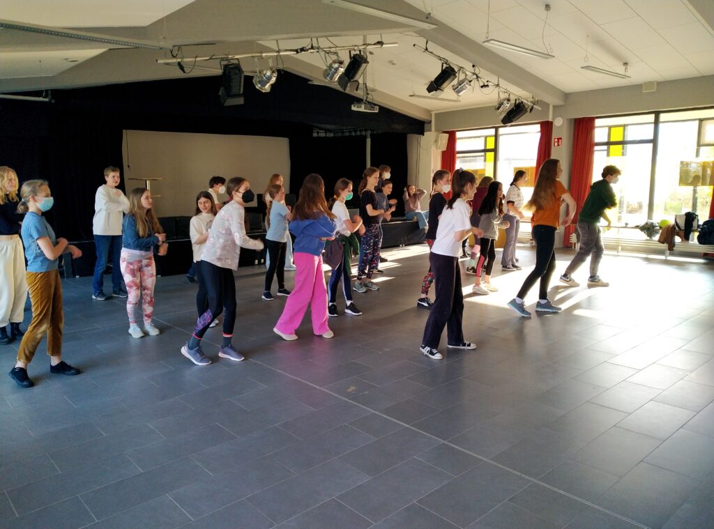 Schon im Vorfeld hatten sich einige Schülerinnen und Schüler aus der Oberstufe gemeldet, um in der AG mitzuhelfen – und sie hatten gleich noch weitere Freunde angeheuert und mitgebracht. Wir waren alle neugierig: Wer würde am ersten Tanzabend kommen? Wie viele würden wir werden? Und auf einmal waren mehr als 25 Tanzbegeisterte aus unterschiedlichsten Klassen in der Aula versammelt.