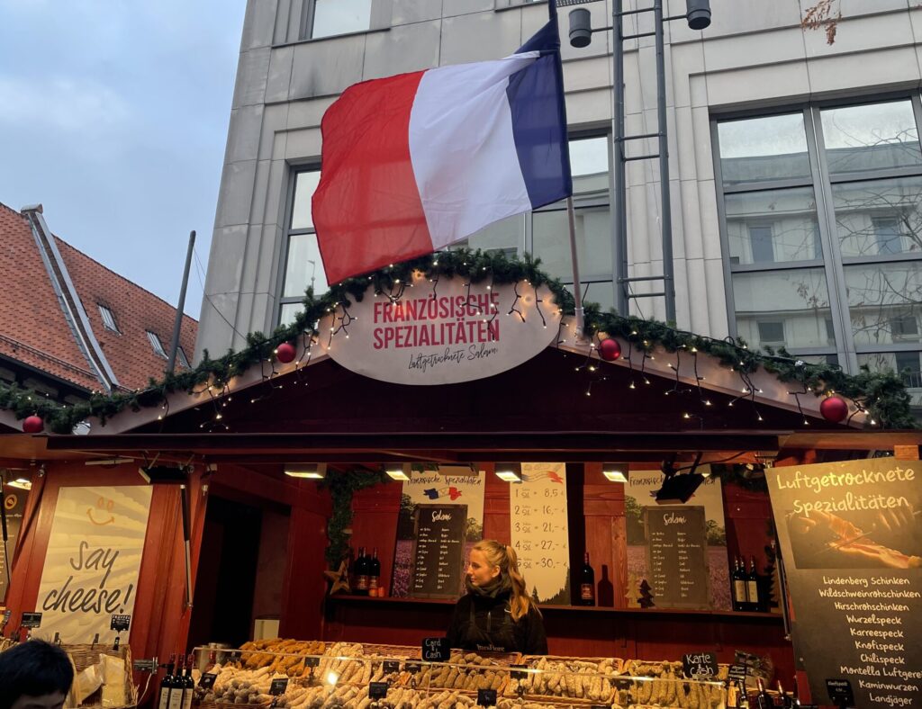 An den festlich geschmückten Marktständen kamen die Schülerinnen und Schüler mit den Händlerinnen und Händlern ins Gespräch und stellten schnell fest, wie international das Angebot ist. Pilze stammten aus Polen, frischer Lachs aus Norwegen, Mandeln aus Spanien. Wurst- und Käsespezialitäten kamen sowohl aus Österreich als auch aus Frankreich. Außerdem entdeckte die Gruppe Produkte aus der Ukraine sowie Gewürze aus aller Welt.