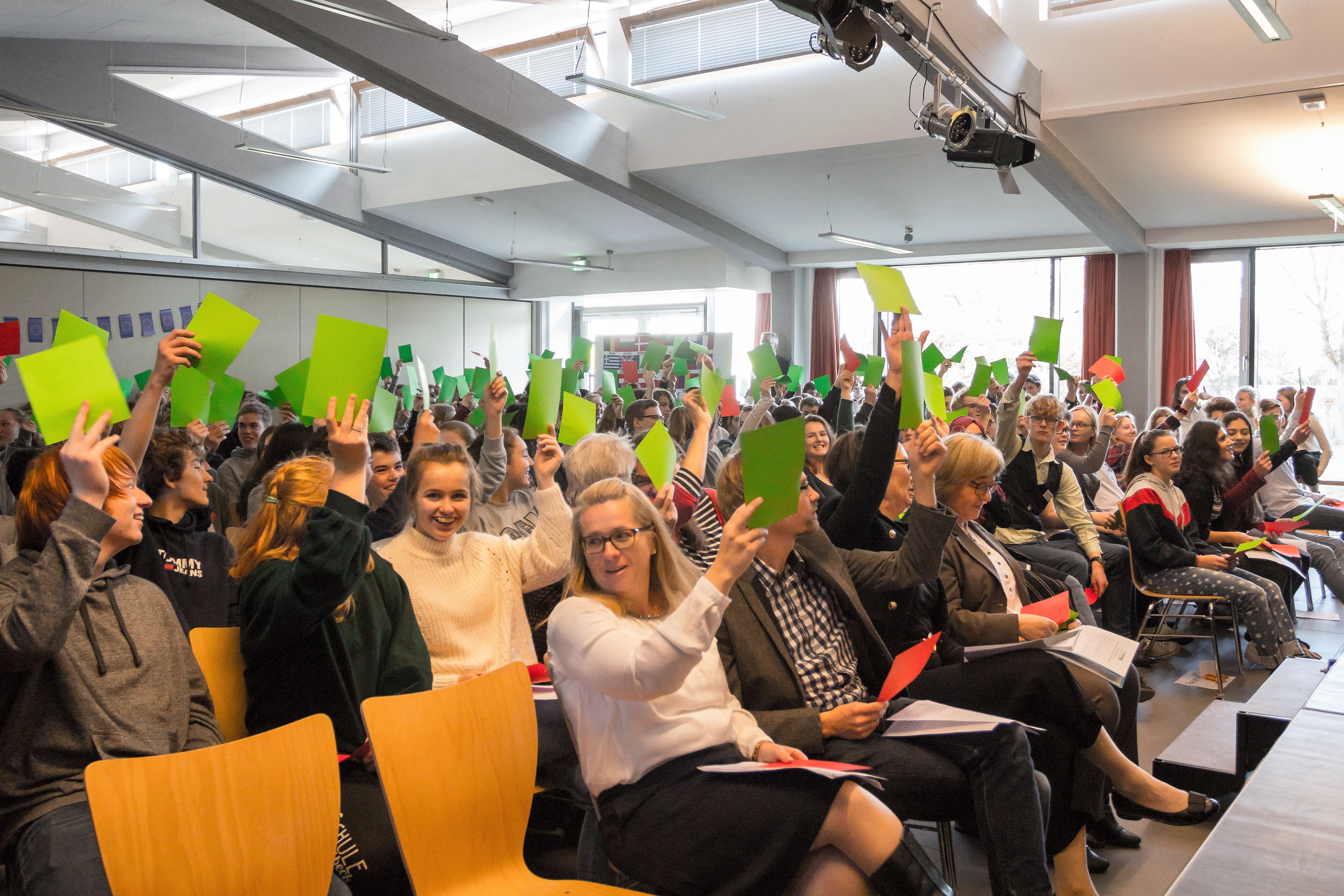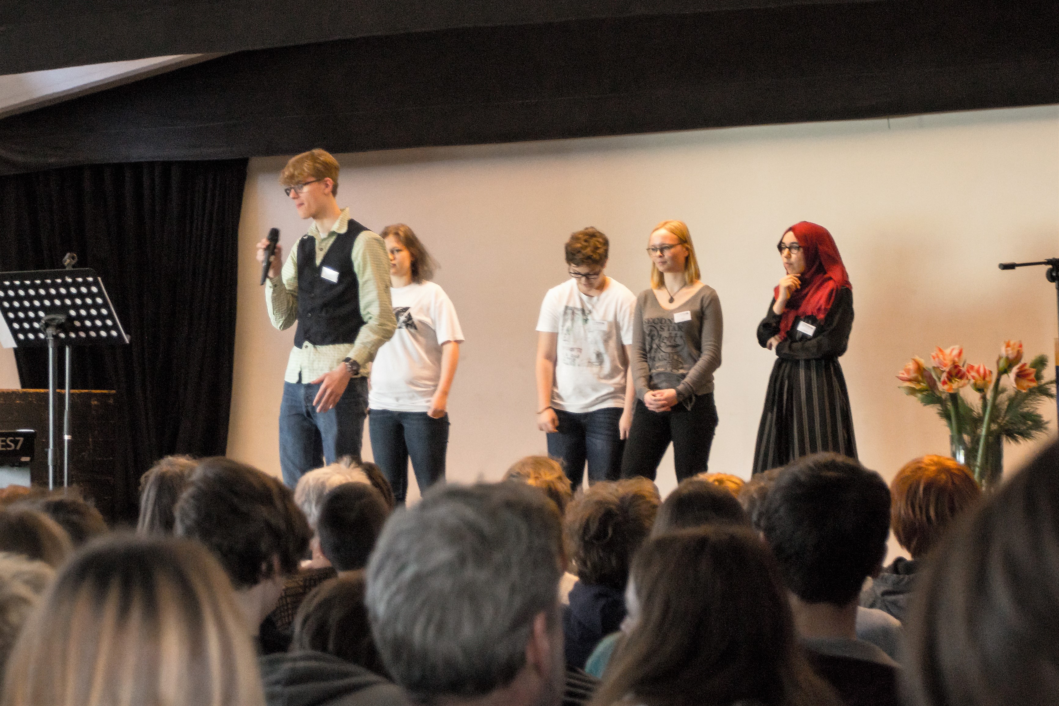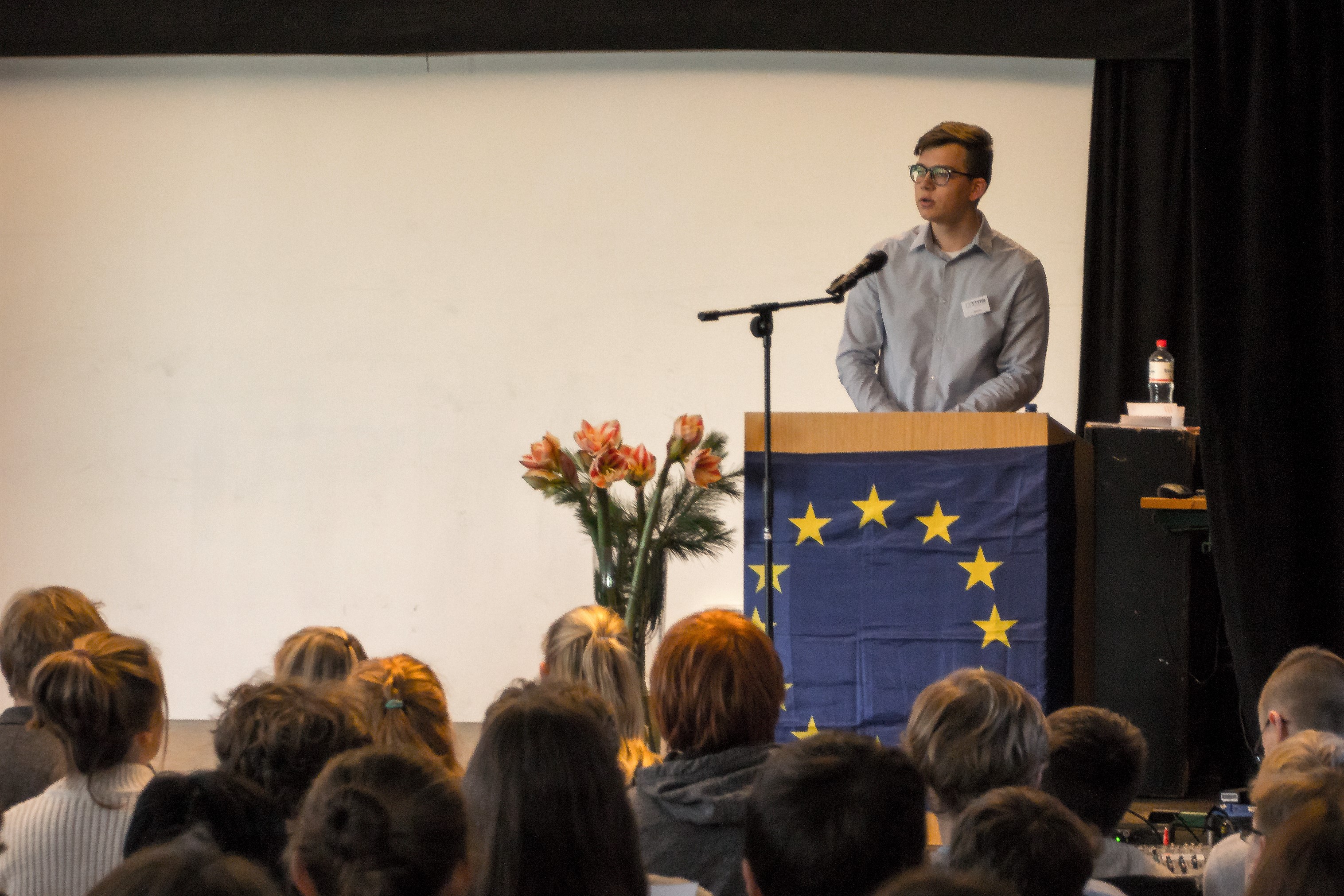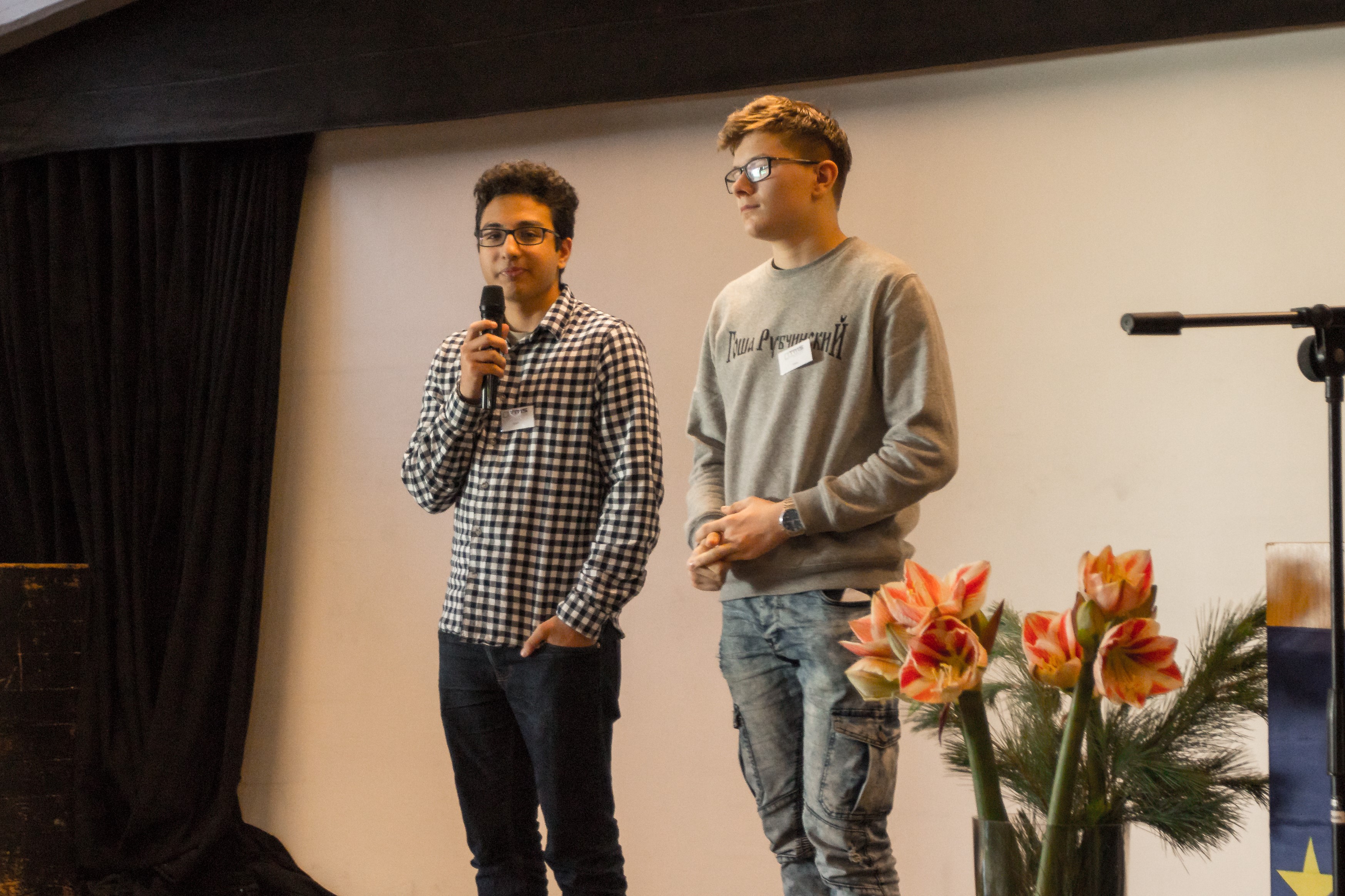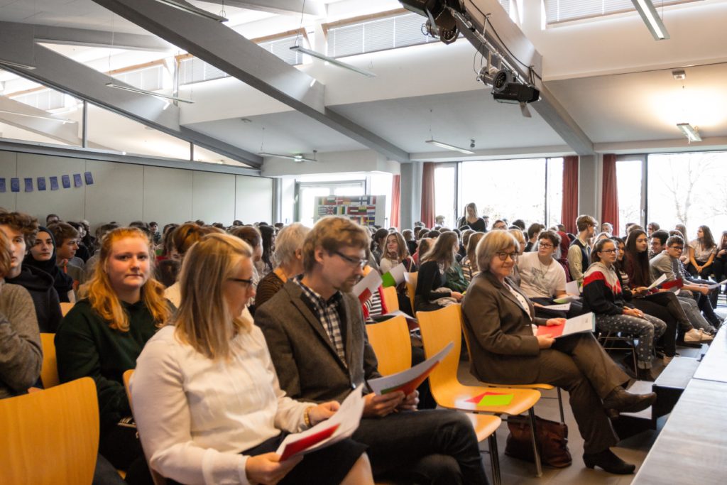 Eingeladen zu der Veranstaltung hatten die 18 Juniorbotschafter unserer Schule, d.h. Schülerinnen und Schüler der Europa-AG, und ihre vier betreuenden Lehrkräfte, die sogenannten Seniorbotschafter. Als Gäste saßen Elternvertreter, die Klassenkameraden der Juniorbotschafter und Lehrkräfte im Publikum, das in die Feier einbezogen wurde und im Verlauf einige Aufgaben lösen musste.