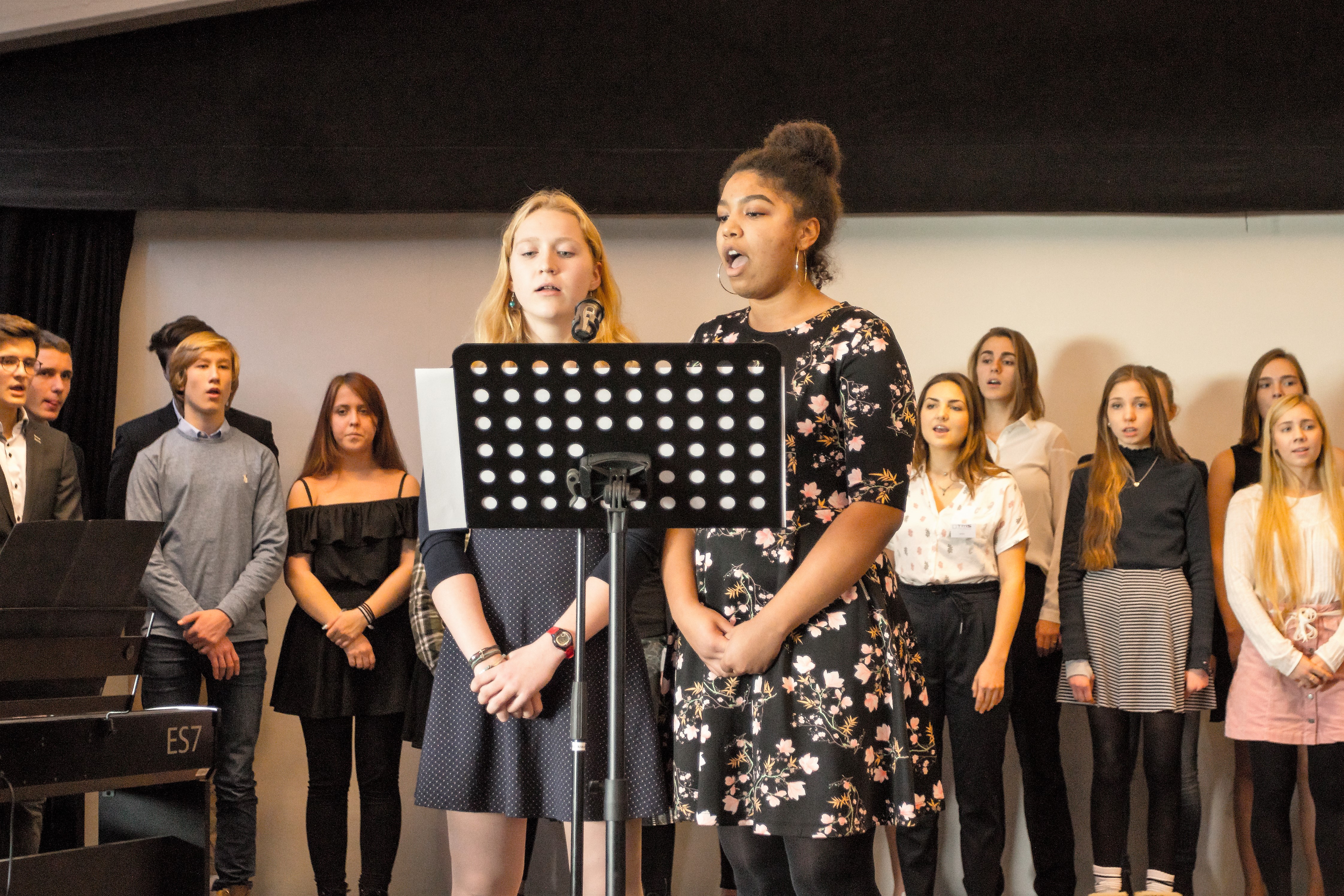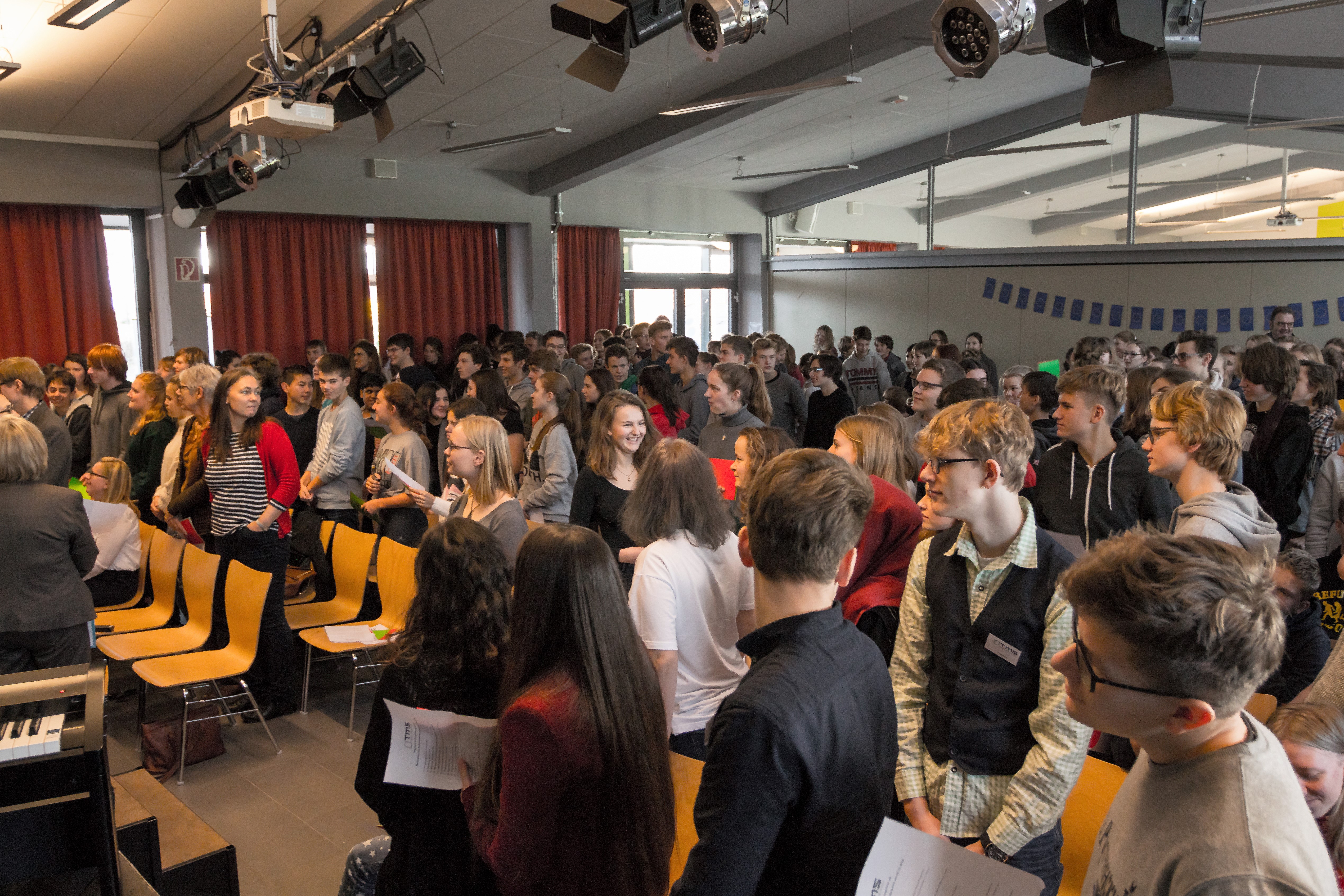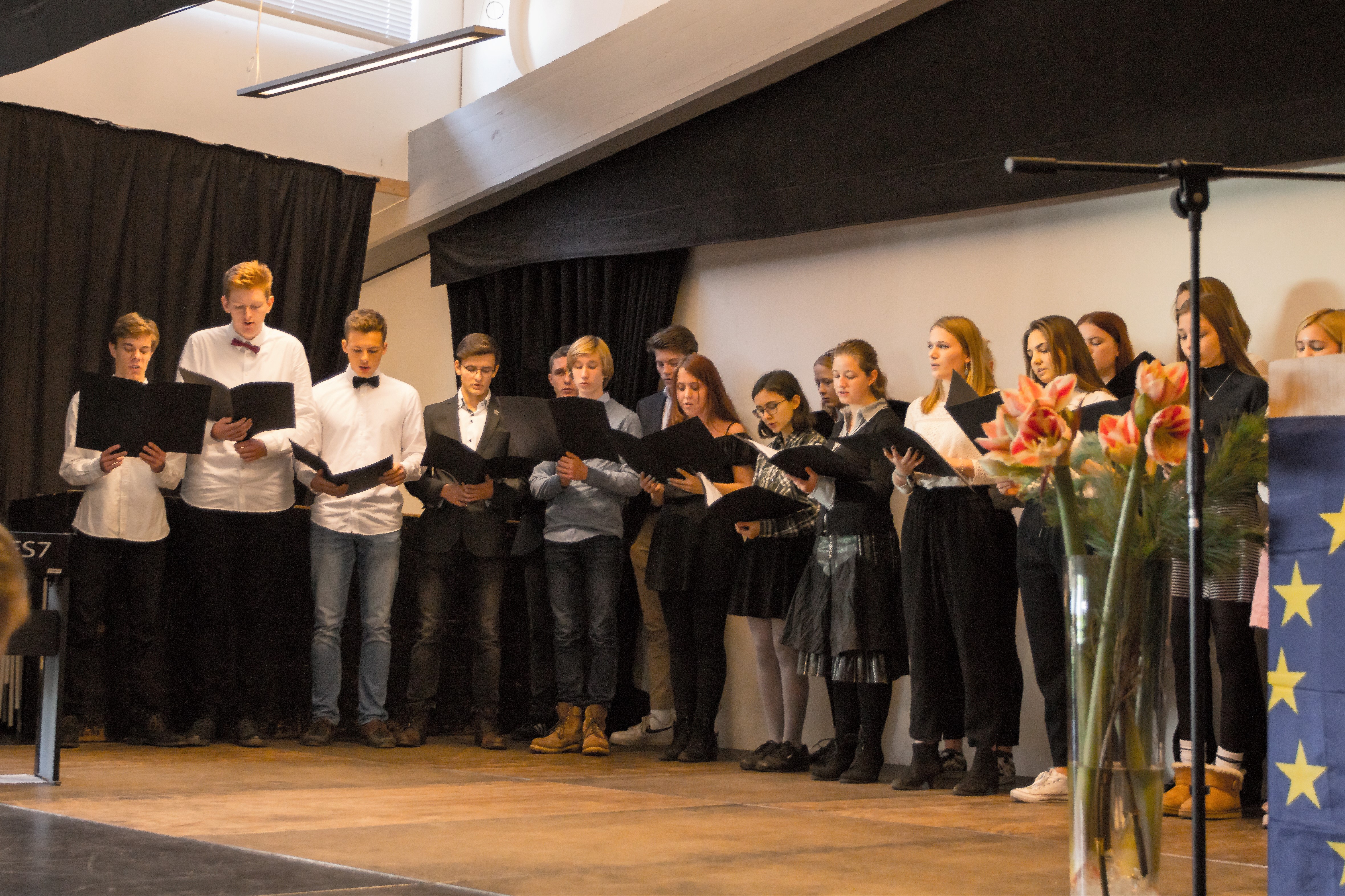 Mit der Europahymne, der „Ode an die Freude“, stimmte der Oberstufenchor unter der Leitung von Tilman Kracke, in das Thema ein und forderte die Anwesenden zum Mitsingen auf.