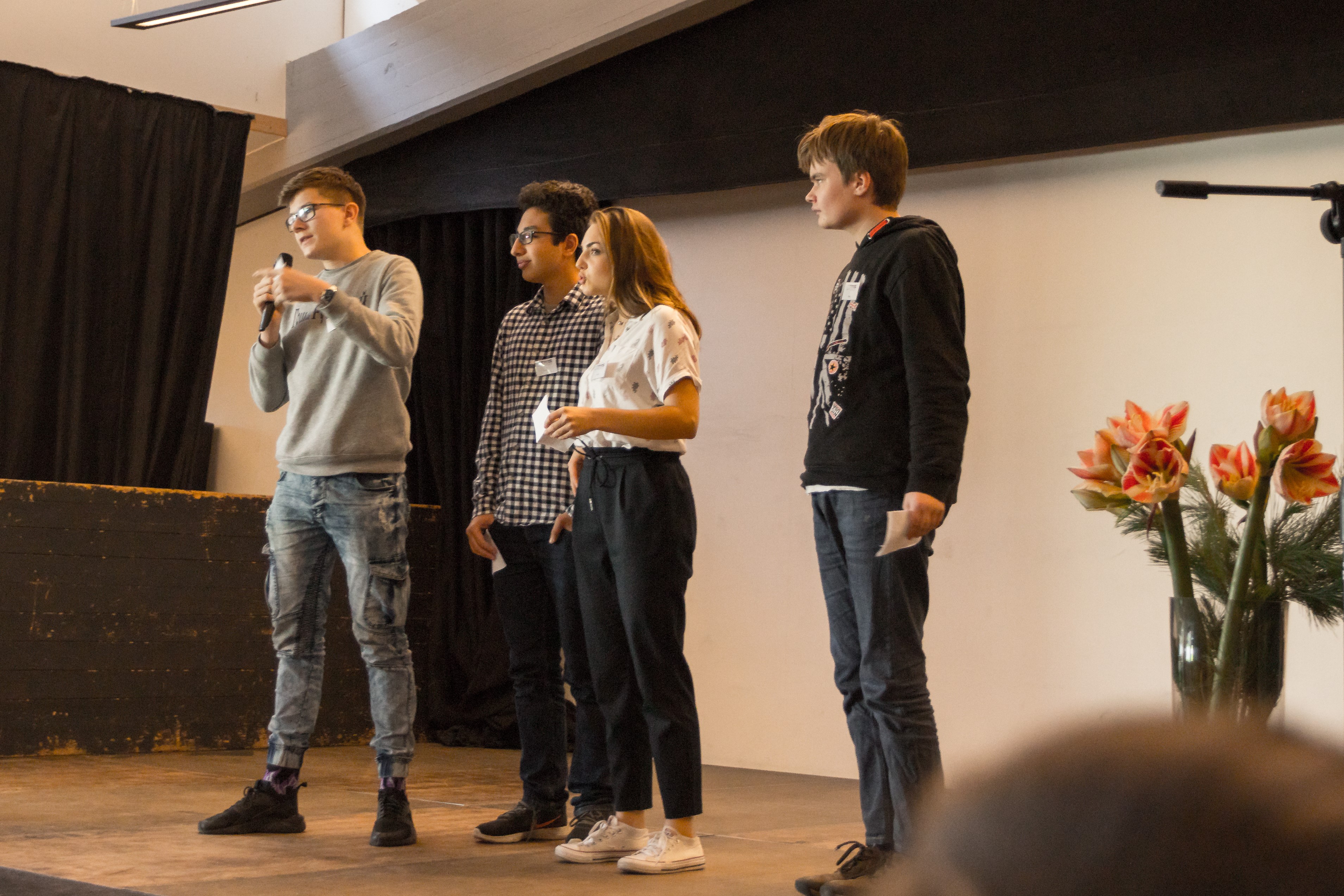 Frederick, Lara F., Lara R., Helen und Sümeyye trugen vor, welche Errungenschaften der EU sie persönlich für wichtig erachten.
