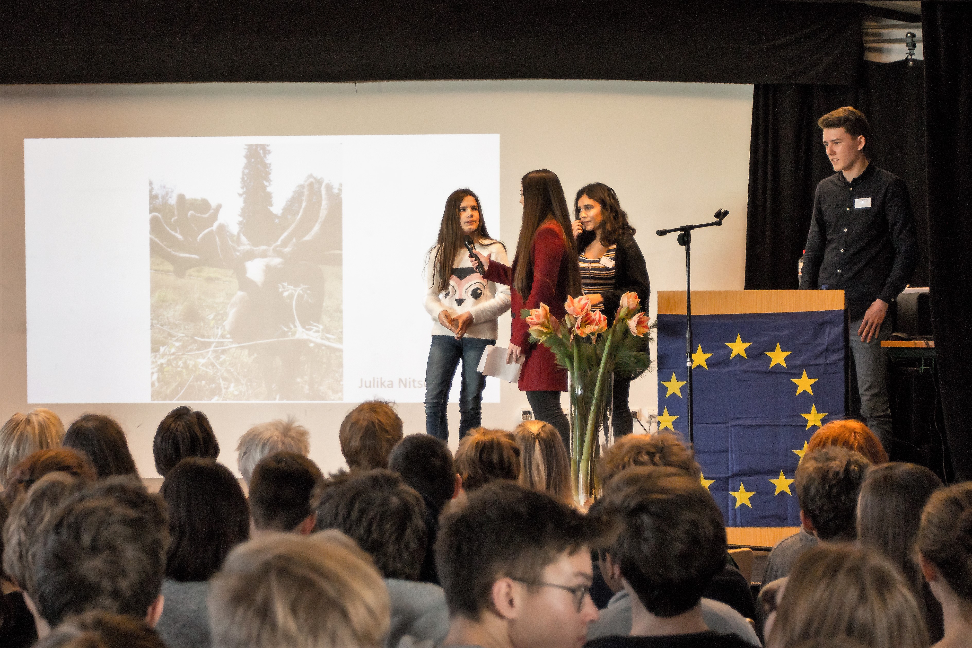 Die Gewinner des Fotowettbewerbs „Mach dir dein eigenes Bild von einem Land Europas“ wurden anschließend von Fynn, Dharma und Cansu ausgezeichnet. Die Aufgabe hatte darin bestanden, ein Foto einzusenden, das etwas Typisches für ein Land zeigt. Julika aus der 6a gehörte zu den Gewinnern. Sie hatte einen Elch fotografiert, den sie mit Schweden verbindet.