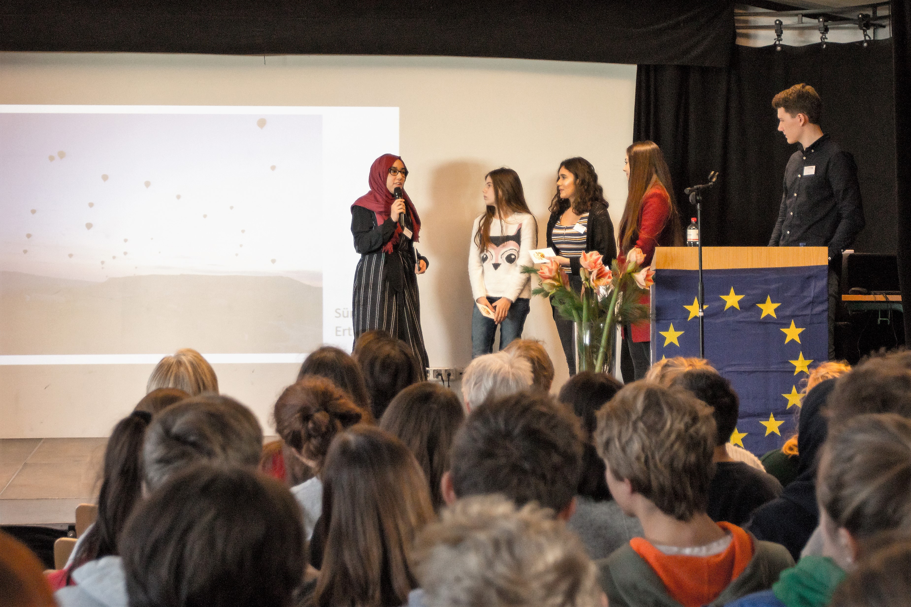 Ein Cartoon des Zeichners Gerhard Glück, der in Anlehnung an das Märchen „Sterntaler“ die personifizierte Europa zeigt, wie sie in Erwartung, dass die Sterne der EU-Flagge als Taler vom Himmel fallen, die Schürze öffnet, diente als Überleitung zum nächsten Teil der Feier. Die Juniorbotschafter Sümeyye, Lara R., Lara F. und Helen stellten die Errungenschaften der Europäischen Union vor, die sie persönlich am wichtigsten finden. Der europaweit einheitliche Notruf gehörte dazu, aber auch die Zollfreiheit durch den Binnenmarkt, die Abschaffung der Roaminggebühren und die Niederlassungsfreiheit für Arbeitnehmer und Unternehmen.