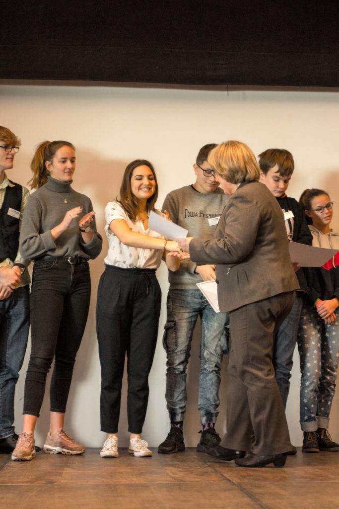 Insbesondere für die Fahrt nach Brüssel zum European Youth Event, die er mit zwölf Juniorbotschaftern zwei Tage später antreten werde, sei die Vorbereitung vorbildlich. Mit diesen Worten leitete der Redner zur Verleihung der Zertifikate an die 18 Juniorbotschafter über, die Frau Rodust dann vornahm.
