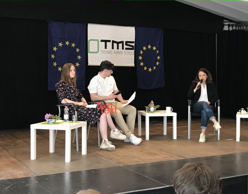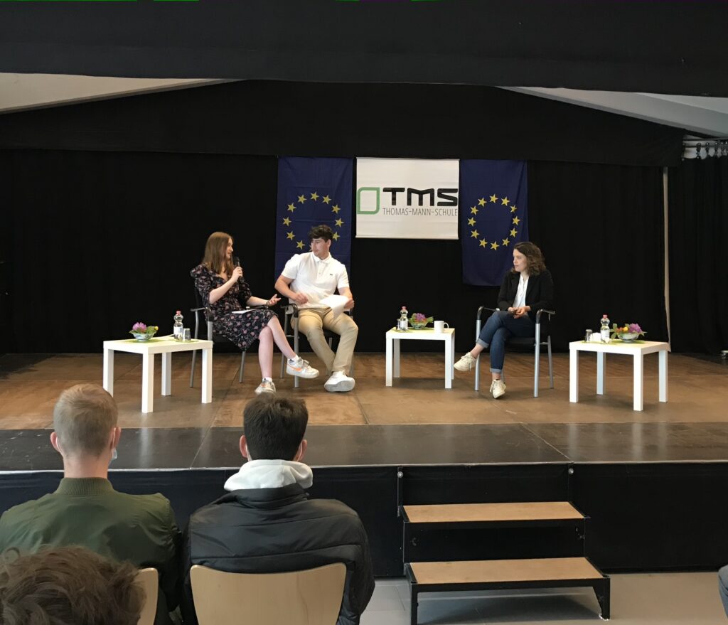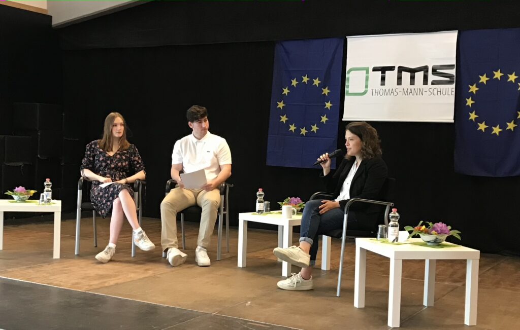 Anlässlich des Europatages traf die schleswig-holsteinische Europaabgeordnete Delara Burkhardt (SPD) mit unseren Juniorbotschaftern des EP und den Schülerinnen und Schülern der Klassen Q1a und Q1e zusammen. Moderiert von den Schülern des WiPo-Profils Luisa und Malik diskutierte sie über die Umwelt- und Flüchtlingspolitik der Europäischen Union.