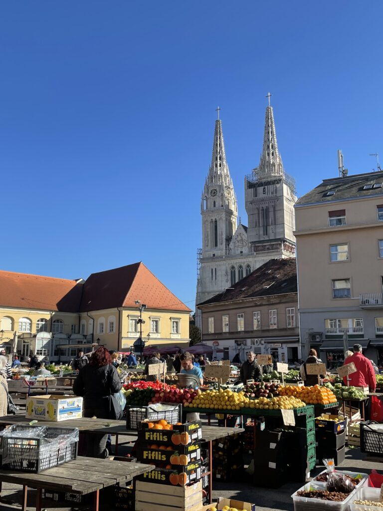 Wir fuhren mit dem Bus erst durch den neueren Teil der Stadt und dann durch den älteren, an vielen alten und historischen Gebäuden vorbei in das Zentrum Zagrebs. Im Jahr 2020 erschütterte ein Erdbeben die Stadt, weshalb viele Gebäude erneuert oder repariert werden müssen. Unsere Tour zu Fuß durch die Stadt startete auf dem Markt. Dort werden jeden Tag die Stände aufgebaut und frisches Obst und Gemüse verkauft.