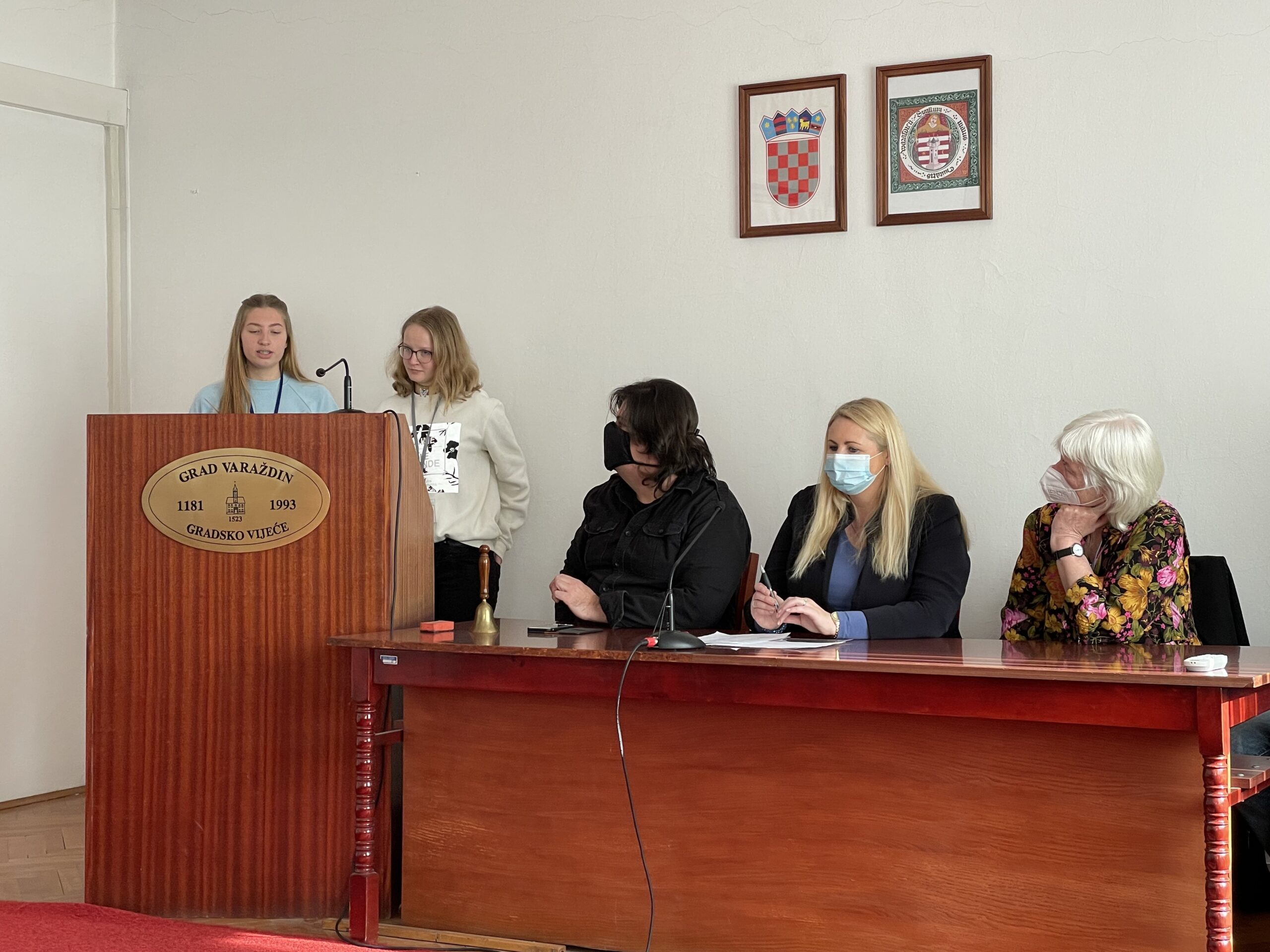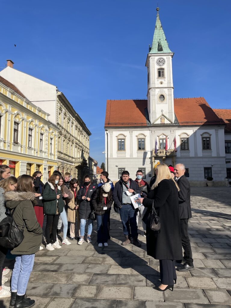 Gleich im Anschluss gingen wir ins Rathaus und wurden dort von einem Mitarbeiter begrüßt, welcher uns durch das Rathaus und seine verschiedenen Räume führte. Im Eingang gab es einen animierten Film über die Geschichte Varazdins und traditionelle Festivals, wie das „Spancirfest“, bei welchem bis zu 300.000 Menschen auf den Straßen Varazdins sind – sehr viel für eine Stadt mit etwa 50.000 Einwohnern. Im Ratssaal haben wir die Ergebnisse unserer Workshops vom Dienstag vorgestellt. Dafür kamen wir an das Rednerpult und erklärten etwas über Demokratie auf schulischer, lokaler und nationaler Ebene. Wir fanden viele Gemeinsamkeiten, aber auch Unterschiede. So existiert z.B. nur in Lübeck ein Stadtschülerparlament. Bei der Abschlusszeremonie, die am Nachmittag in der Schule stattfand, erhielten alle Teilnehmer Zertifikate. Mit spanischen und deutsche Süßigkeiten endete das Programm.