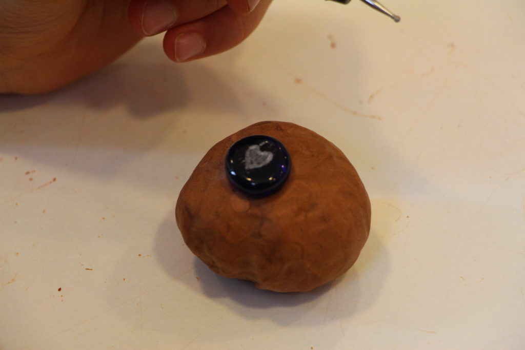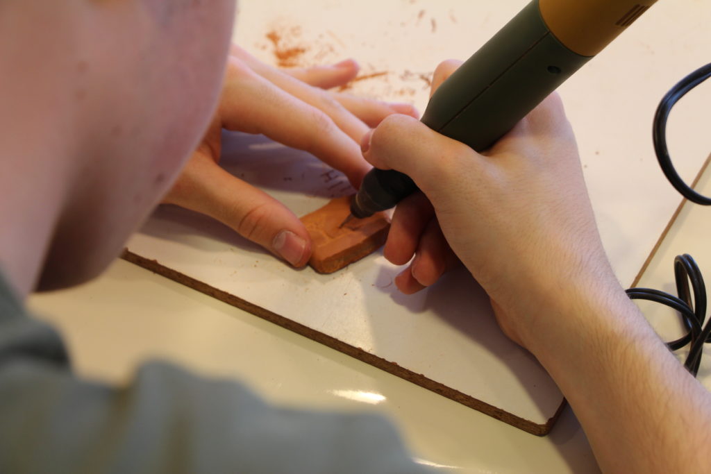 Zuerst haben wir an Tonscherben geübt, indem wir mit einem Bohrer Motive in die Scherben eingraviert haben. Als wir damit fertig waren, durfte sich jeder zwei bunte Glassteine aussuchen. Da sie sehr klein waren, mussten wir sie mit der gewölbten Seite leicht in eine Knetmasse drücken. Wir haben beliebige Motive in die Steine geschnitten. Nach dem Aufräumen haben wir kleine Tüten bekommen, um die Steine sicher zu transportieren.