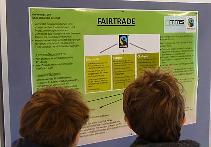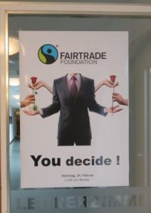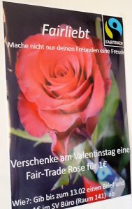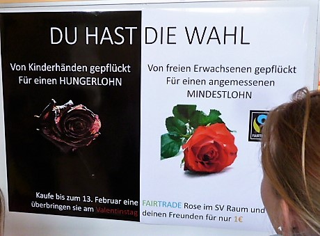 Zuvor hatte sich die Klasse Ea im Wirtschaft/Politik-Unterricht mit den Produktionsbedingungen herkömmlich gezogener Rosen und denen, die mit dem Fairtrade-Siegel ausgezeichnet werden, beschäftigt. Welche ökonomischen, sozialen und ökologischen Kriterien erfüllt sein müssen, damit Produkte das Fairtrade-Zertifikat erhalten können, veranschaulichte eine Schülergruppe auf einem Informationsposter, das im Vorfeld der Valentinstagsaktion die Schülerinnen und Schüler über die Hintergründe aufklären sollte.