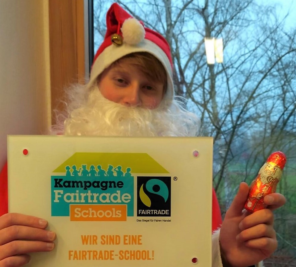 In der Woche vor Weihnachten überbrachten Weihnachtsmann Simon und Christkind Janna von der SV Weihnachtsgrüße im Auftrag von Schülern an Schüler, ergänzt um Schokoladennikoläuse, die aus fair gehandeltem Kakao produziert worden waren.