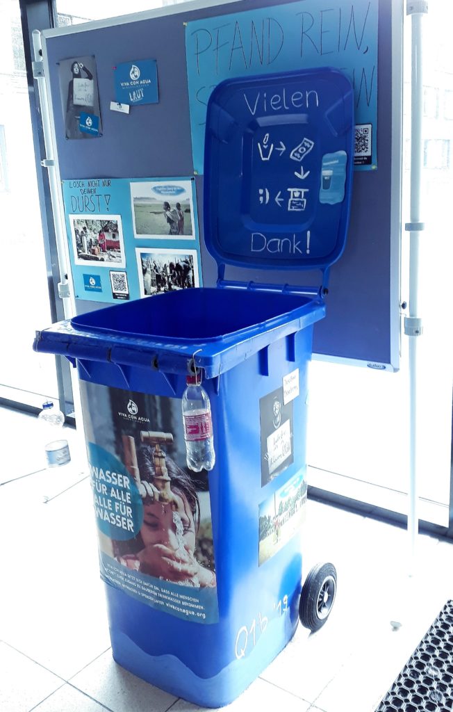 „Wir wollen die Welt heute ein bisschen besser machen!“, war das Motto des Tages. Die Aufgabe für die Klasse bestand darin, Infoplakate und ein Werbevideo zu erstellen sowie eine blaue Mülltonne zu gestalten, um die Schülerinnen und Schüler der TMS zu animieren, ihre Pfandflaschen für „Viva Con Agua“ zu spenden.