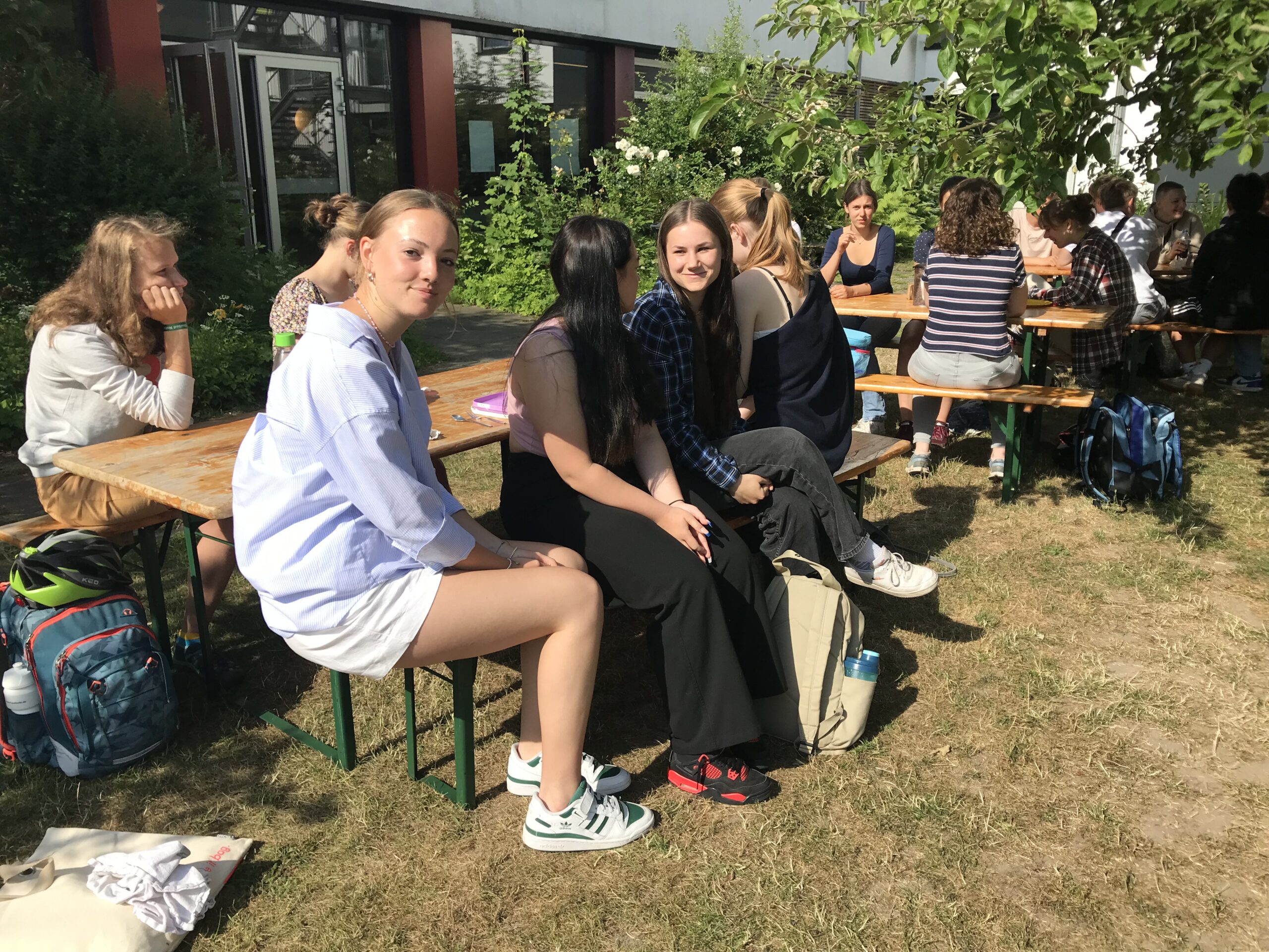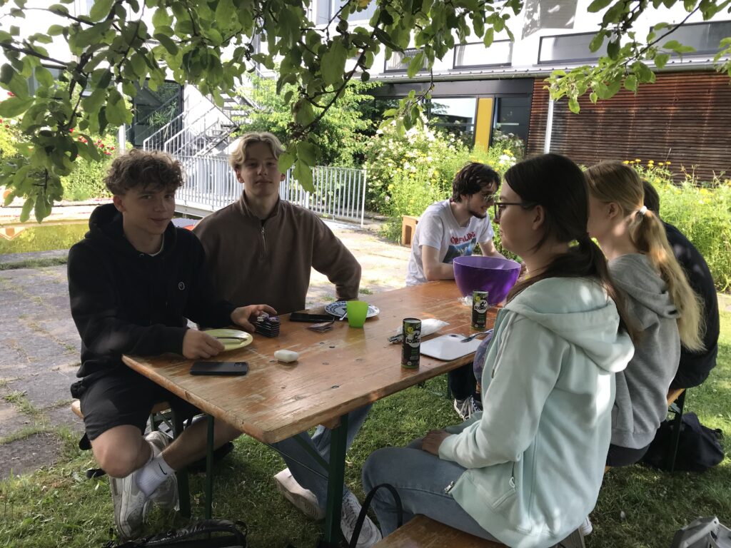 Zwei Klassen des E-Jahrgangs stiegen in den Tag mit einem Frühstück im Innenhof ein mit Produkten aus fairem Handel.