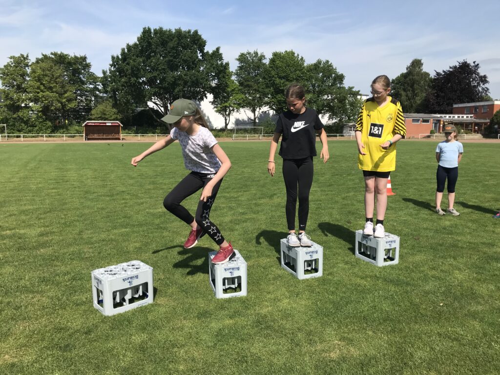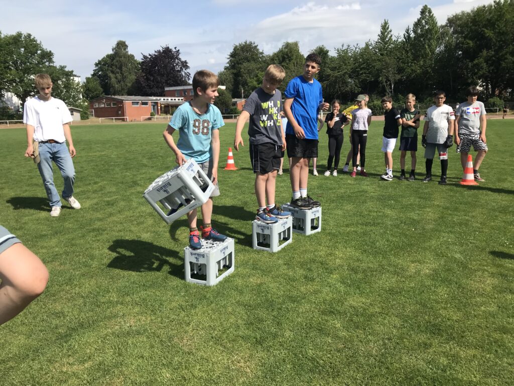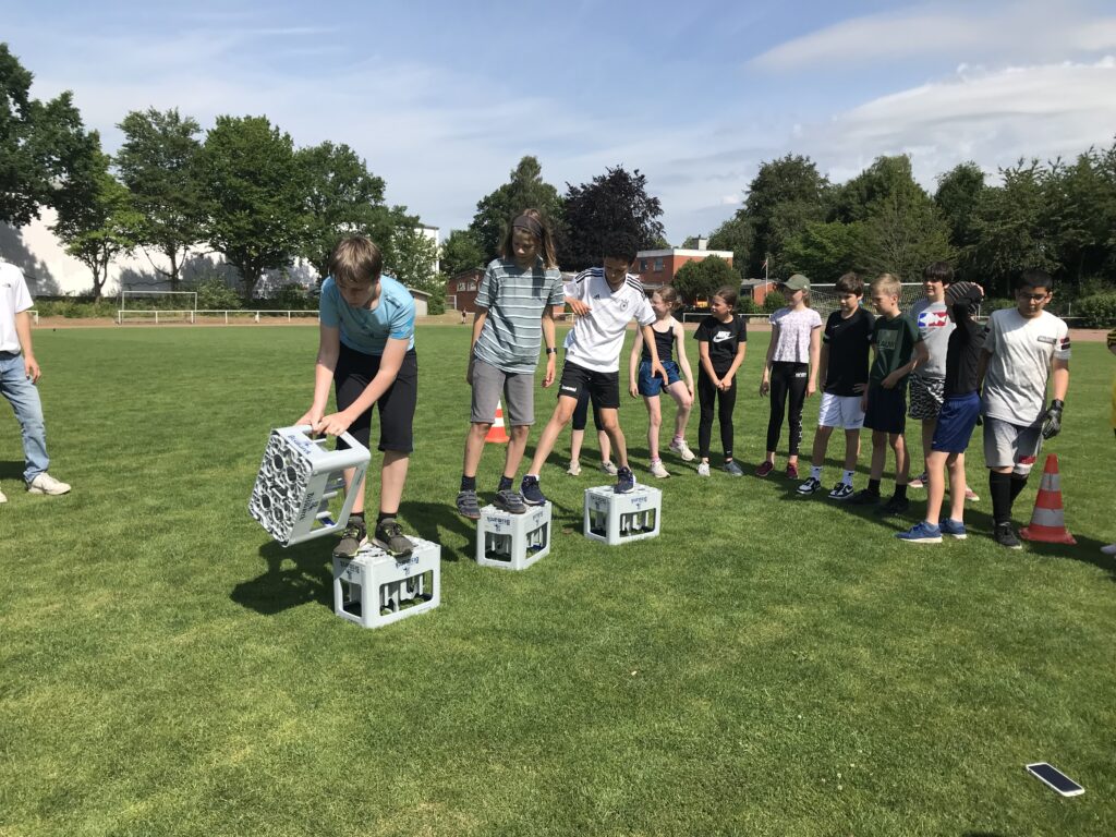 Zwischen den Spielen mussten die Klassen Aufgaben bewältigen, bei denen es um Zusammenhalt und Kooperation ging. Welche Lerngruppe schafft es, die meisten Schüler mit Getränkekisten auf die andere Seite zu bringen? Die Klasse 5d bewies ihre gute Klassengemeinschaft. Durch die gute Abstimmung untereinander konnte sie die Herausforderung erfolgreich bewältigen.