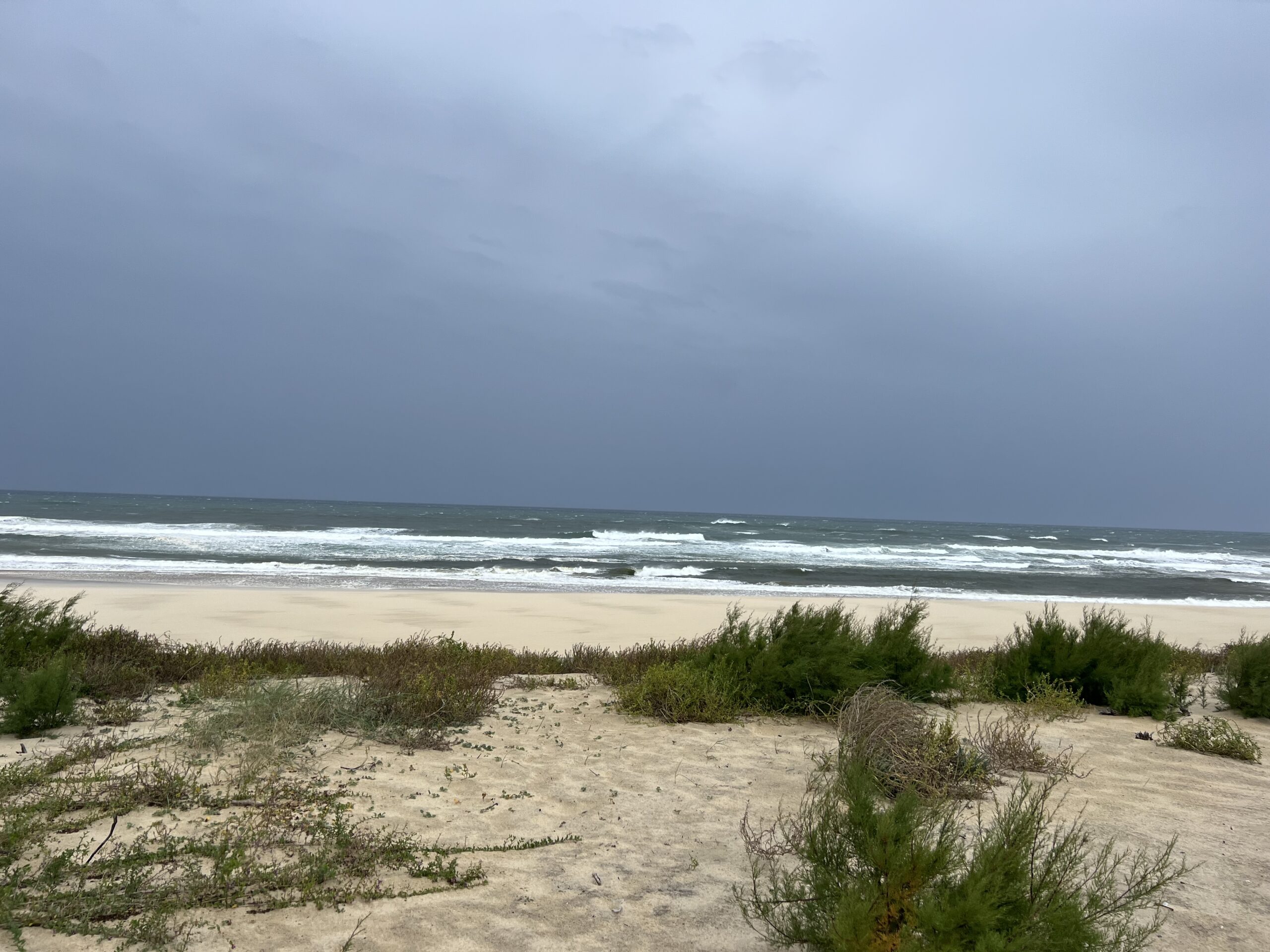 Von dort aus sind wir in Richtung Meer gegangen. Als wir am Strand angekommen sind, fing es wieder sehr stark an zu regnen. Der Wind war unten am Strand so unfassbar stark, dass man sich in den Wind legen konnte, ohne umzukippen. Das war wirklich cool! Die Wellen waren auch riesig.