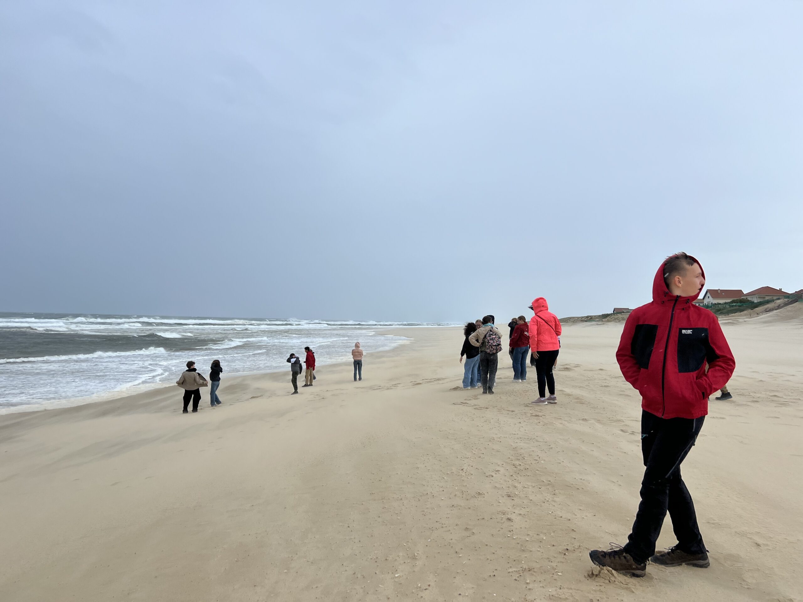 Am Mittwoch haben wir uns alle zusammen an der Schule getroffen. Als alle da waren, sind wir mit dem Bus in Richtung Atlantikküste gefahren. Noch sah es nach viel Sonne und gutem Wetter aus. Eigentlich hätten wir an dem Tag einen Rettungsschwimmerkurs machen wollen, der aber aufgrund des aufkommenden Sturms abgesagt wurde. Stattdessen sind wir zum Strand gefahren, die Lehrer hatten viele coole Spiele für uns vorbereitet. Wir waren an einem kleinen abgelegenen Strandabschnitt, zu dem Zeitpunkt war das Wetter noch gut.