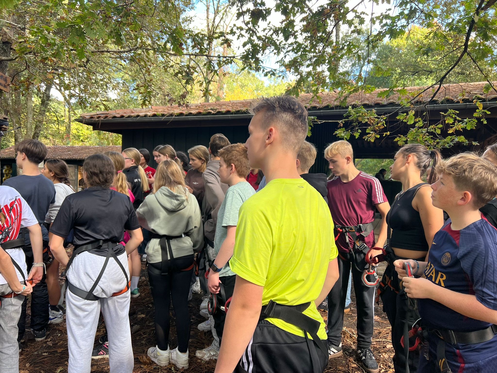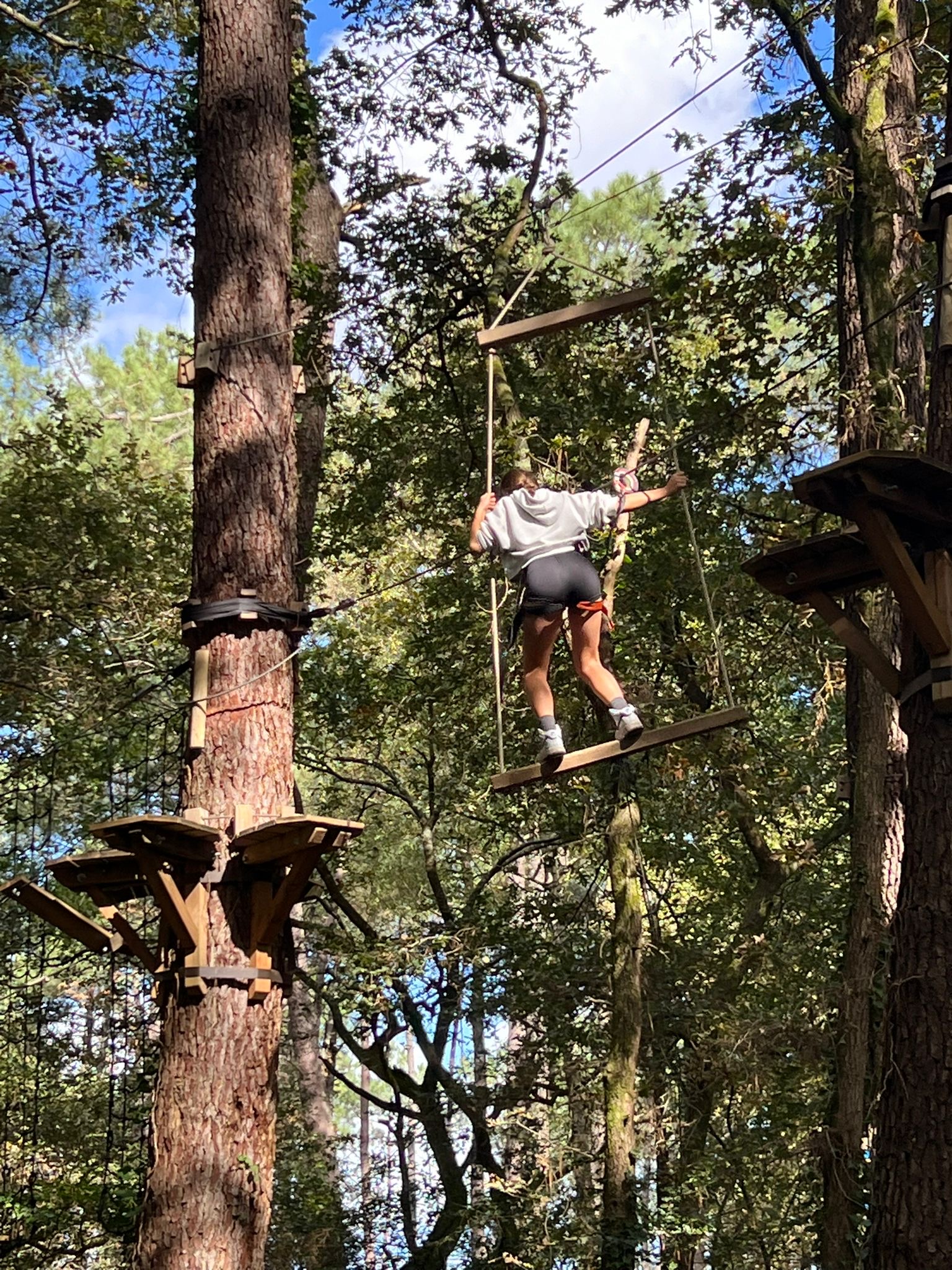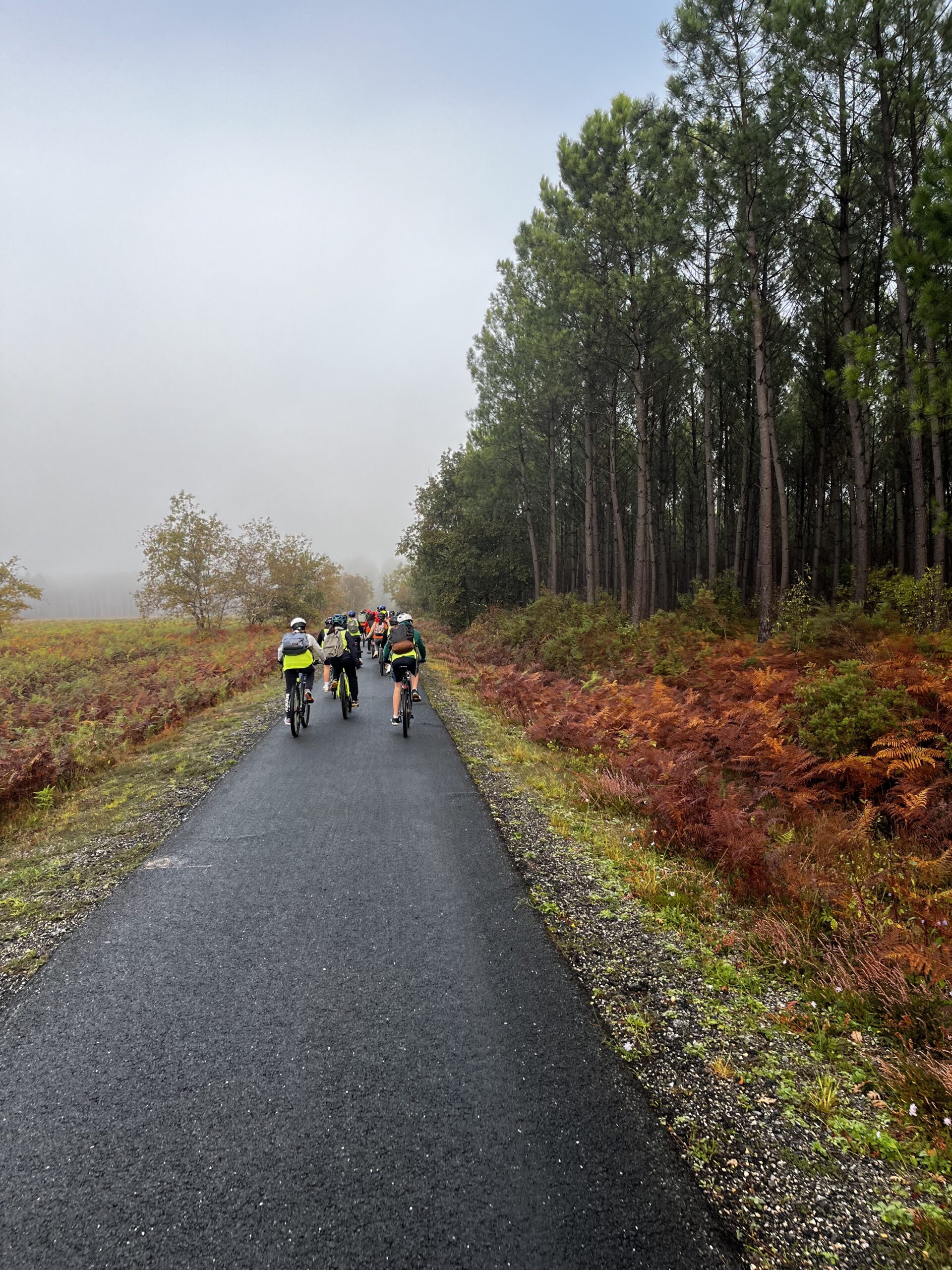 Heute stand die Fahrrad-Tour zum Kletterpark an,zu der wir gegen 8:45 Uhr starteten. Da einige von uns keine Fahrräder hatten, konnten wir uns in der Touristeninformation von Salles Fahrräder leihen. Als nun endlich alle Fahrräder hatten, konnten wir starten und den 10 km langen Weg zum Kletterpark von Mios bestreiten. Der Weg führte uns durch die Wälder und Wiesen zwischen Salles und Mios, der abwechselnd mit ein paar Häusern oder Straßen verziert war. Wir sind durch wunderschöne Waldlandschaften gefahren, die Teils noch vom morgendlichen Nebel durchzogen waren.