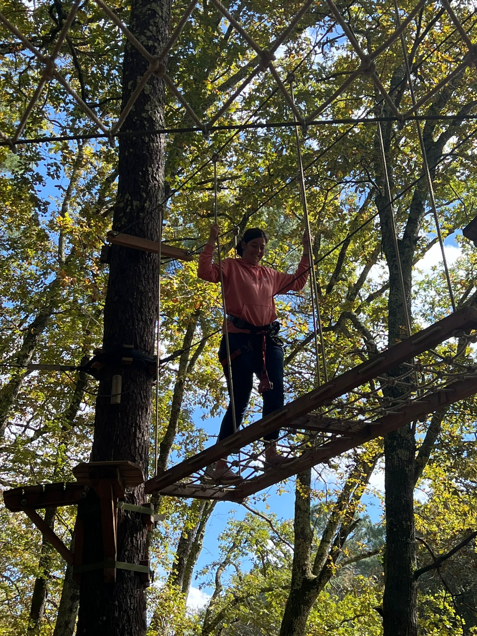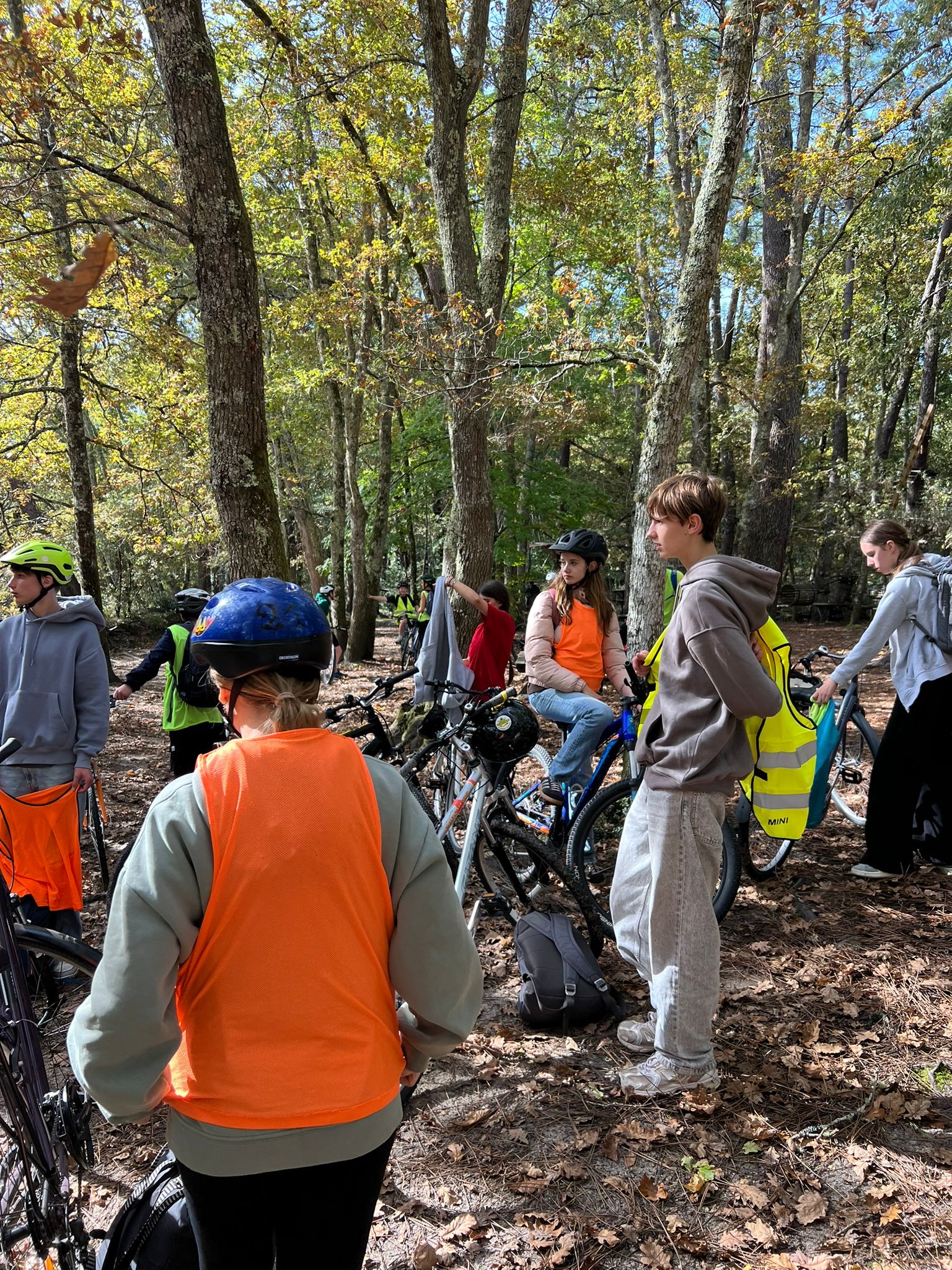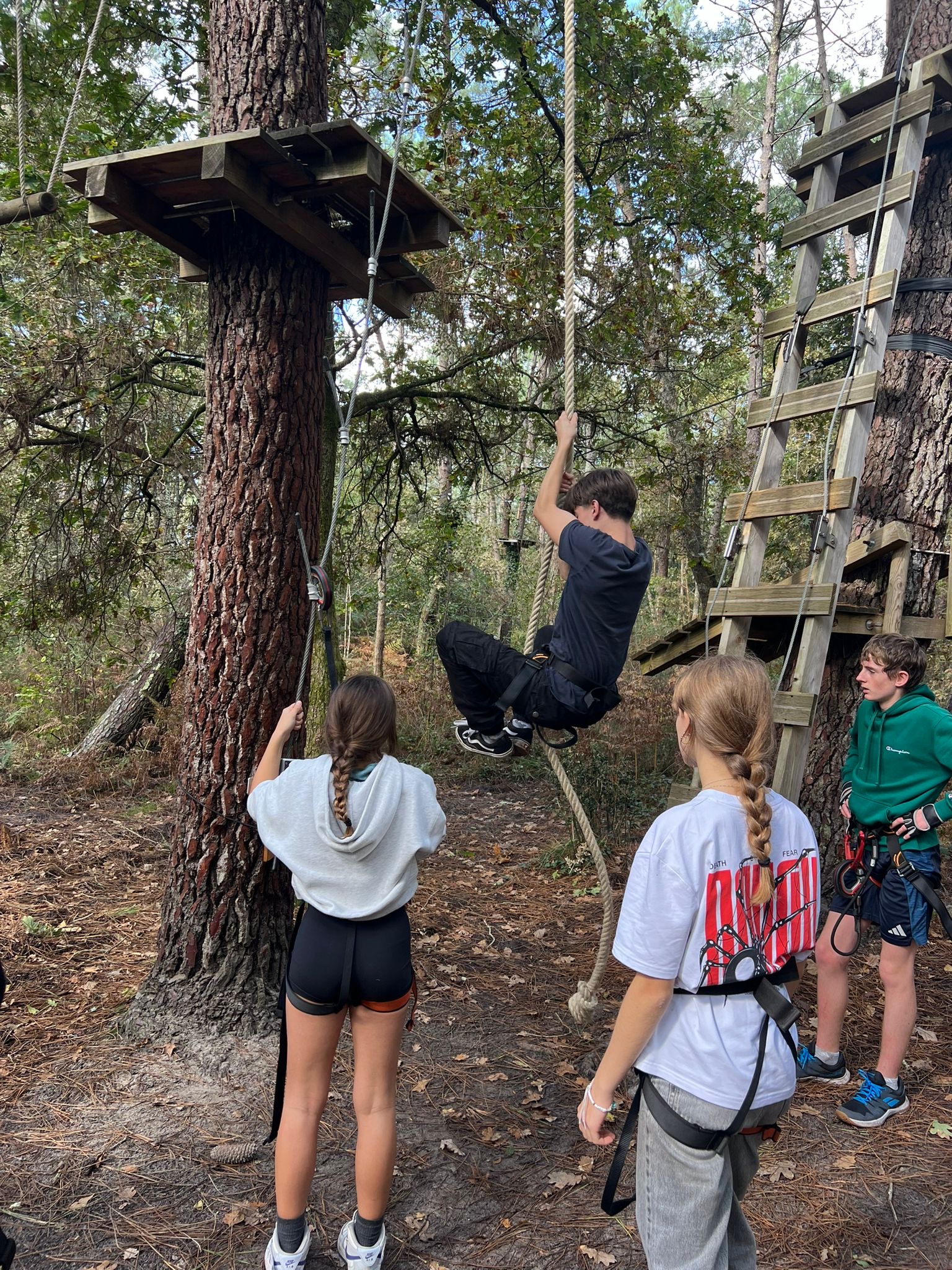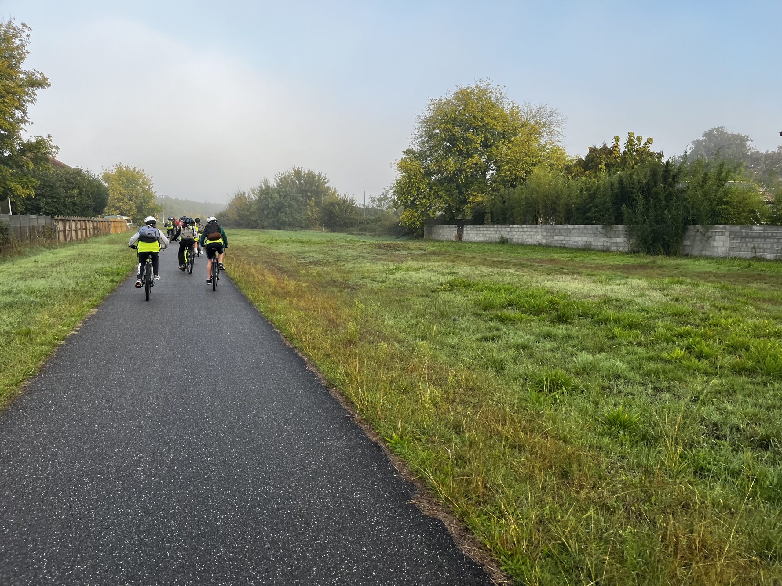 Heute stand die Fahrrad-Tour zum Kletterpark an,zu der wir gegen 8:45 Uhr starteten. Da einige von uns keine Fahrräder hatten, konnten wir uns in der Touristeninformation von Salles Fahrräder leihen. Als nun endlich alle Fahrräder hatten, konnten wir starten und den 10 km langen Weg zum Kletterpark von Mios bestreiten. Der Weg führte uns durch die Wälder und Wiesen zwischen Salles und Mios, der abwechselnd mit ein paar Häusern oder Straßen verziert war. Wir sind durch wunderschöne Waldlandschaften gefahren, die Teils noch vom morgendlichen Nebel durchzogen waren.