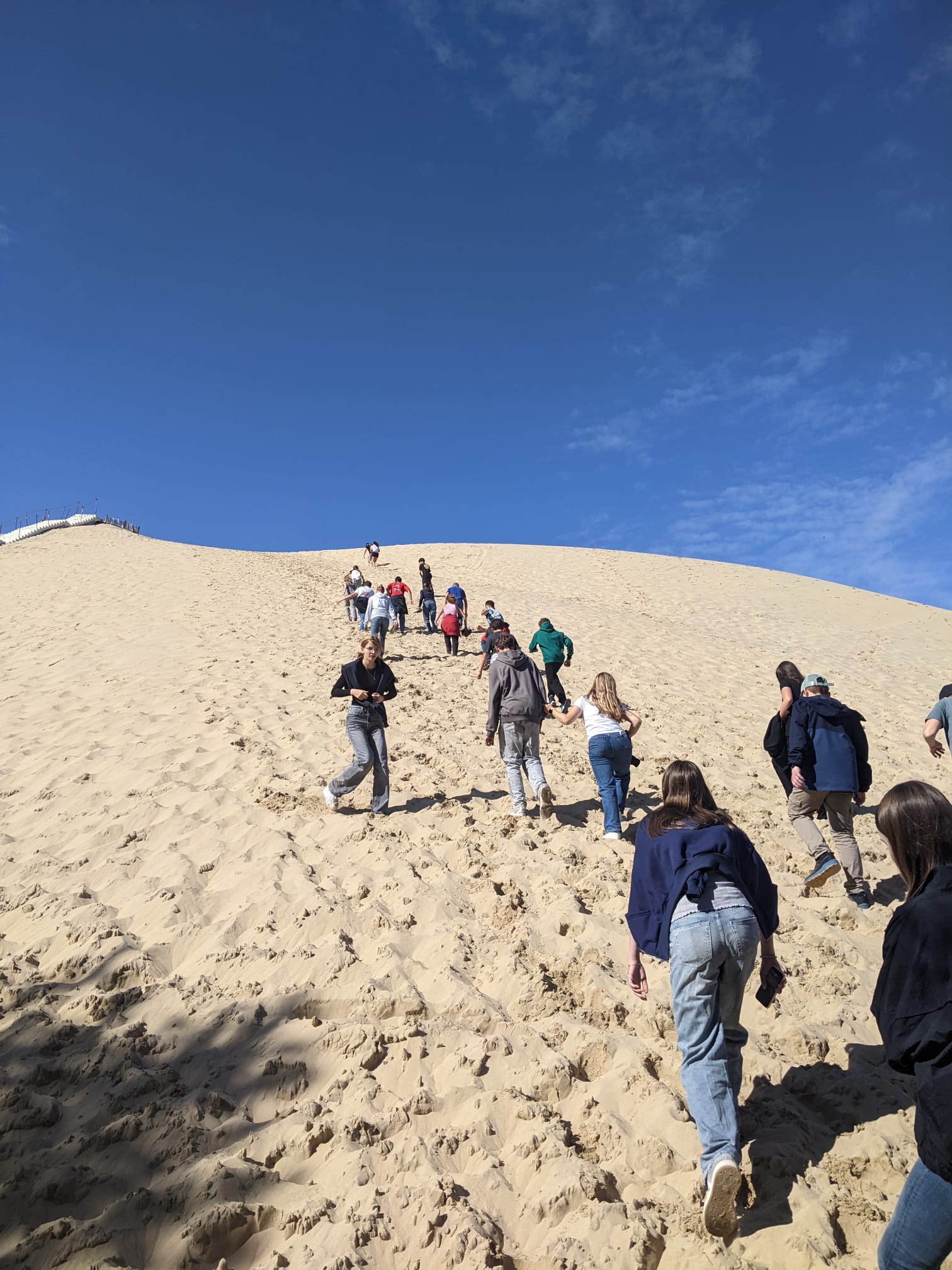 Danach sind alle für 2 Stunden in den Unterricht gegangen (die meisten mit ihren Austauschpartnern), eine Schulstunde hat 55 min und eine Pause 20 min. Nach den zwei Schulstunden haben wir dort in der Schule Mittag gegessen. Das Essen ist ein wenig gewöhnungsbedürftig gewesen, aber wir sind alle satt geworden. Nach dem Essen wurden wir von einem Bus abgeholt und sind zu der „Dune du Pilat“ gefahren. Dort sind wir spazieren gegangen. Die Dune ist wunderschön und hat uns alle sehr beeindruckt.