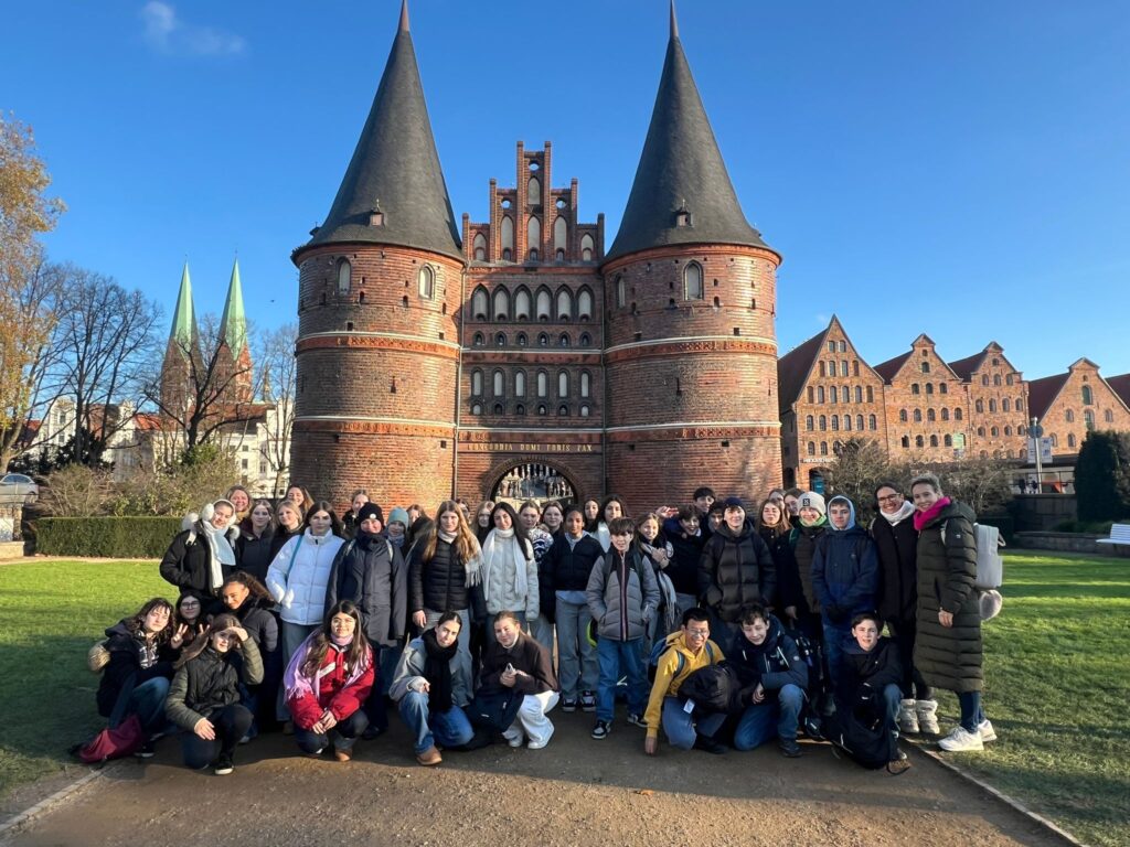 Bereits zum 3. Mal war es nun wieder soweit und 20 Schülerinnen und Schüler aus den 8.Klassen konnten ihre französischen Austauschpartner:innen aus Salles (in der Nähe von Bordeaux in Frankreich) in Empfang nehmen und gemeinsam eine wunderschöne Winterwoche in Lübeck verbringen. Vorausgegangen war ein halbes Jahr intensive sprachliche und interkulturelle Vorbereitung. Jede Woche kamen die Teilnehmer:innen in der Französisch-AG zusammen und übten unter Leitung von Frau Rüder und Frau Kulbach in kleinen Dialogen, wie man sich auf Französisch in typischen Austauschsituationen (z.B. zuhause am Tisch oder während der Aktivitäten) verständigen kann. Bereits vor der Ankunft waren alle über Briefe und soziale Netzwerke in regelmäßigem Kontakt. Trotzdem waren alle sehr gespannt, ihre Austauschpartner:innen nun richtig kennenzulernen und mit ihnen eine Woche in Lübeck zu verbringen. Finanziert und möglich gemacht wurde dies durch das Erasmus+ EU-Förderprogramm.