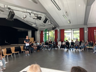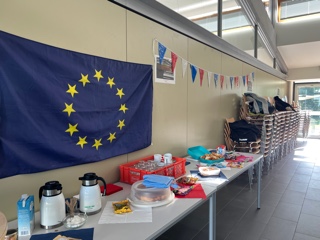 Am Dienstagmorgen haben wir uns dann alle um 8:30 Uhr in der Aula getroffen und unsere mitgebrachten Süßigkeiten auf zwei Tischen verteilt. Nachdem wir dann den Stuhlkreis fertig aufgebaut hatten, haben Frau Rüder, Frau Kulbach, eine Lehrerin aus Frankreich und Herr Rother eine kleine Rede gehalten.